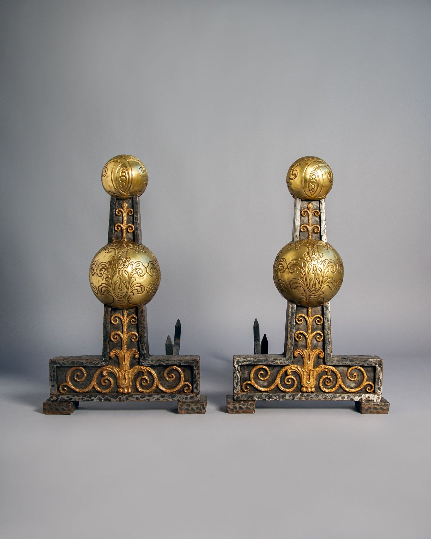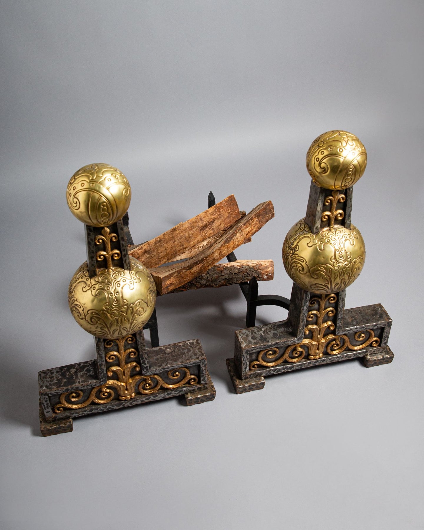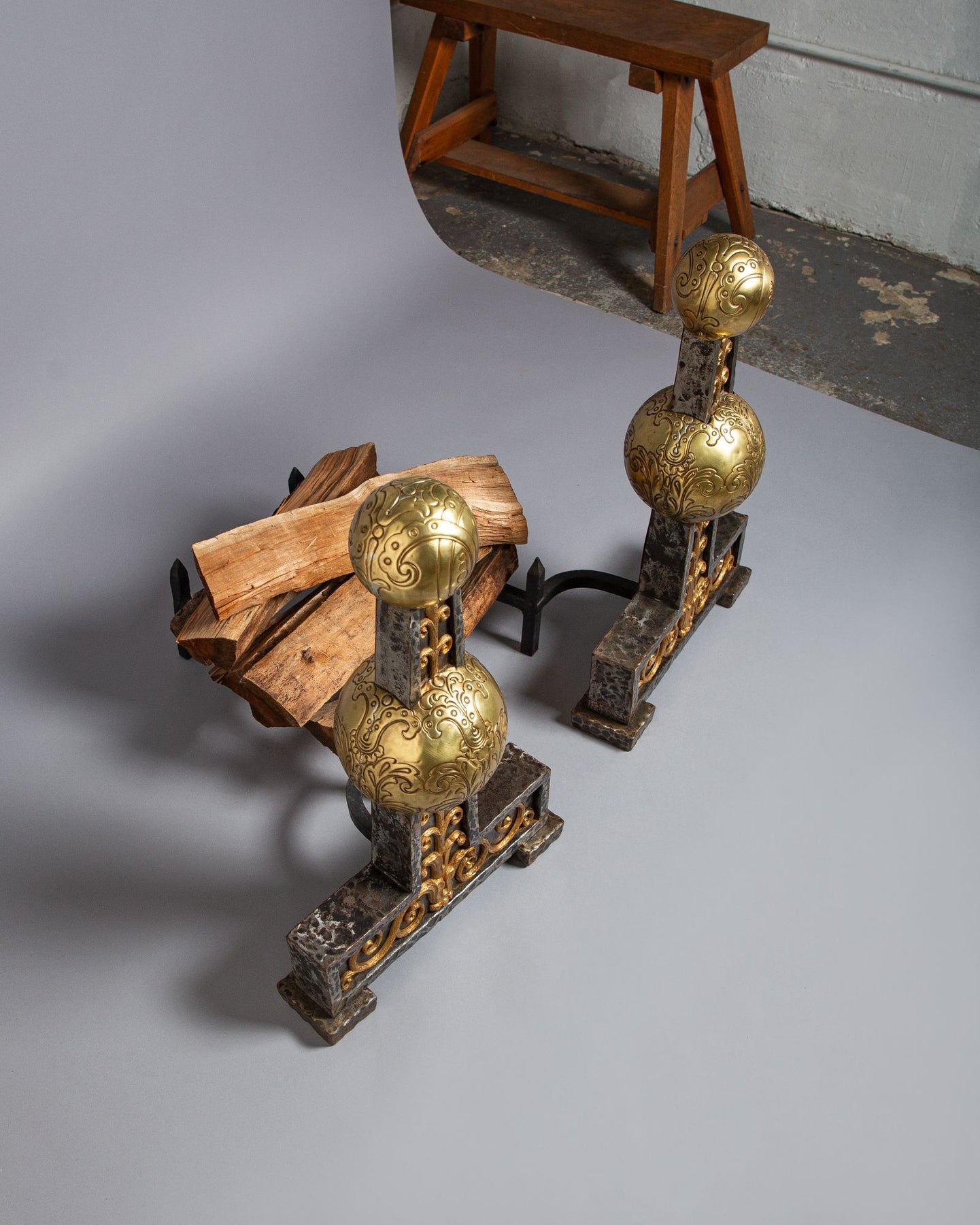 A pair of unusual antique Art Deco period andirons with muscular proportions executed in chiseled and stamped sheet steel mounted with arabesque-patterned repousse balls and cast bronze fountain appliques.