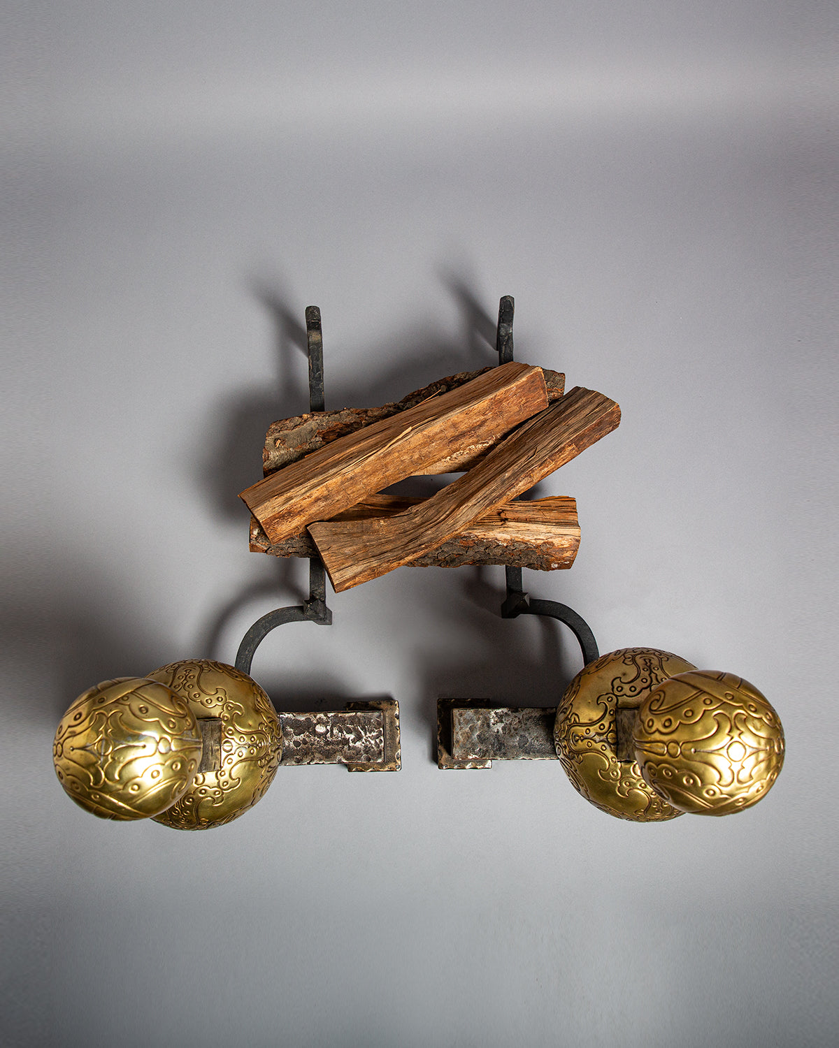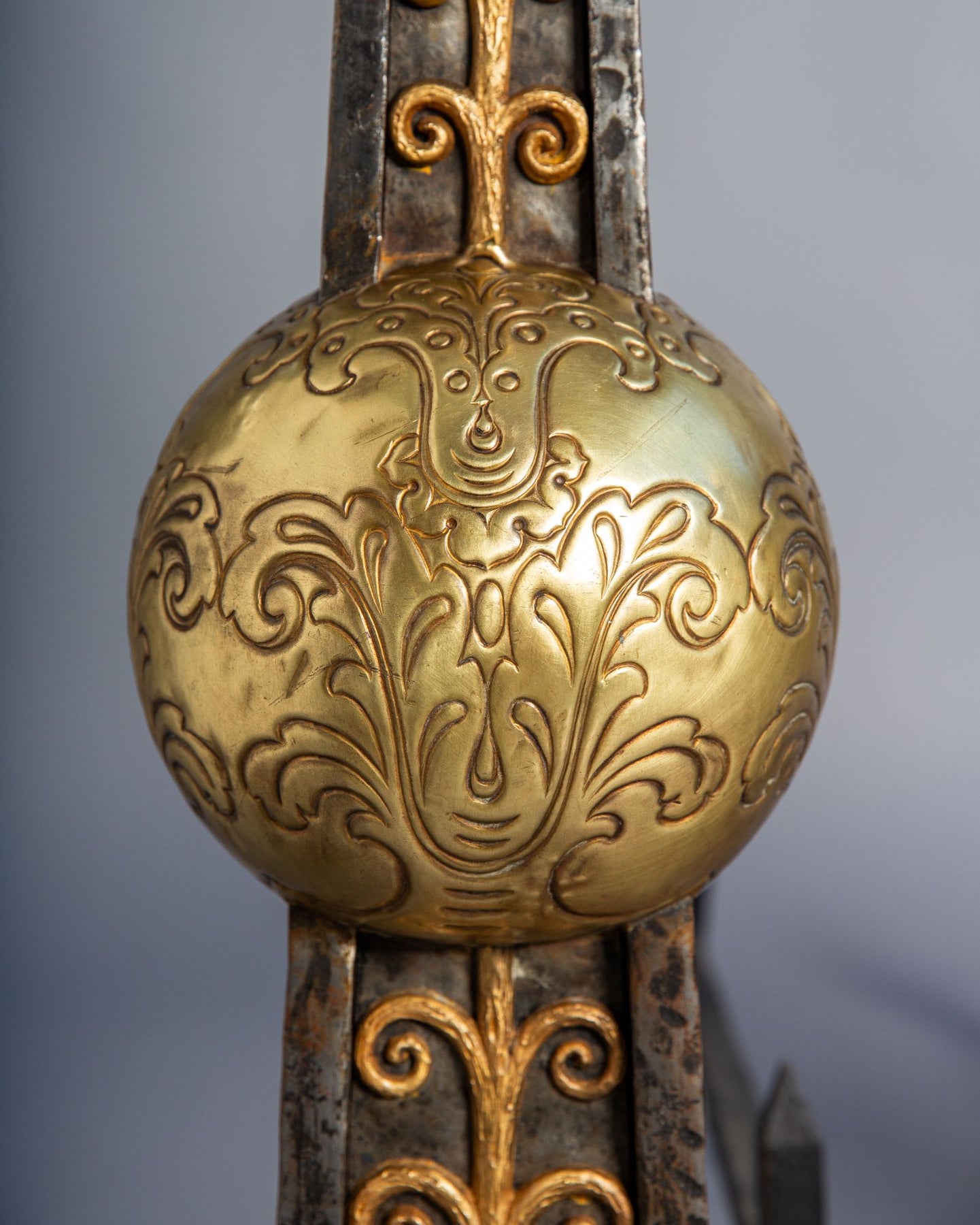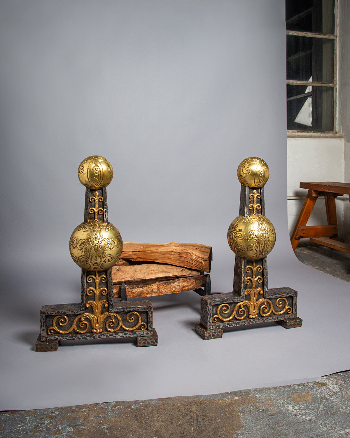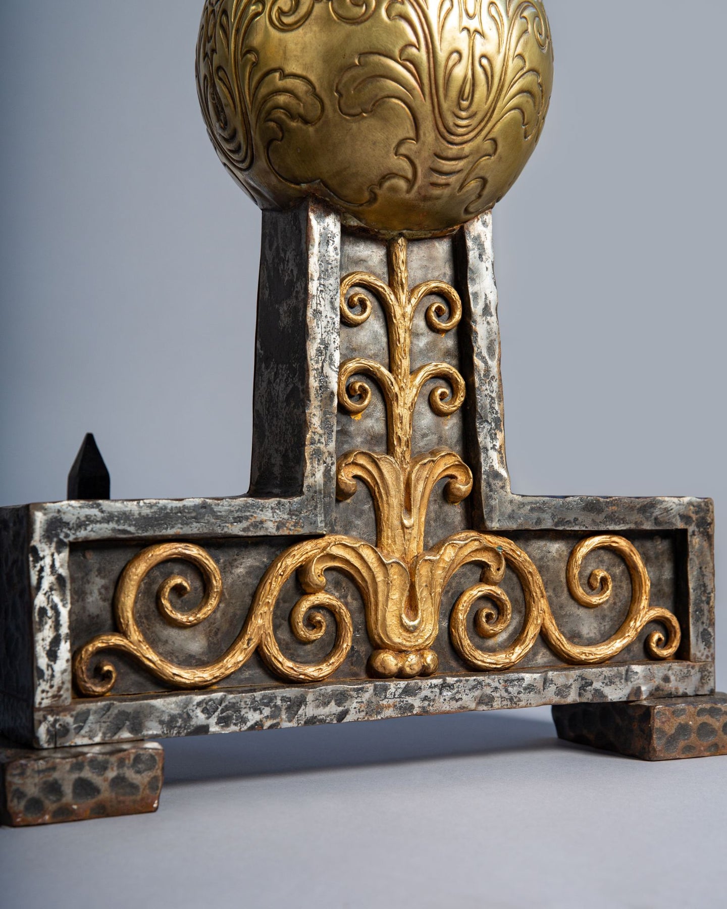 A pair of unusual antique Art Deco period andirons with muscular proportions executed in chiseled and stamped sheet steel mounted with arabesque-patterned repousse balls and cast bronze fountain appliques.