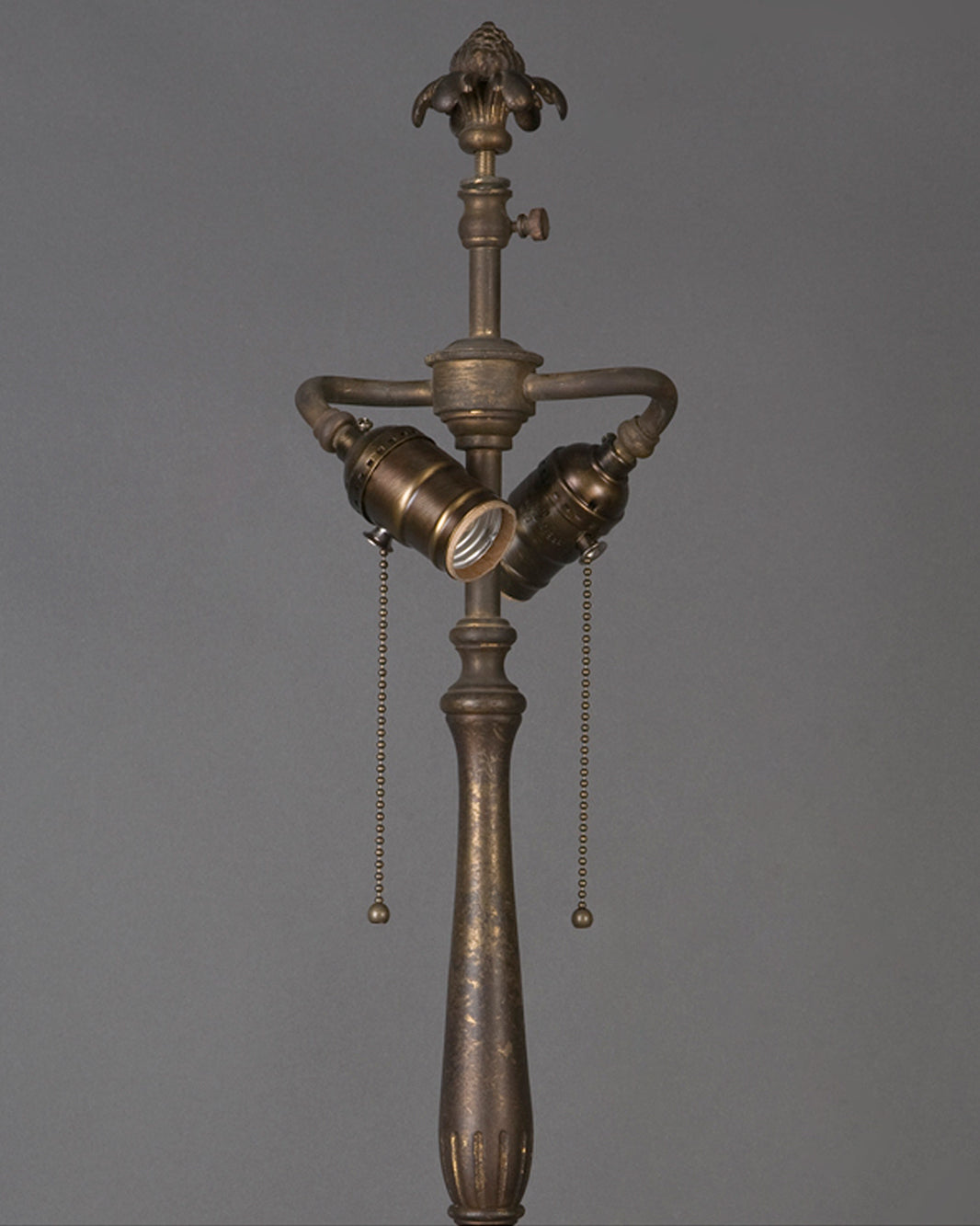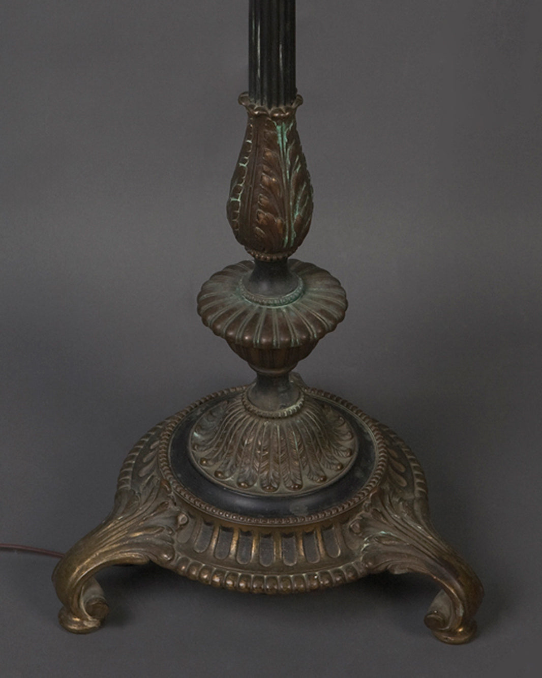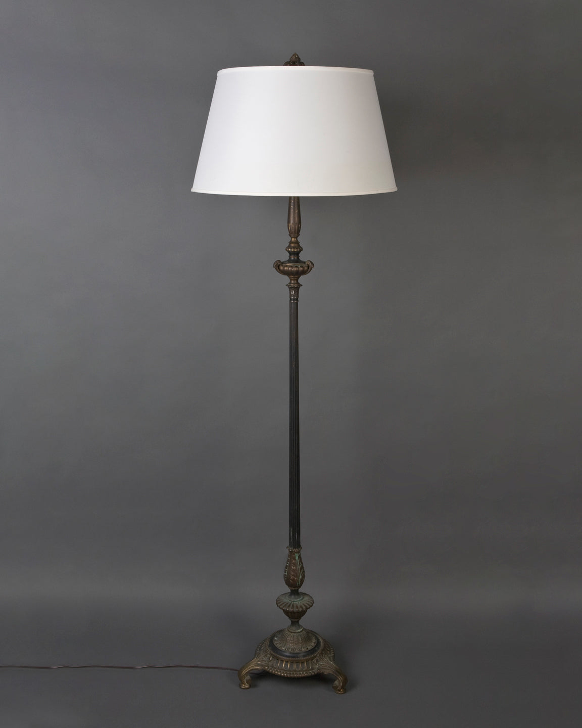 From the Remains Archive. An antique floor lamp on a tripod base, having its original partial gilt and darkened bronze finish, with reeded and foliate details. Signed by the English maker Best and Lloyd. Our Archive Collection consists of the best examples of previous custom projects & historic fixtures from our collection. They are made available as inspiration for recreation or inclusion in custom projects.