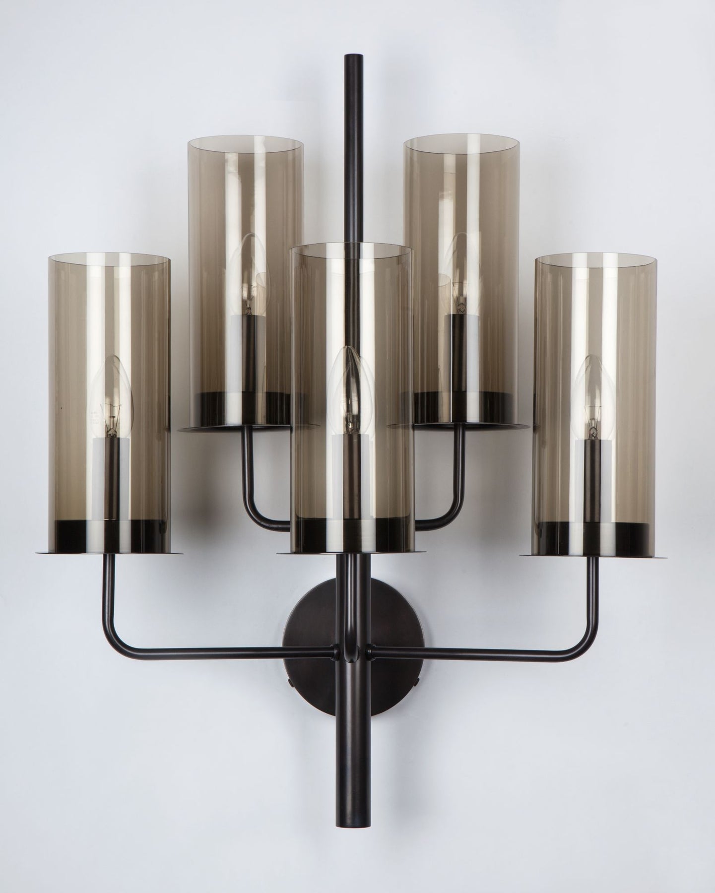 From the Remains Archive. A blackened brass and champagne glass five-light sconce with two tiers of arms. Reproduced from a 1960s Italian original for an Abu Dhabi residential project. Our Archive Collection consists of the best examples of previous custom projects & historic fixtures from our collection. They are made available as inspiration for recreation or inclusion in custom projects.