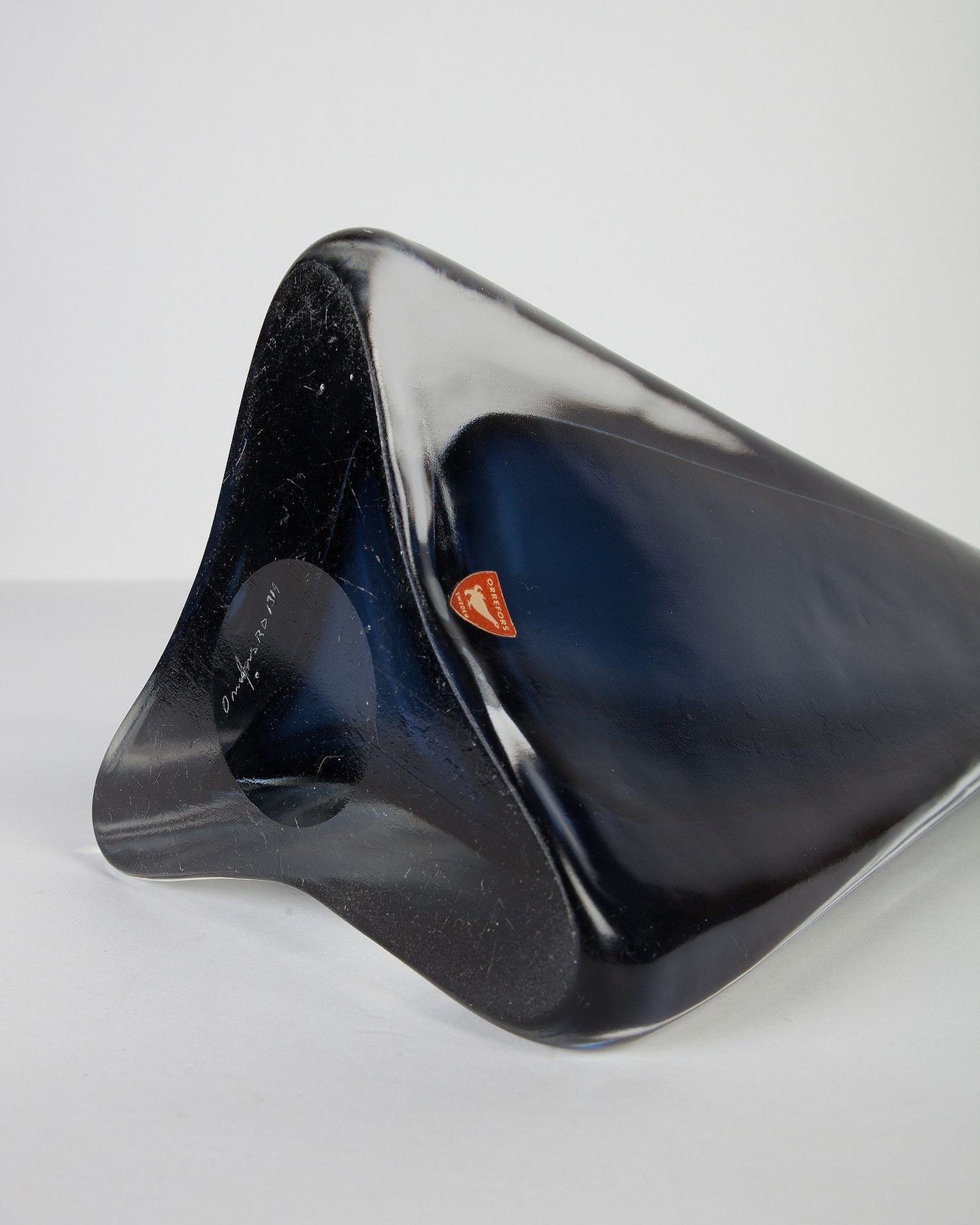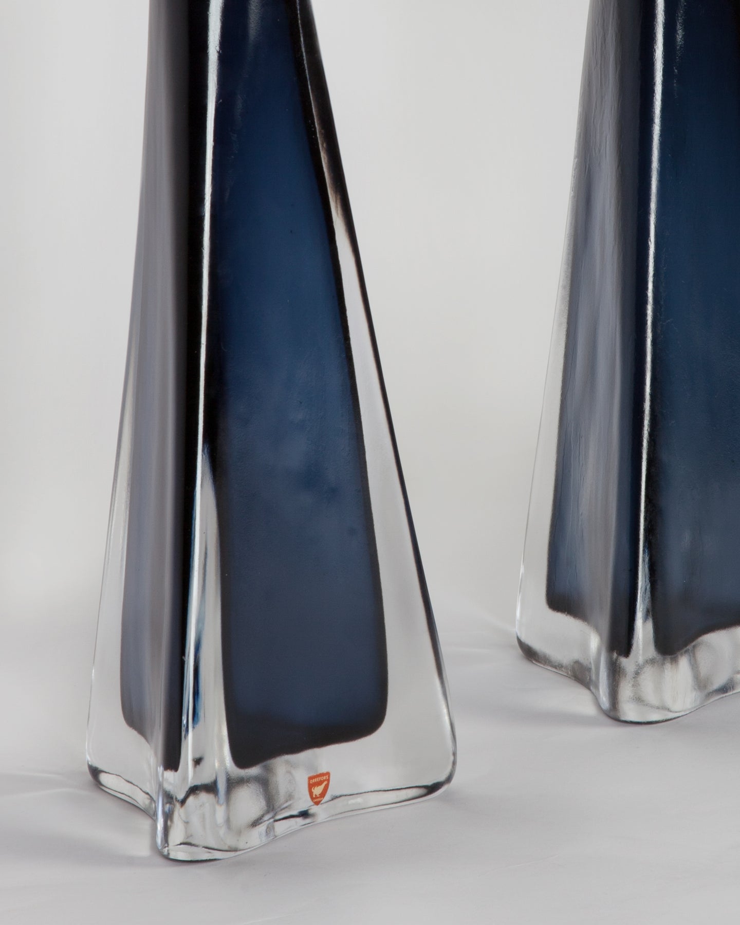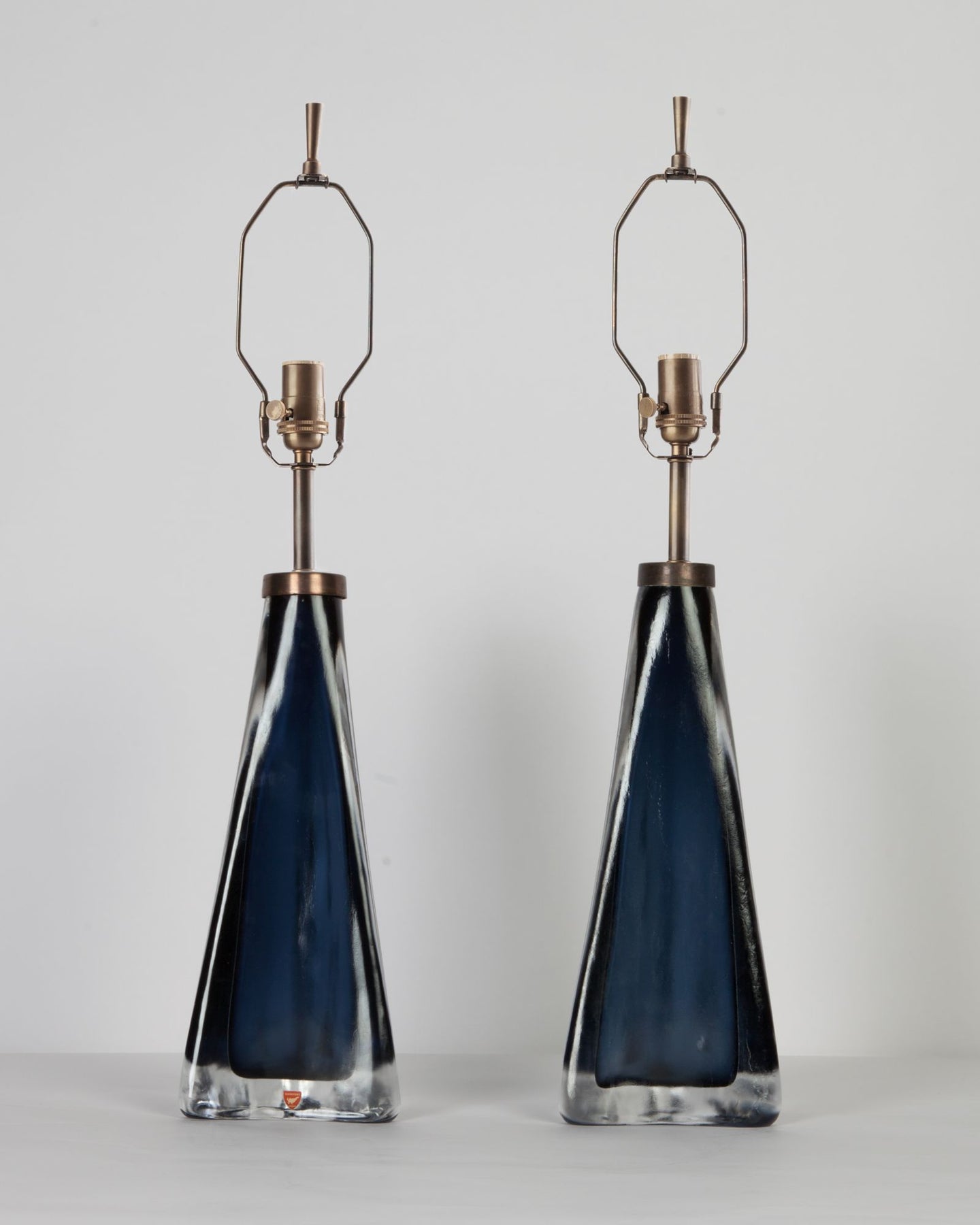 From the Remains Archive. A pair of deep blue glass table lamps with aged brass fittings signed by Carl Fagerlund for the Swedish glassmaker Orrefors. Our Archive Collection consists of the best examples of previous custom projects & historic fixtures from our collection. They are made available as inspiration for recreation or inclusion in custom projects.