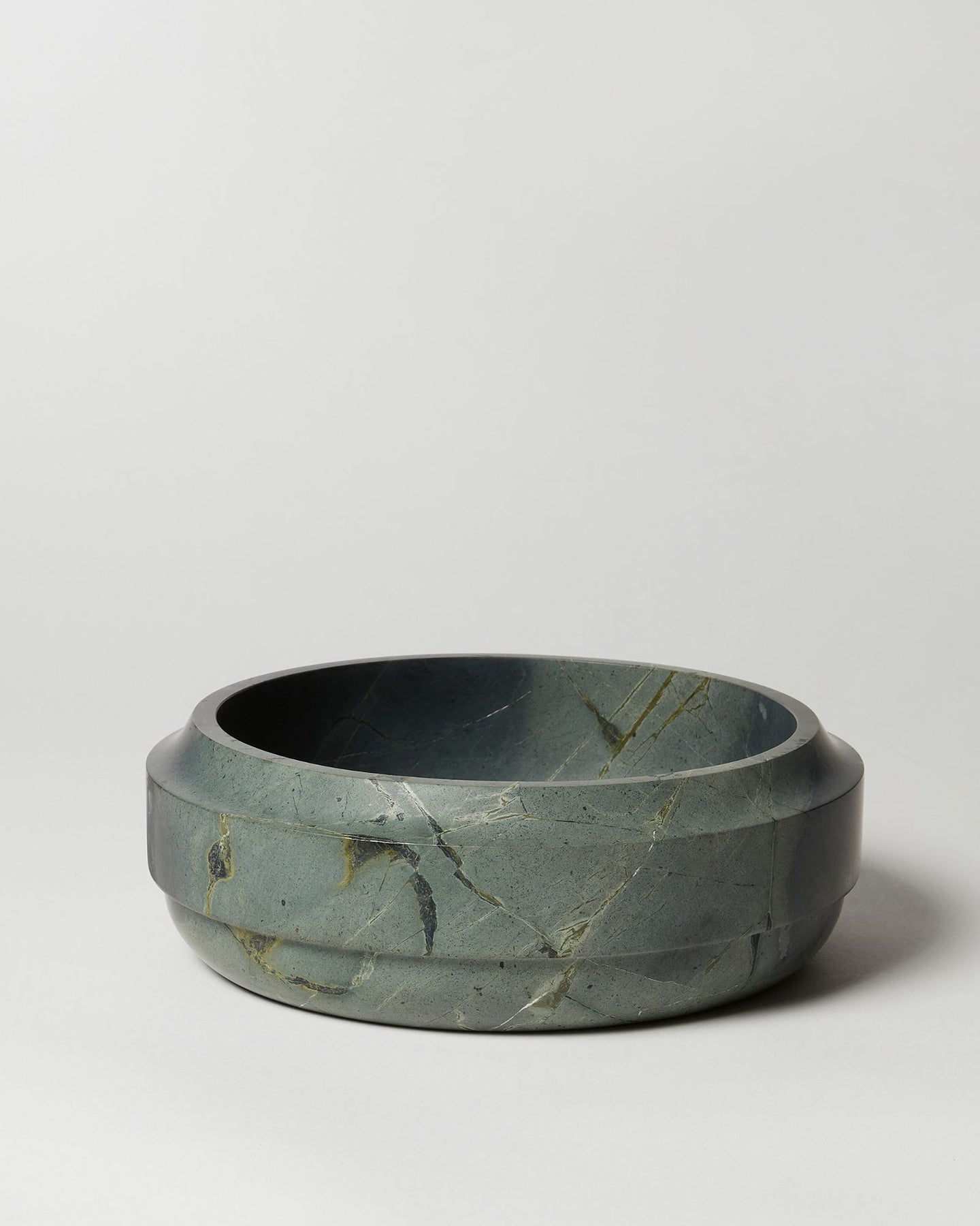 Sitting softly upon an elongated, curved base, the column of the object terminates at a lip detailed to catch light. The work is a modern representation of ancient Roman aqueduct segments.