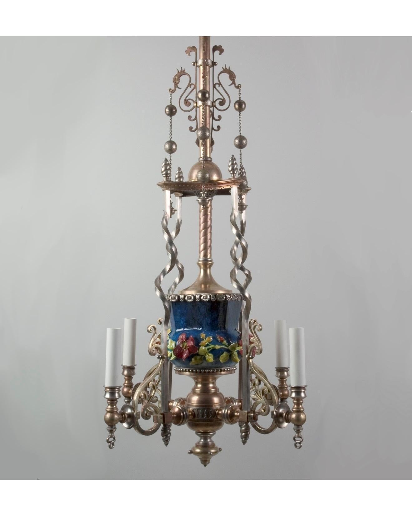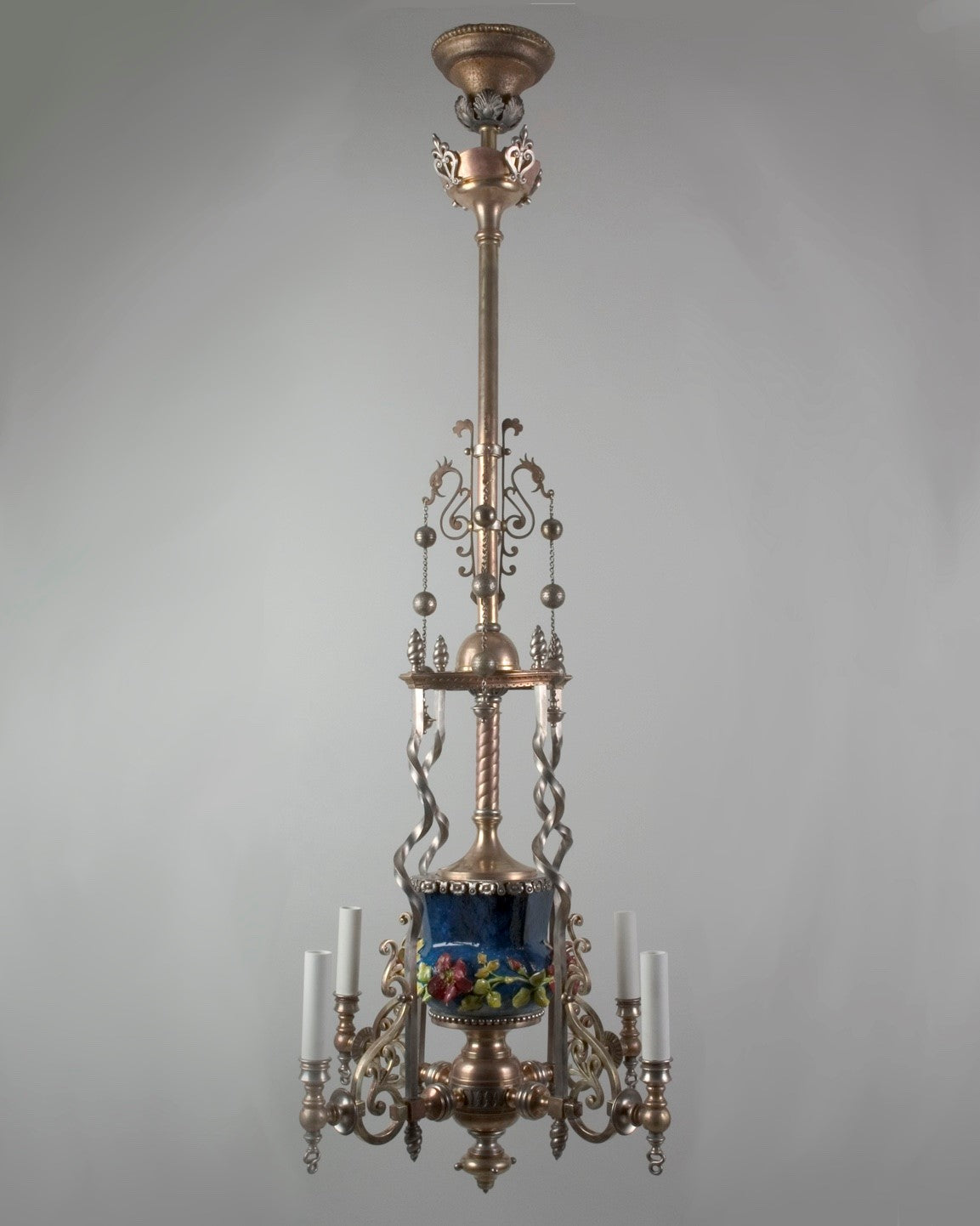 From the Remains Archive. A four-light antique chandelier in the moorish revival style, originally gas, now converted to electricity. The highly-detailed, handworked metal frame is finished in nickel over brass. The central stem holds a beautiful polychrome ceramic urn. Our Archive Collection consists of the best examples of previous custom projects & historic fixtures from our collection. They are made available as inspiration for recreation or inclusion in custom projects.