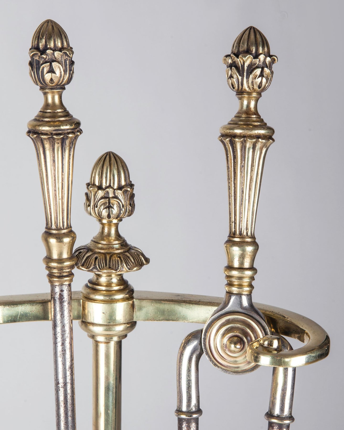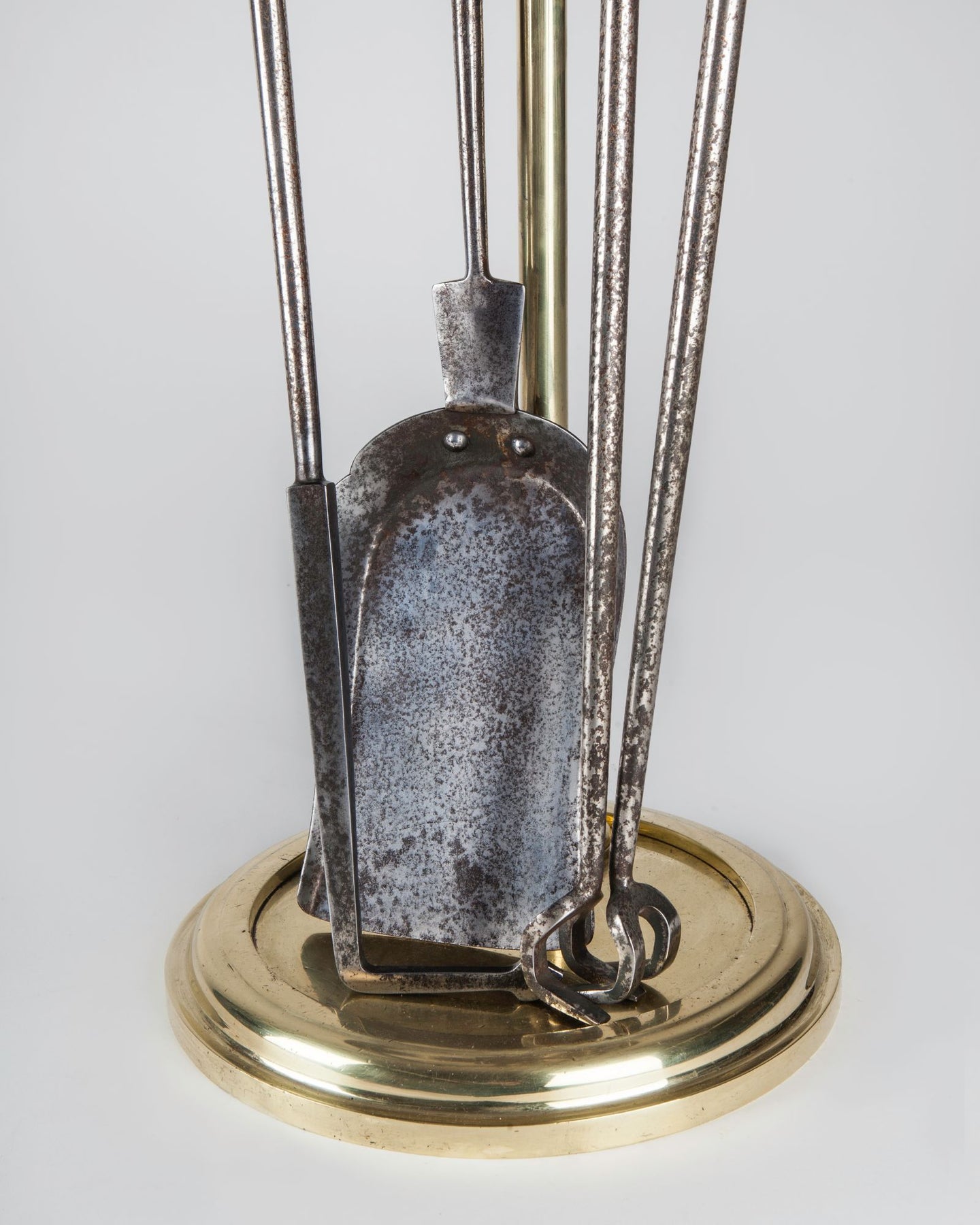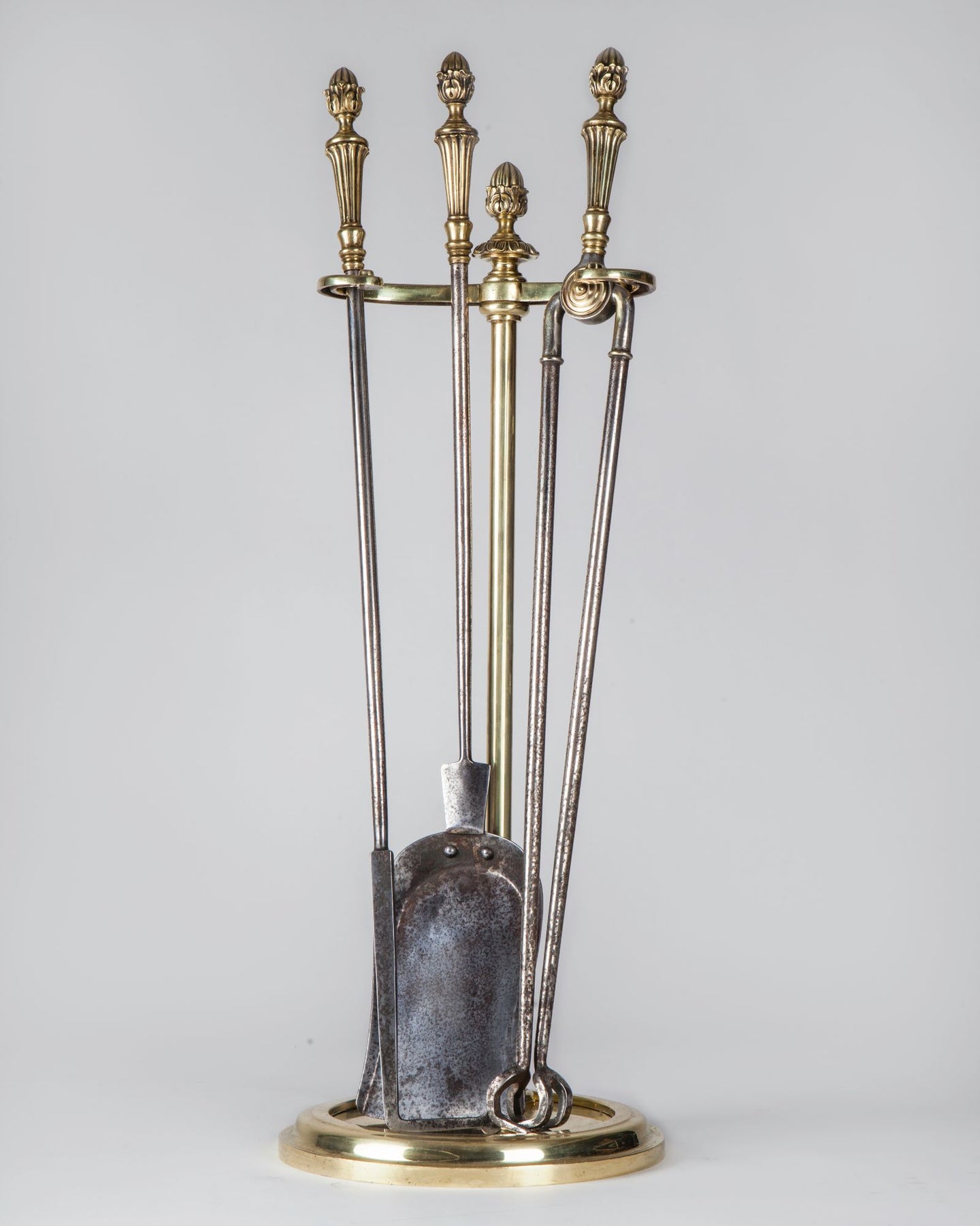 From the Remains Archive. A set of vintage fireplace tools and stand with wrought iron ends and cast brass pinecone finials, all in an aged polished finish. Attributed to the maker Sterling Bronze Co. Our Archive Collection consists of the best examples of previous custom projects & historic fixtures from our collection. They are made available as inspiration for recreation or inclusion in custom projects.