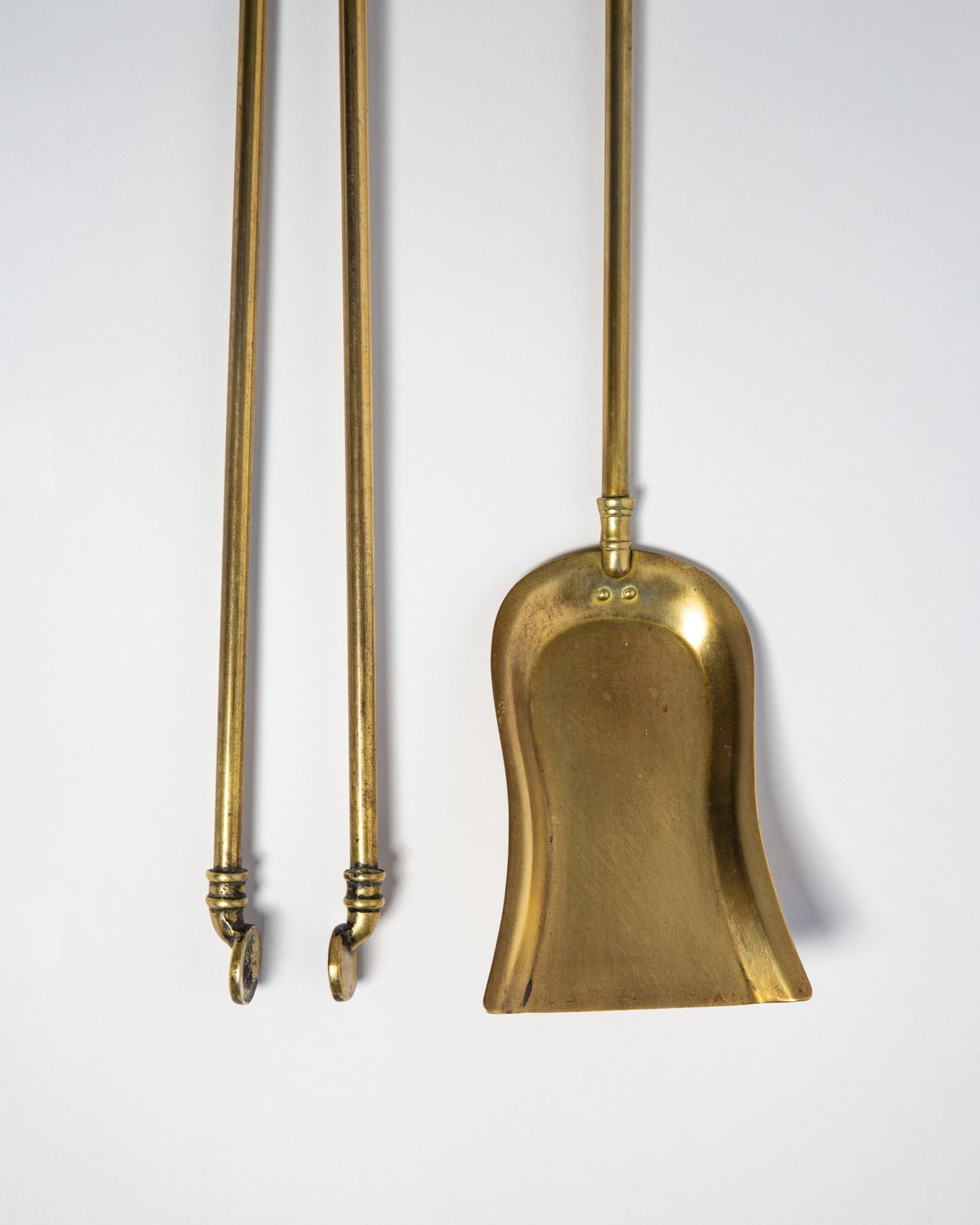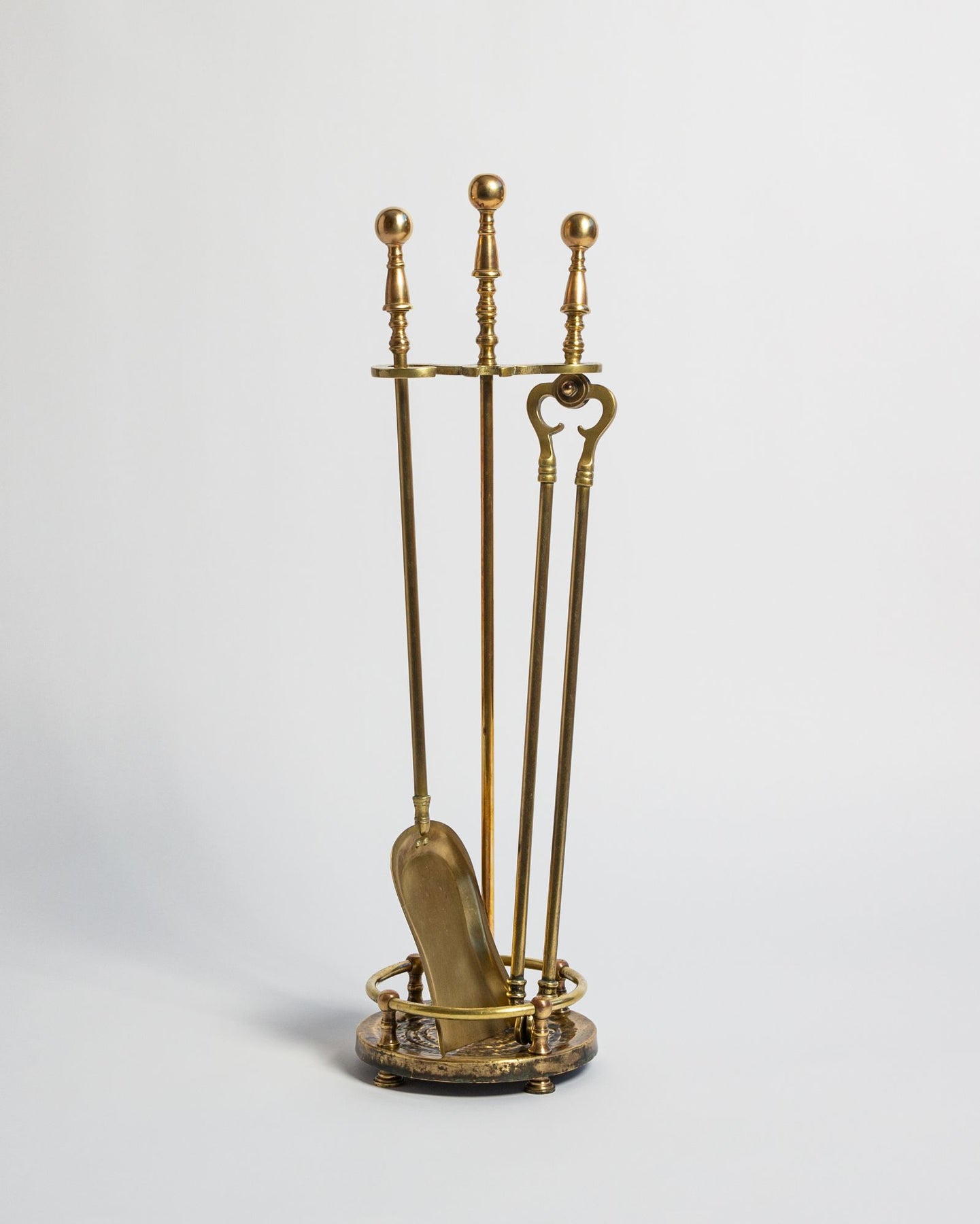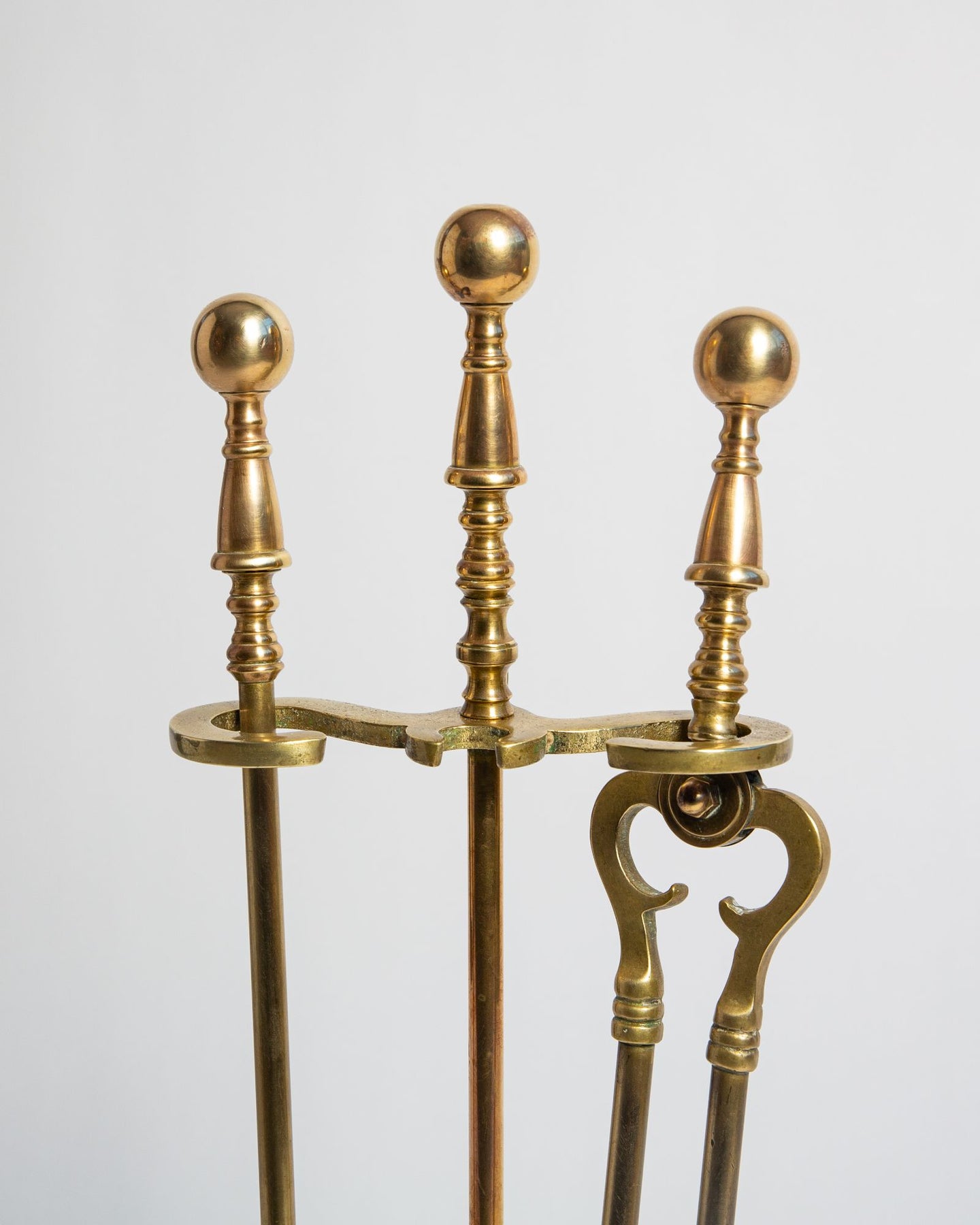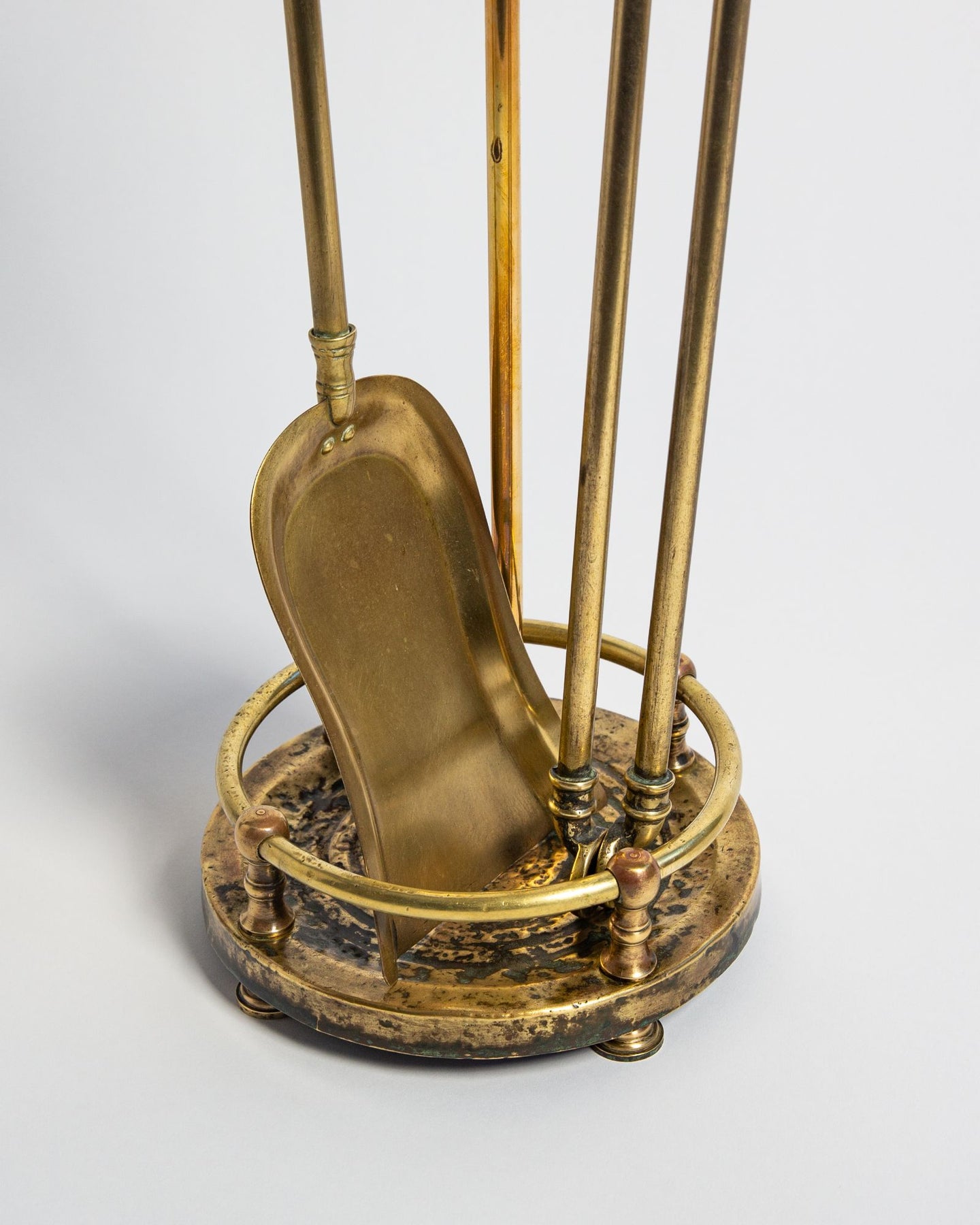 A set of fireplace tools in their original stand. Made of brass and retaining their original marks of age with an other wise beautiful hand-polished surface.