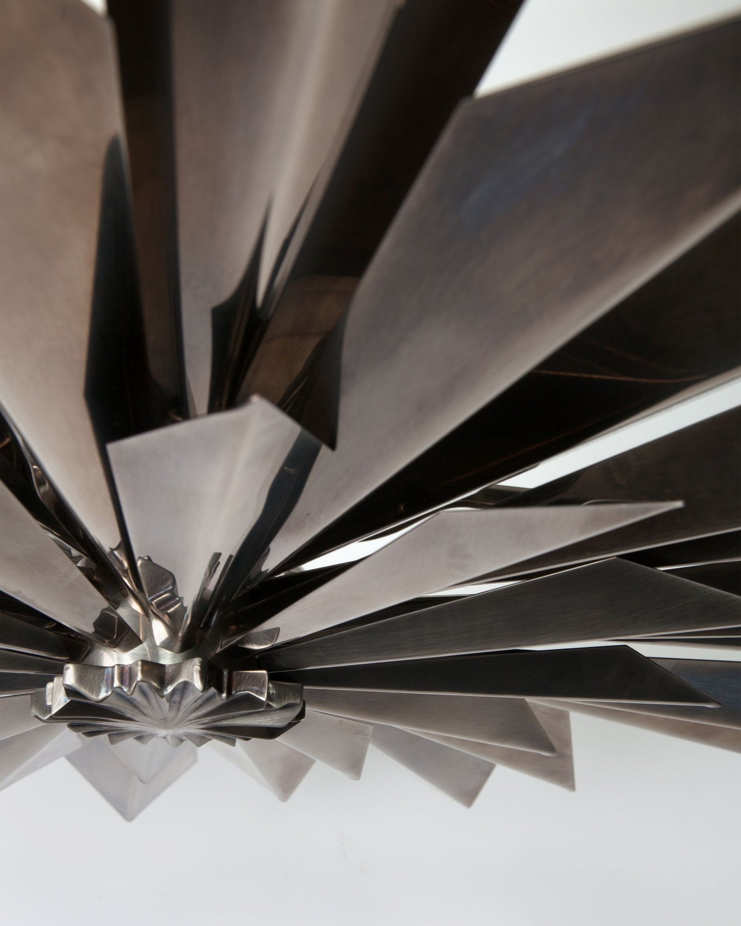 From the Remains Archive. A sunburst pendant fixture with solid brass rays reflecting light in a starburst pattern on the ceiling and walls and let slivers trace through the faceted bottom. Inspired by the sun motifs in Tony Duquette’s “California Sunburst” stage curtain for the LA Music Center (1964) and his San Francisco Canticle of the Sun exhibition. Our Archive Collection consists of the best examples of previous custom projects & historic fixtures from our collection. They are made available as inspiration for recreation or inclusion in custom projects.