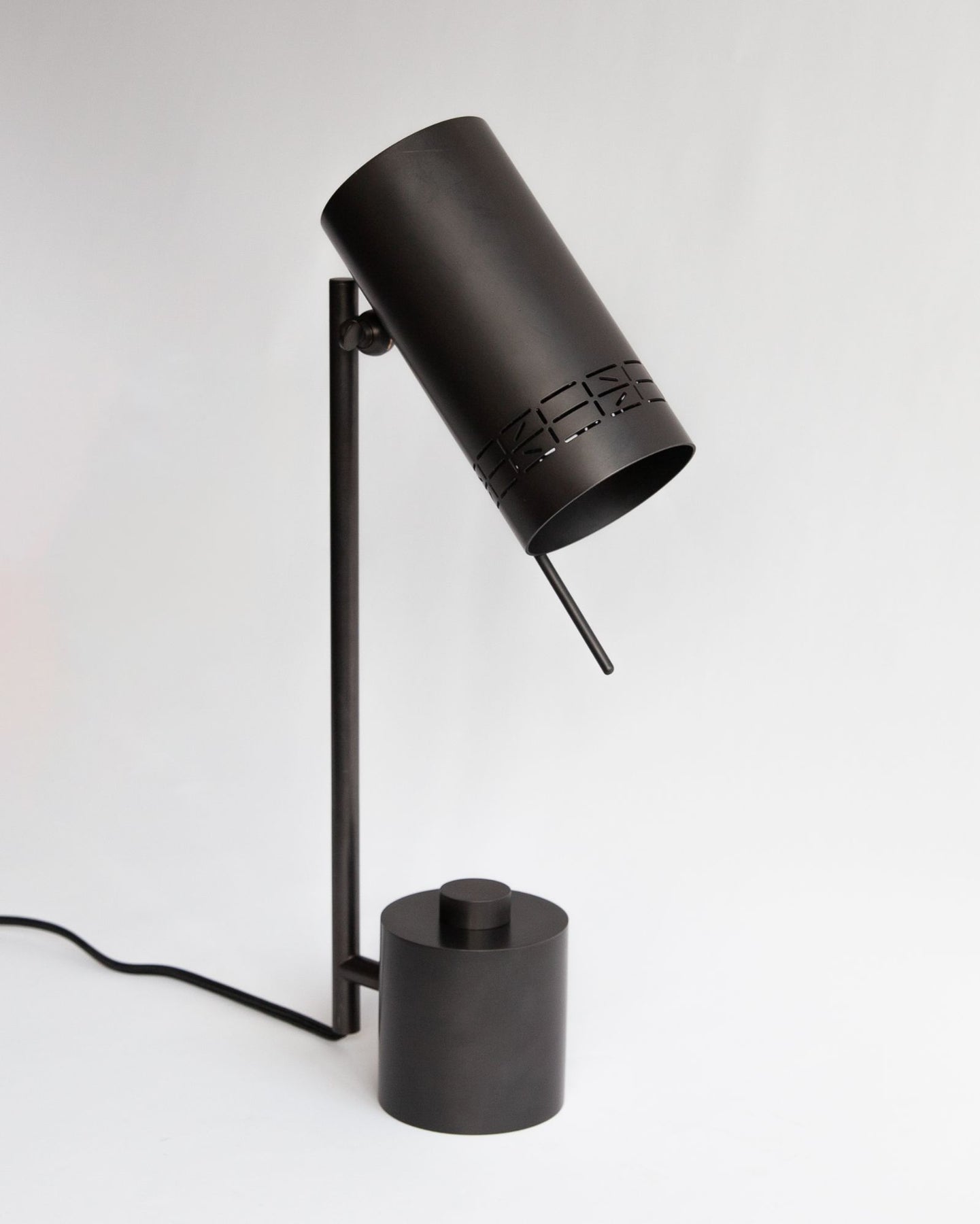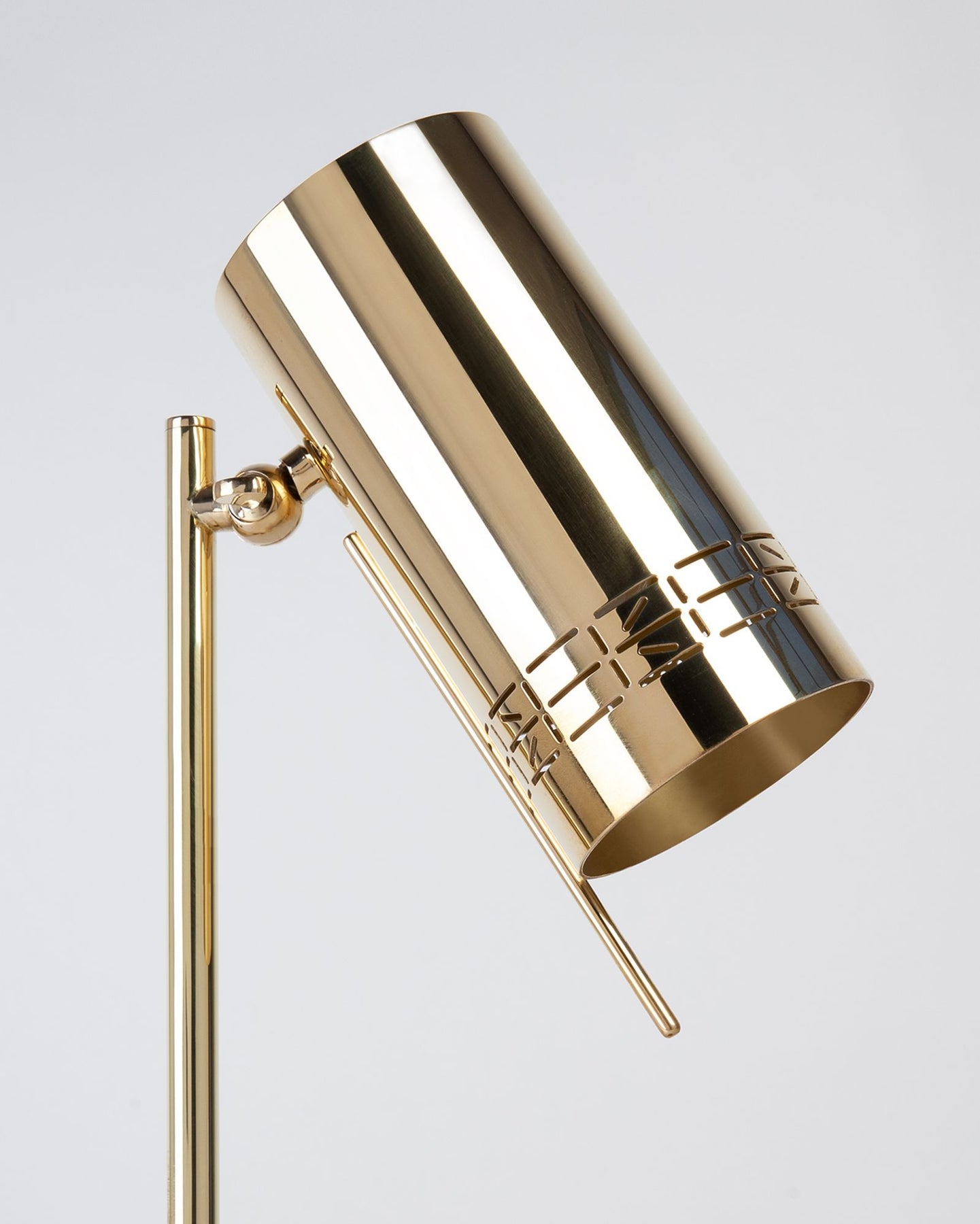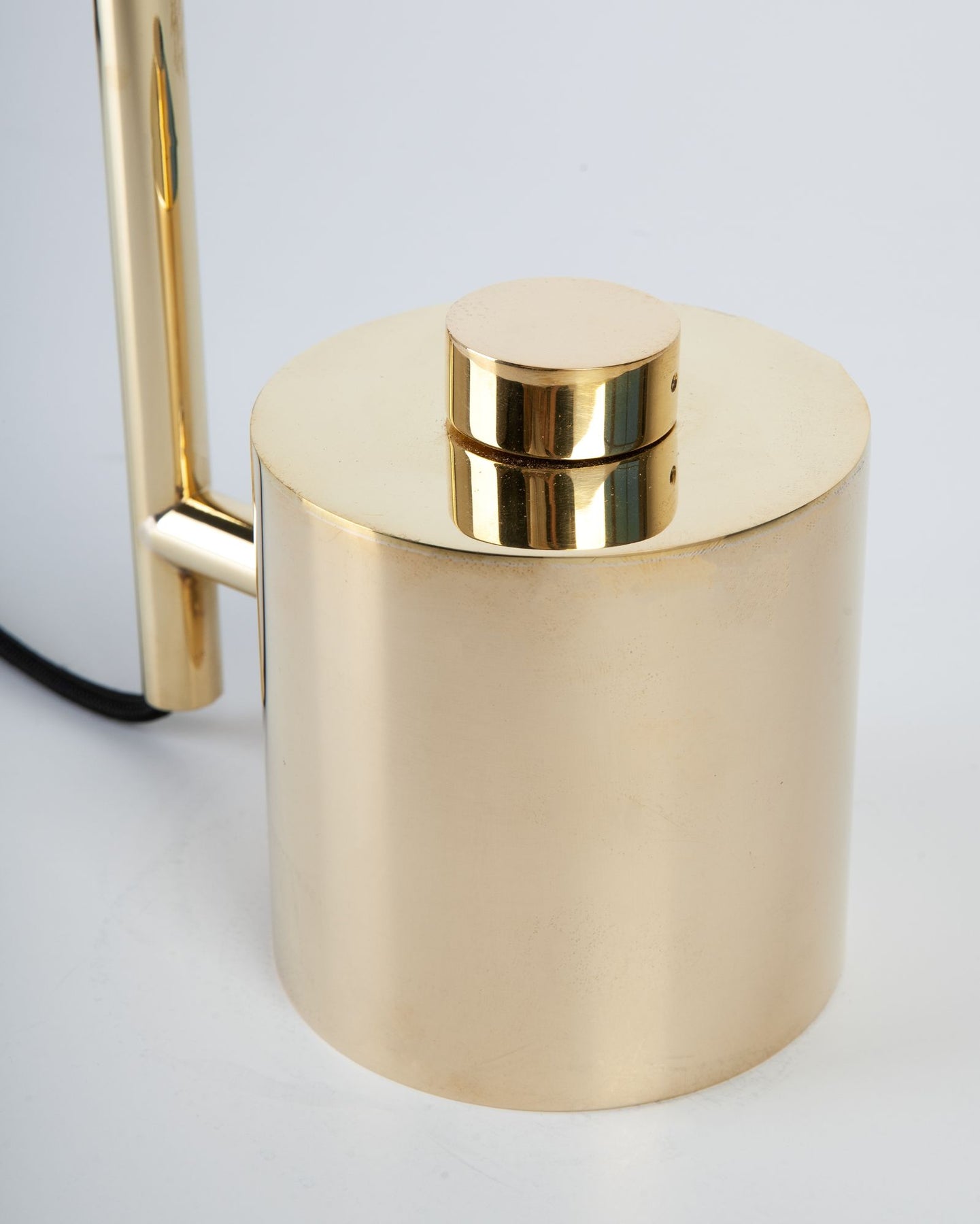 The Can Table Lamp has an adjustable cylindrical shade with optional Commune Design's signature "slash" pattern along the lower edge of the shade. Supported by a slender stem, which is both graphic and structural, the pivoting shade hovers above a weighted cylinder base with a built-in dimmer switch. The composition is both anchored and airy. Hand crafted and made to order from solid heavy brass. Built on the staple typology found in the rest of the Can Collection of modern utilitarian light fixtures.