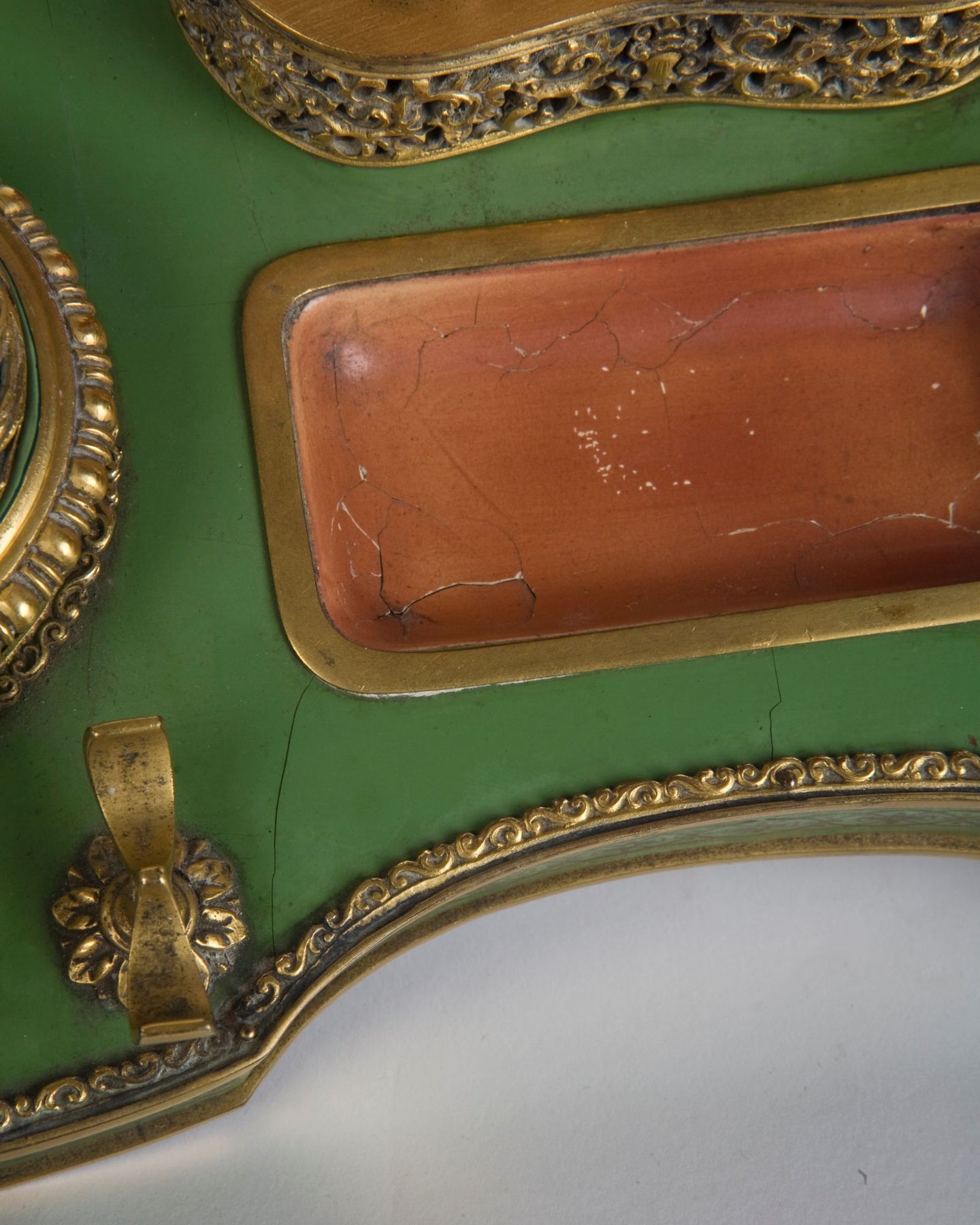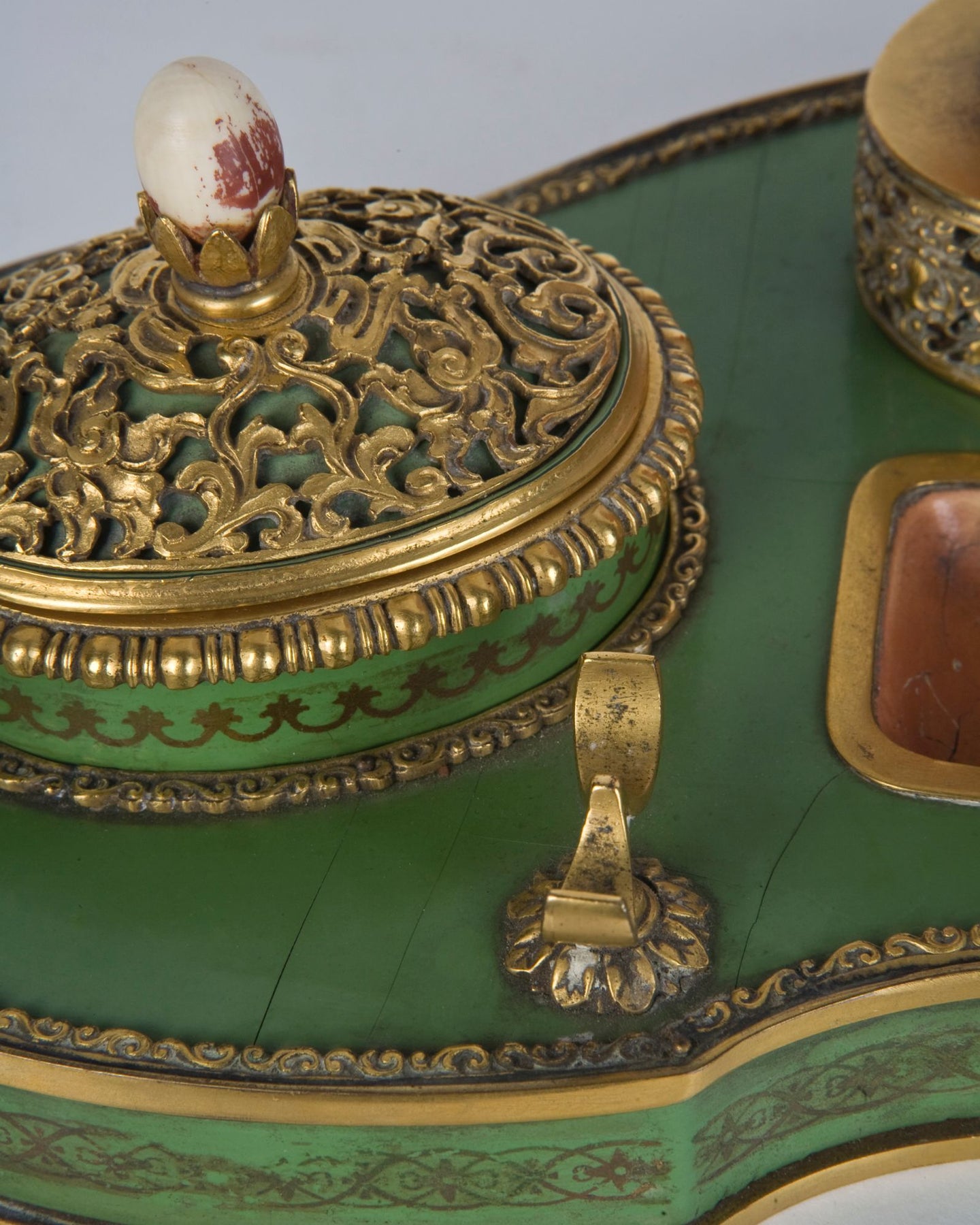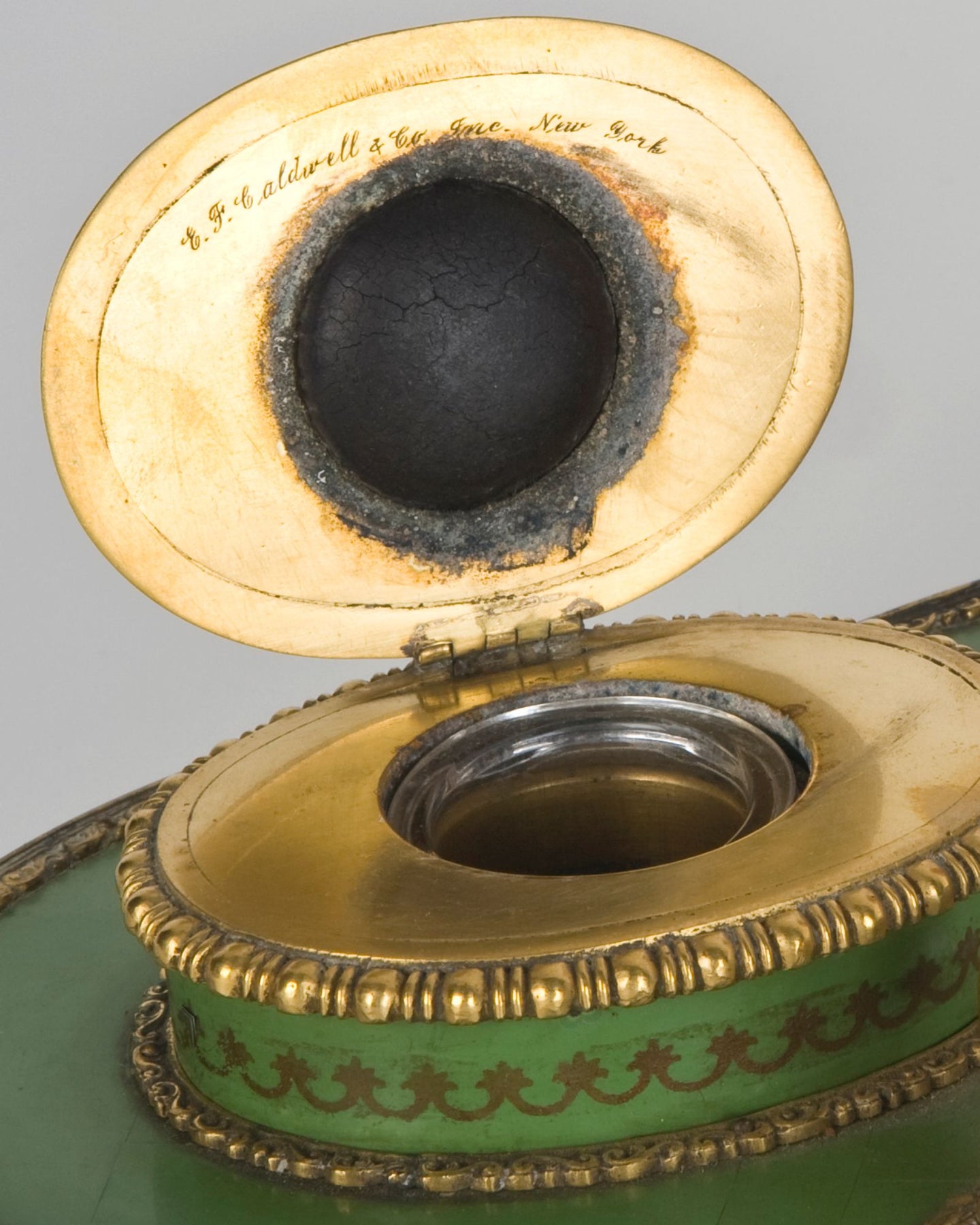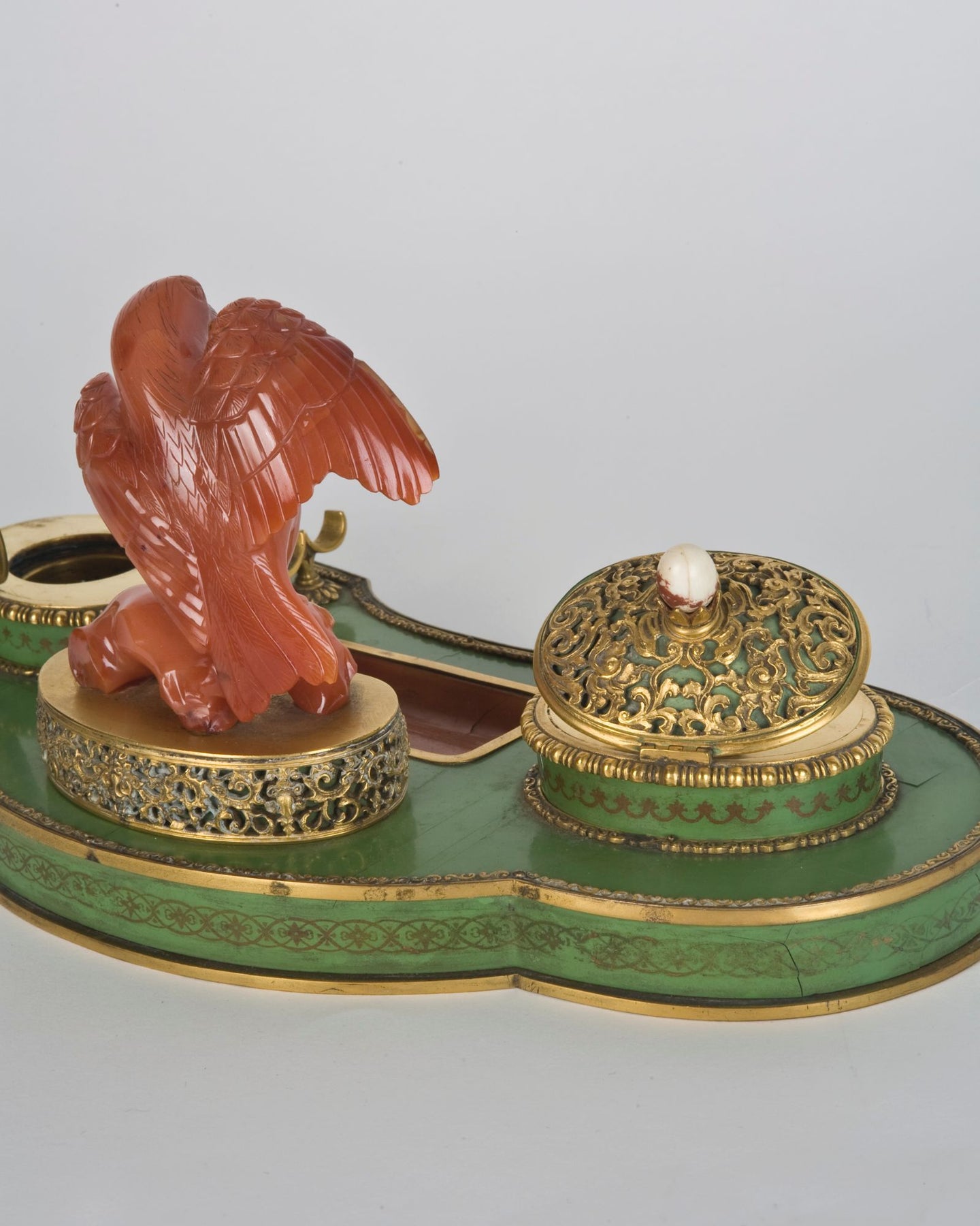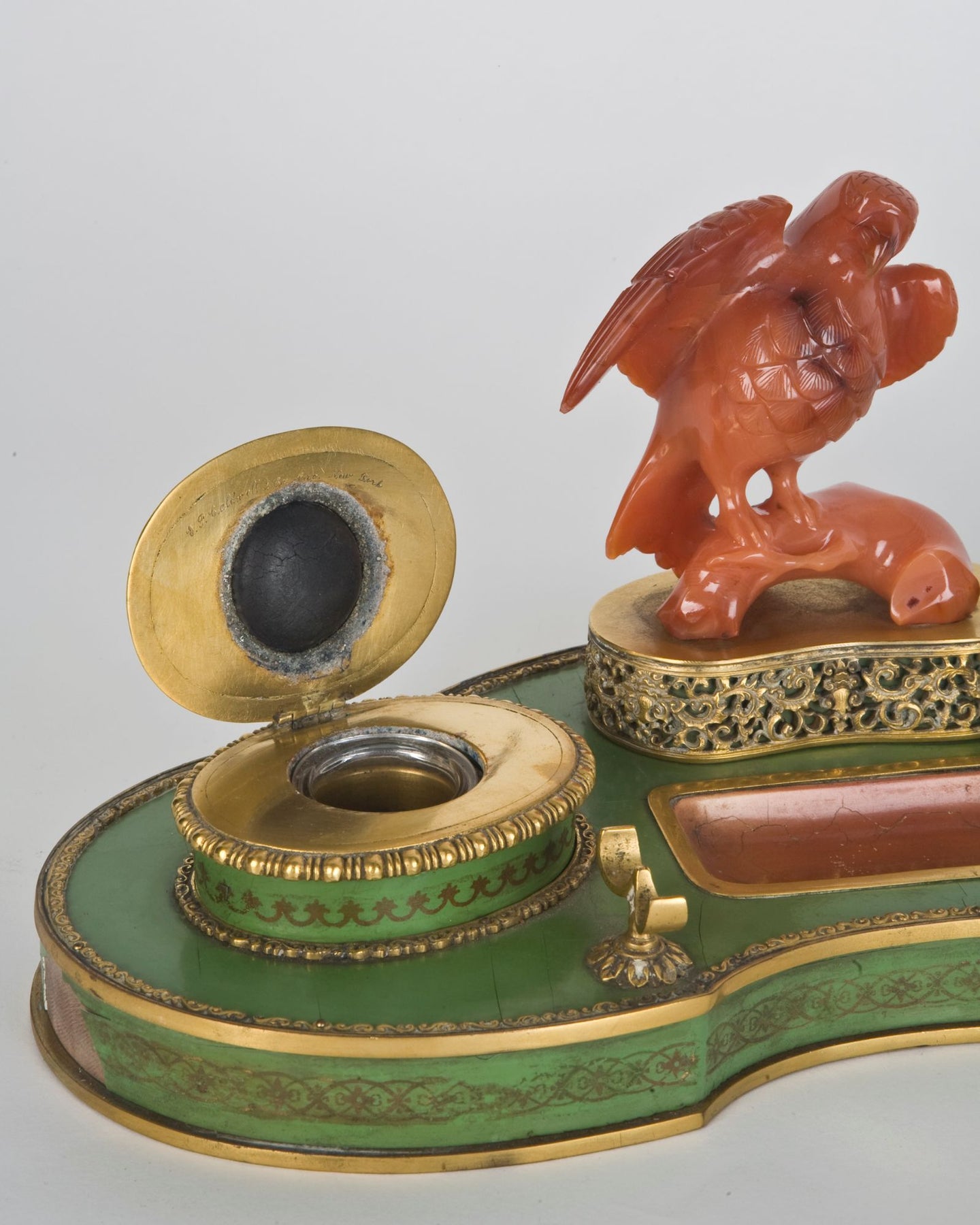 From the Remains Archive. A gilded brass and lacquered walnut inkwell topped with a carved carnelian eagle. Signed by the New York maker E. F. Caldwell. Our Archive Collection consists of the best examples of previous custom projects & historic fixtures from our collection. They are made available as inspiration for recreation or inclusion in custom projects.