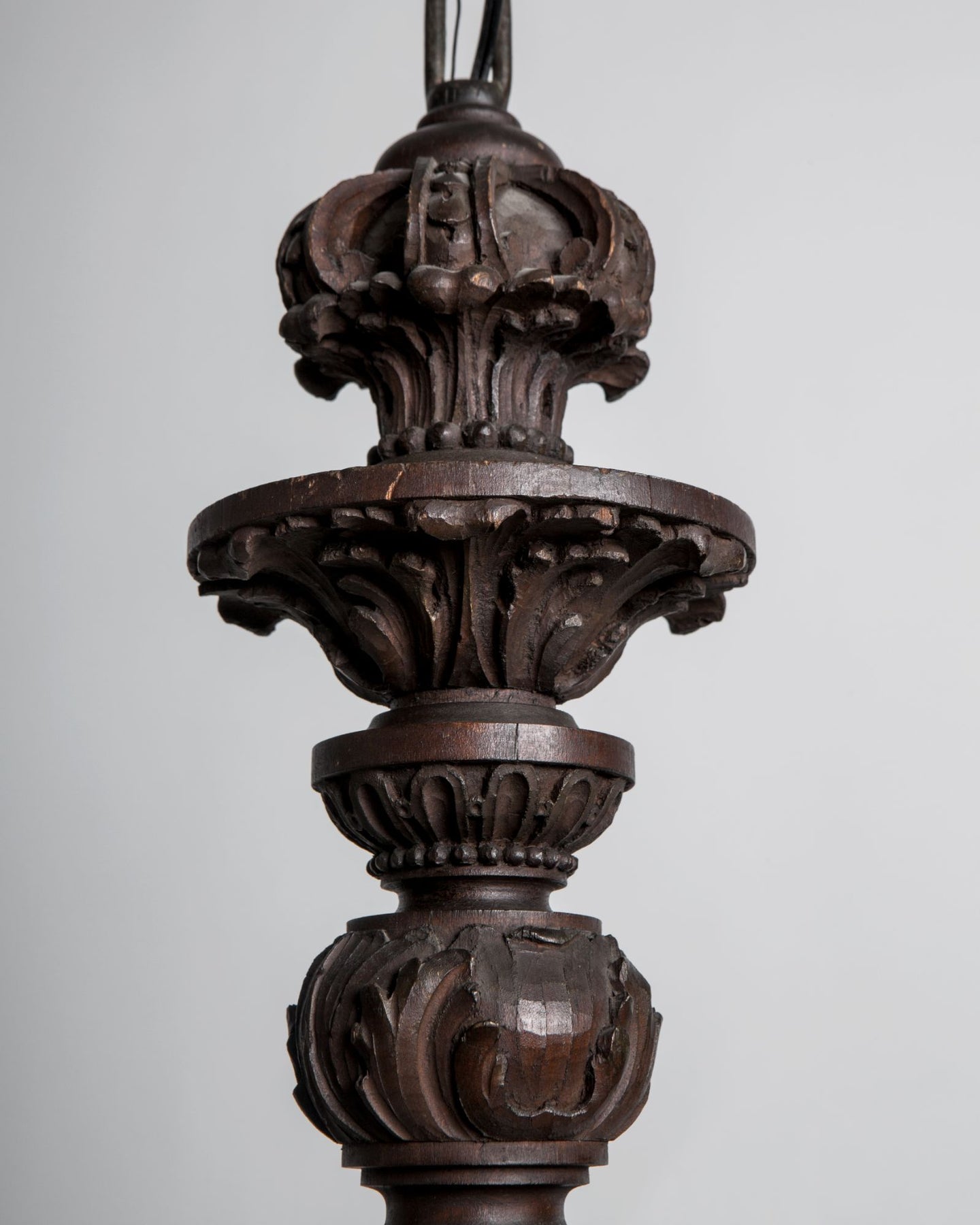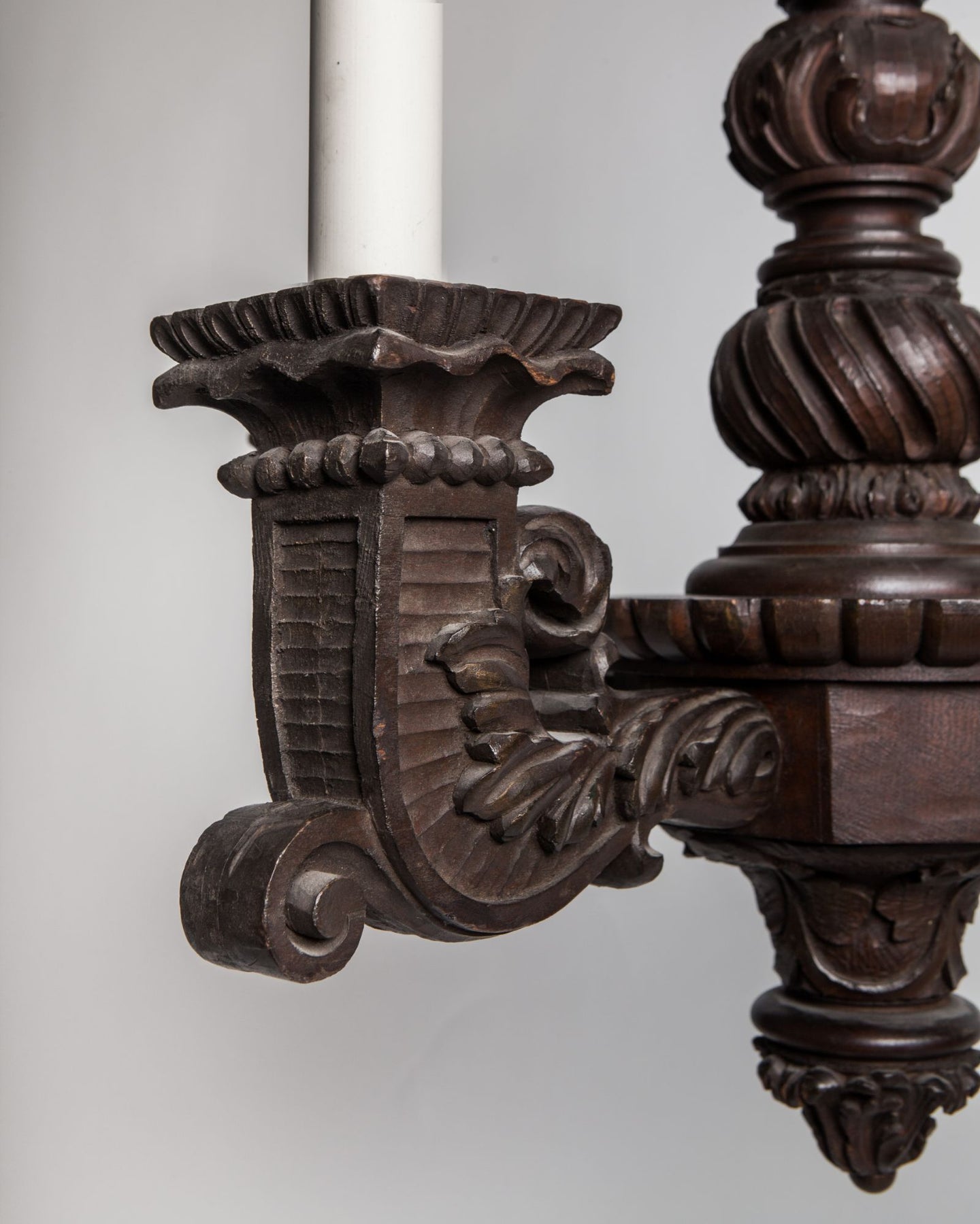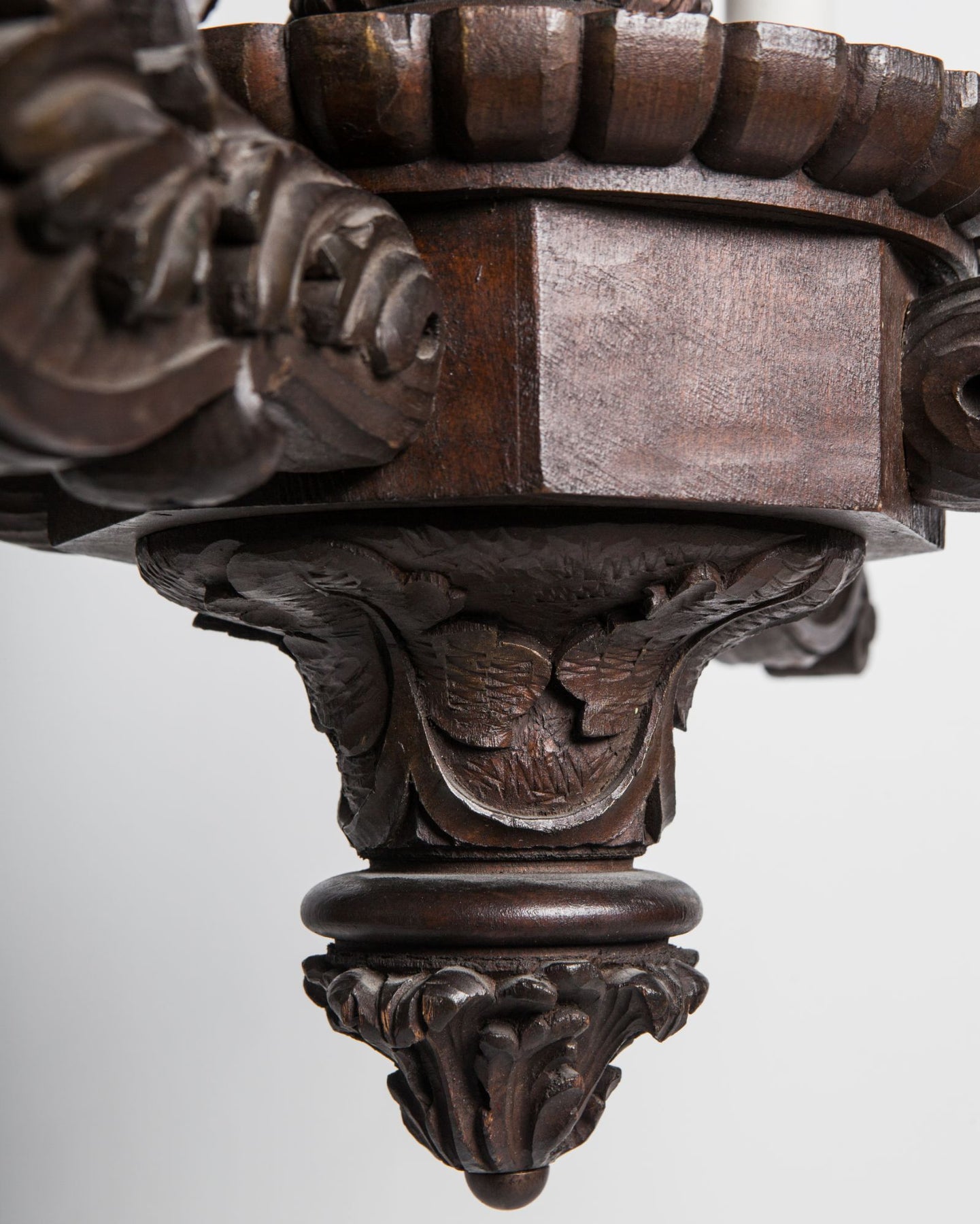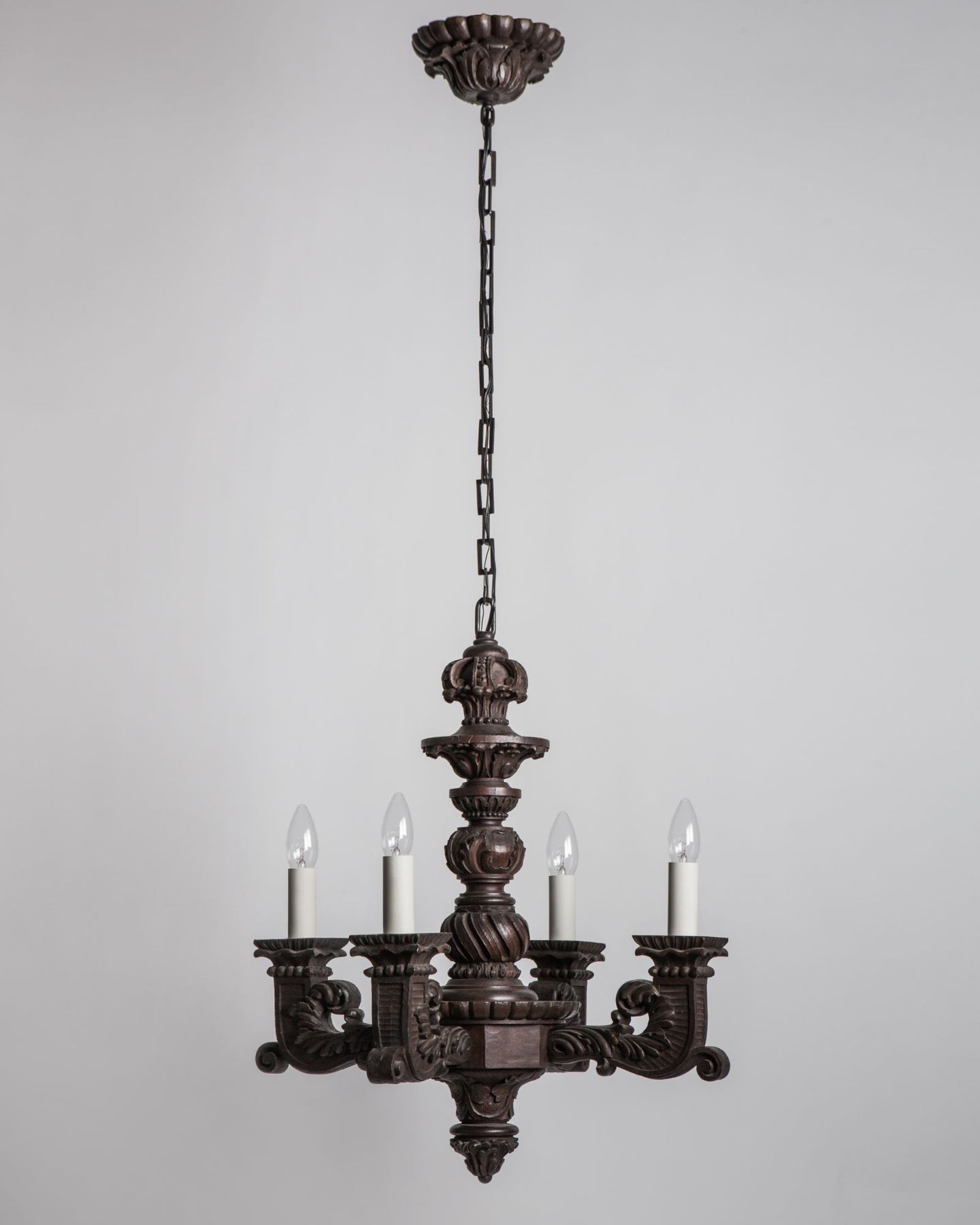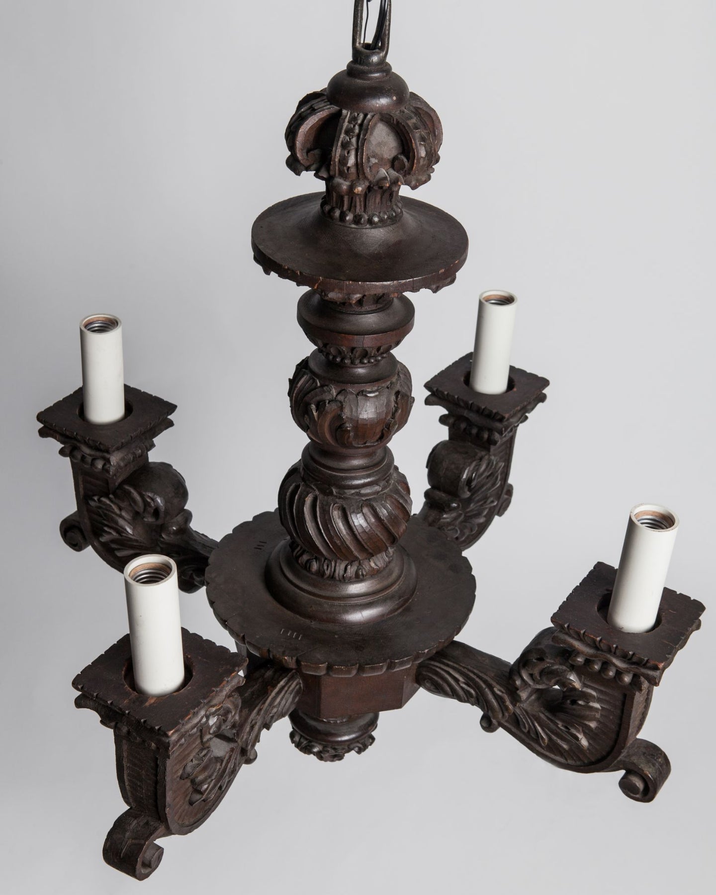 From the Remains Archive. A crisply carved, solid dark wood four-light antique chandelier with darkened brass fittings. Having foliate carvings throughout. From a Hudson River estate in Athens, NY. Our Archive Collection consists of the best examples of previous custom projects & historic fixtures from our collection. They are made available as inspiration for recreation or inclusion in custom projects.