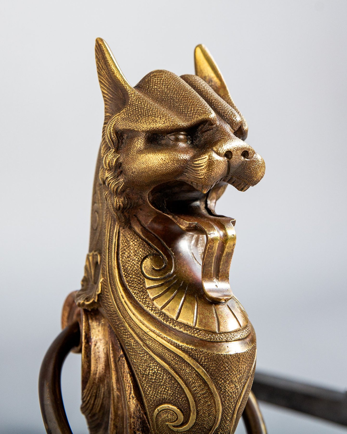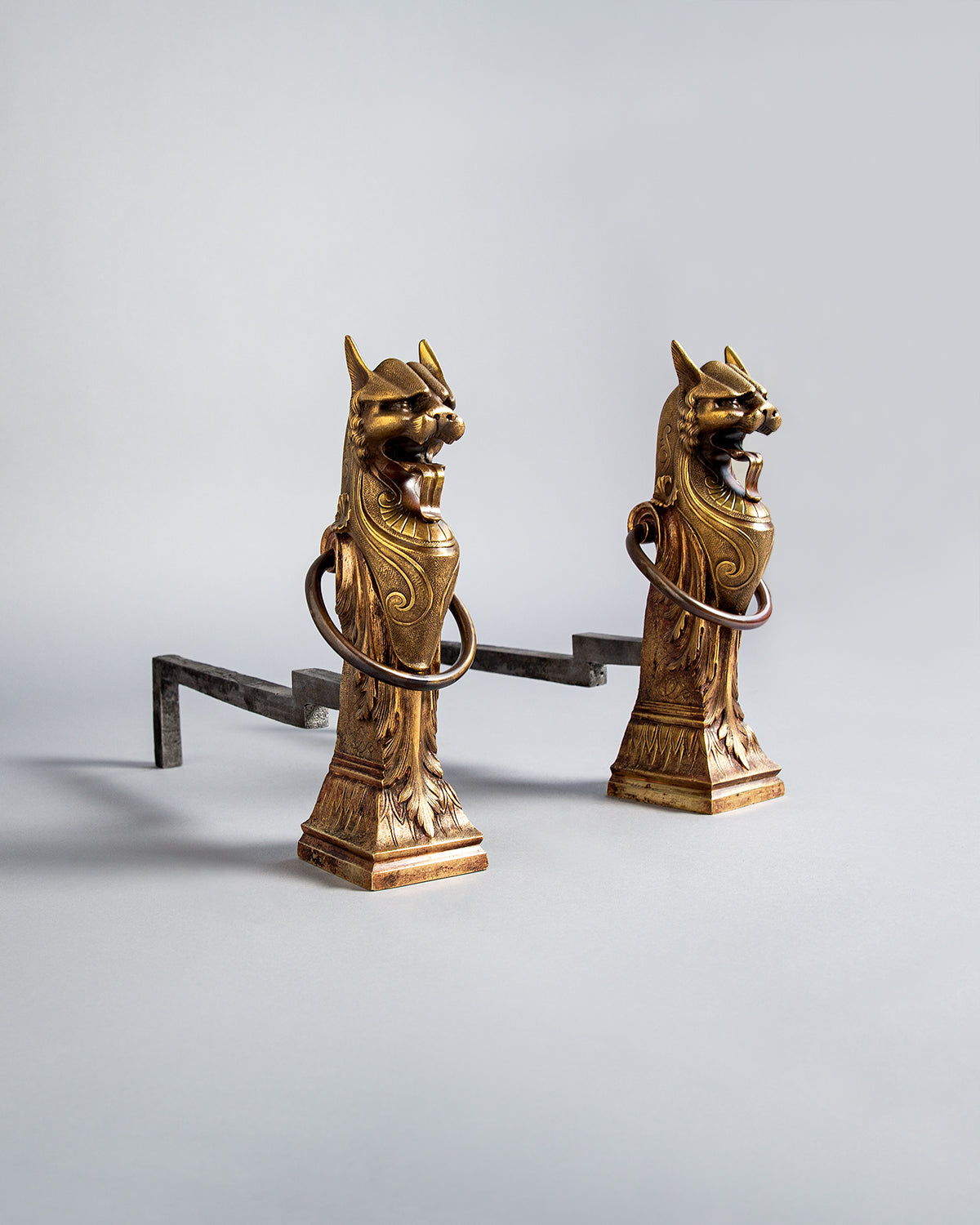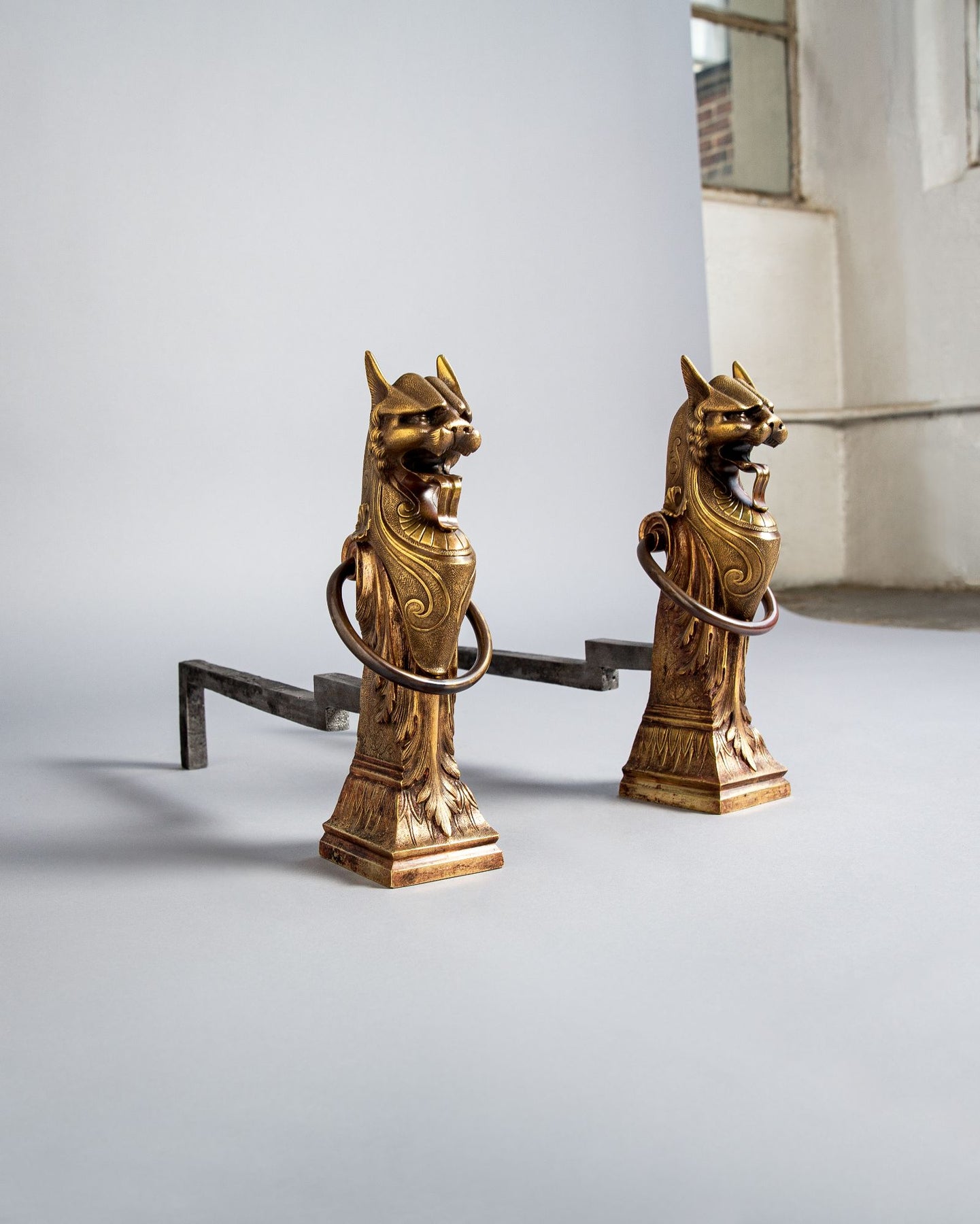 A pair of very fine antique cast bronze Italian andirons in the form of lions. The castings are crisply chased and matted overall. One of the hoops was recreated in the Remains workshops. These came to us from descendants of the family who ran a shipping business in Genoa in the 1930s.
