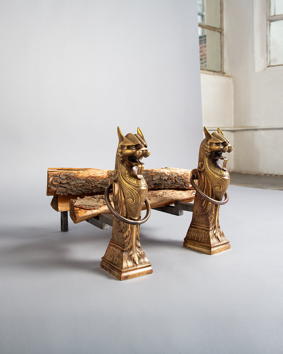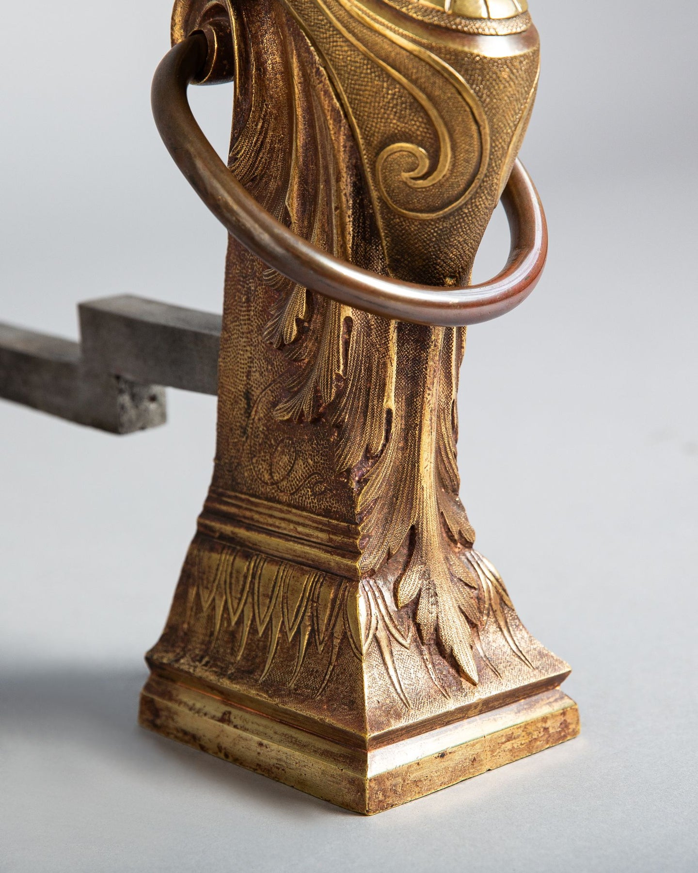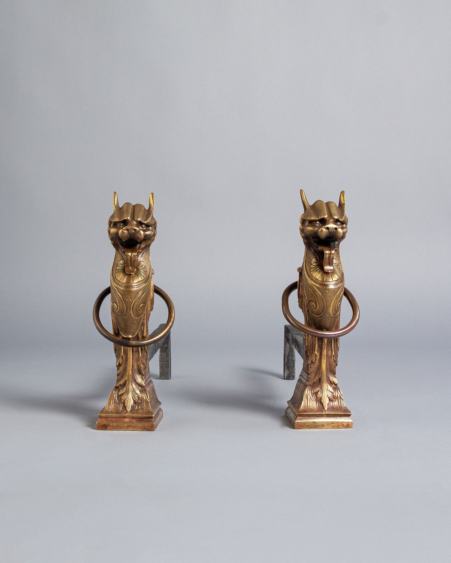 A pair of very fine antique cast bronze Italian andirons in the form of lions. The castings are crisply chased and matted overall. One of the hoops was recreated in the Remains workshops. These came to us from descendants of the family who ran a shipping business in Genoa in the 1930s.