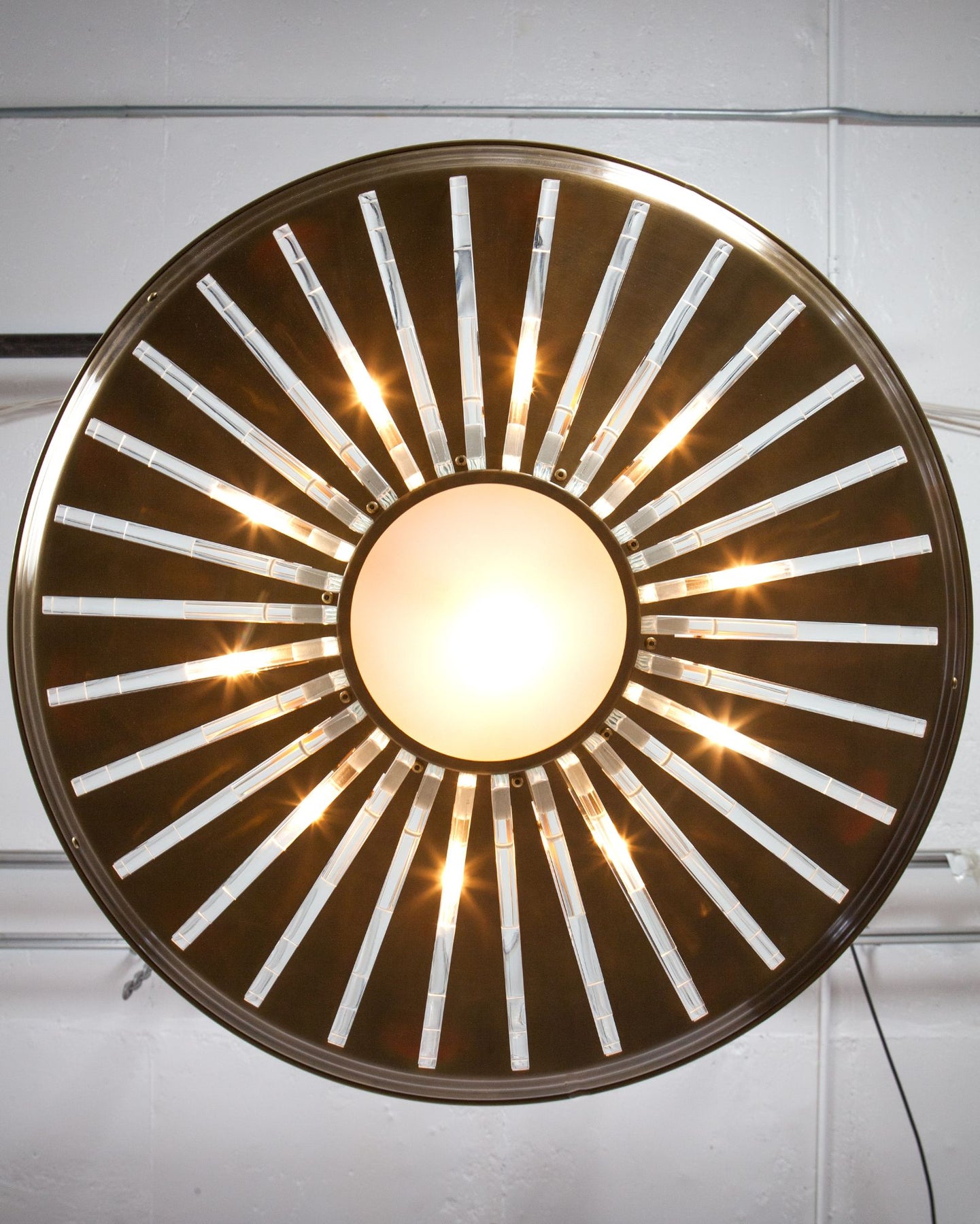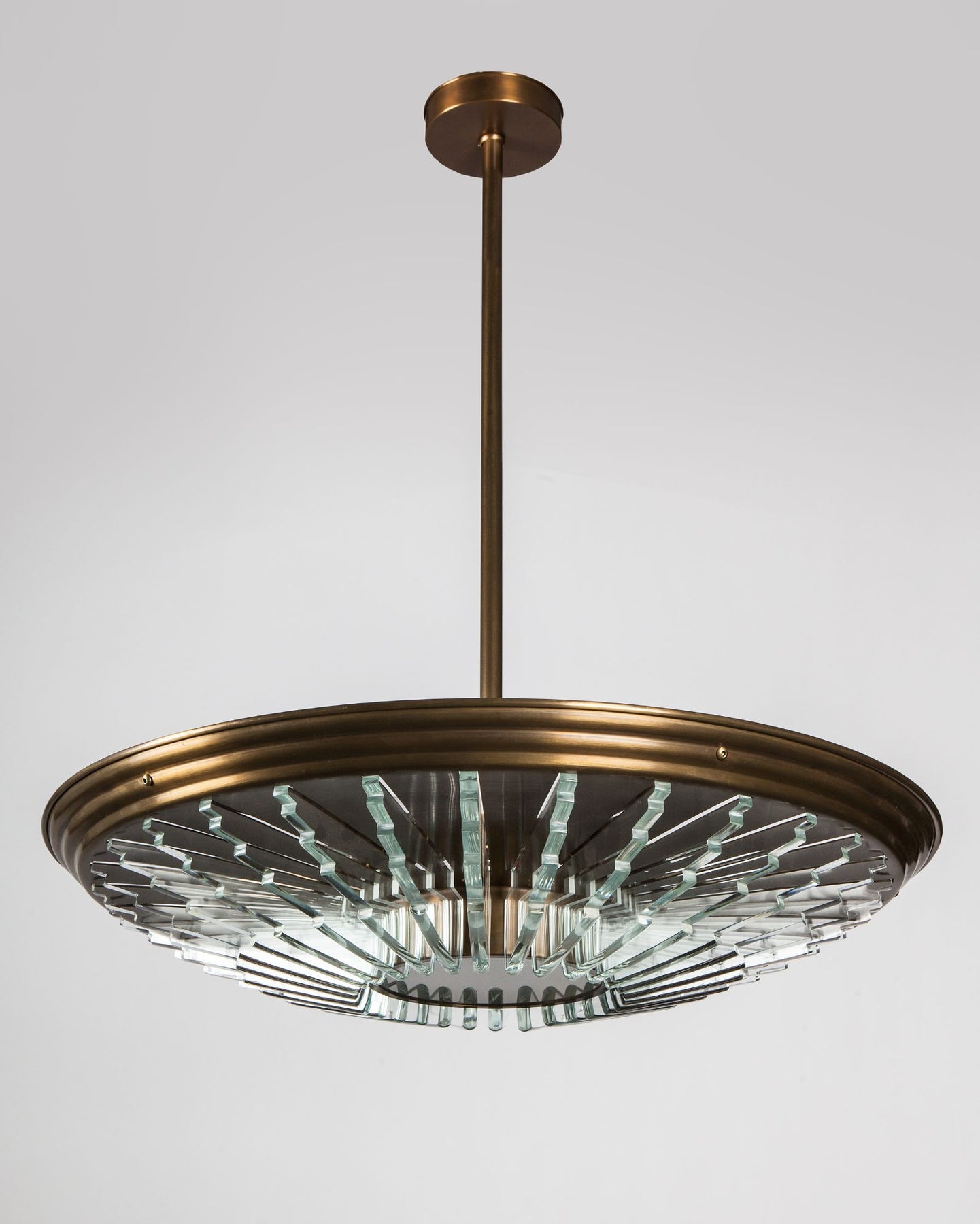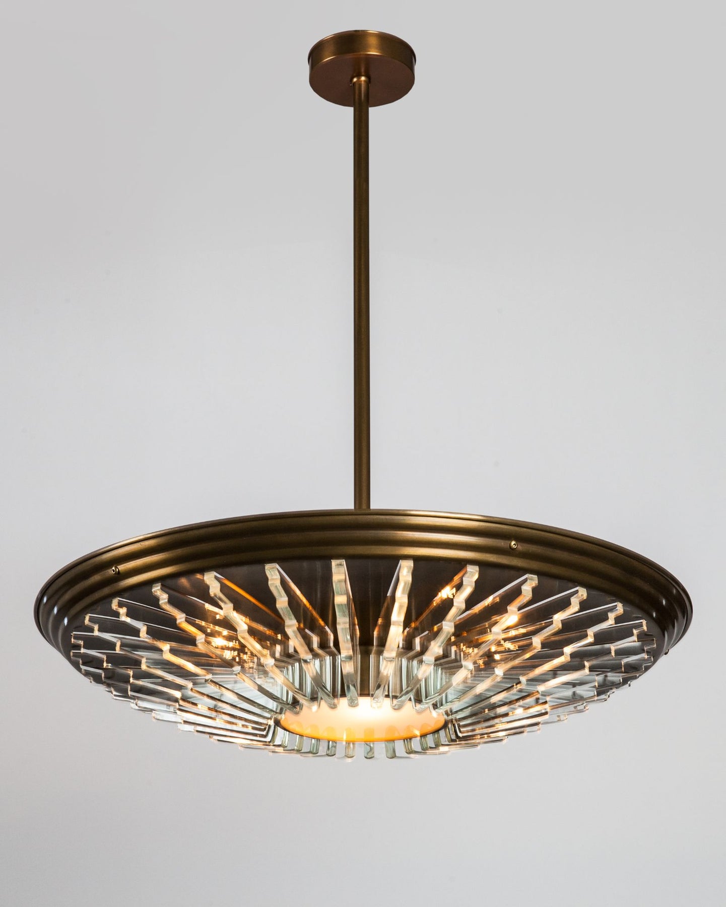 From the Remains Archive. This chandelier, reproduced from a photograph of a 1950s Italian original, has a large brass dish with a stepped edge pierced with backlit cut glass fins. Our Archive Collection consists of the best examples of previous custom projects & historic fixtures from our collection. They are made available as inspiration for recreation or inclusion in custom projects.