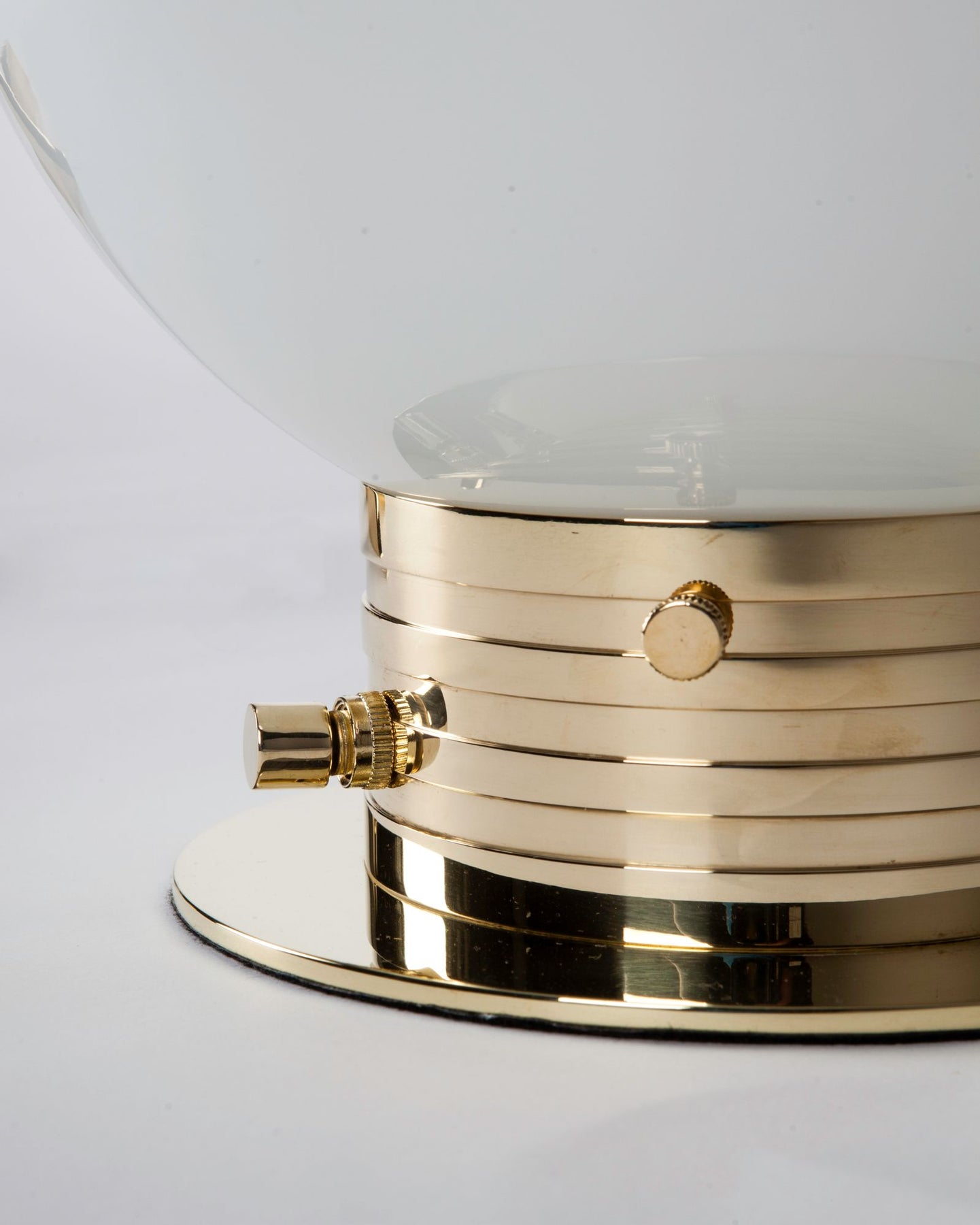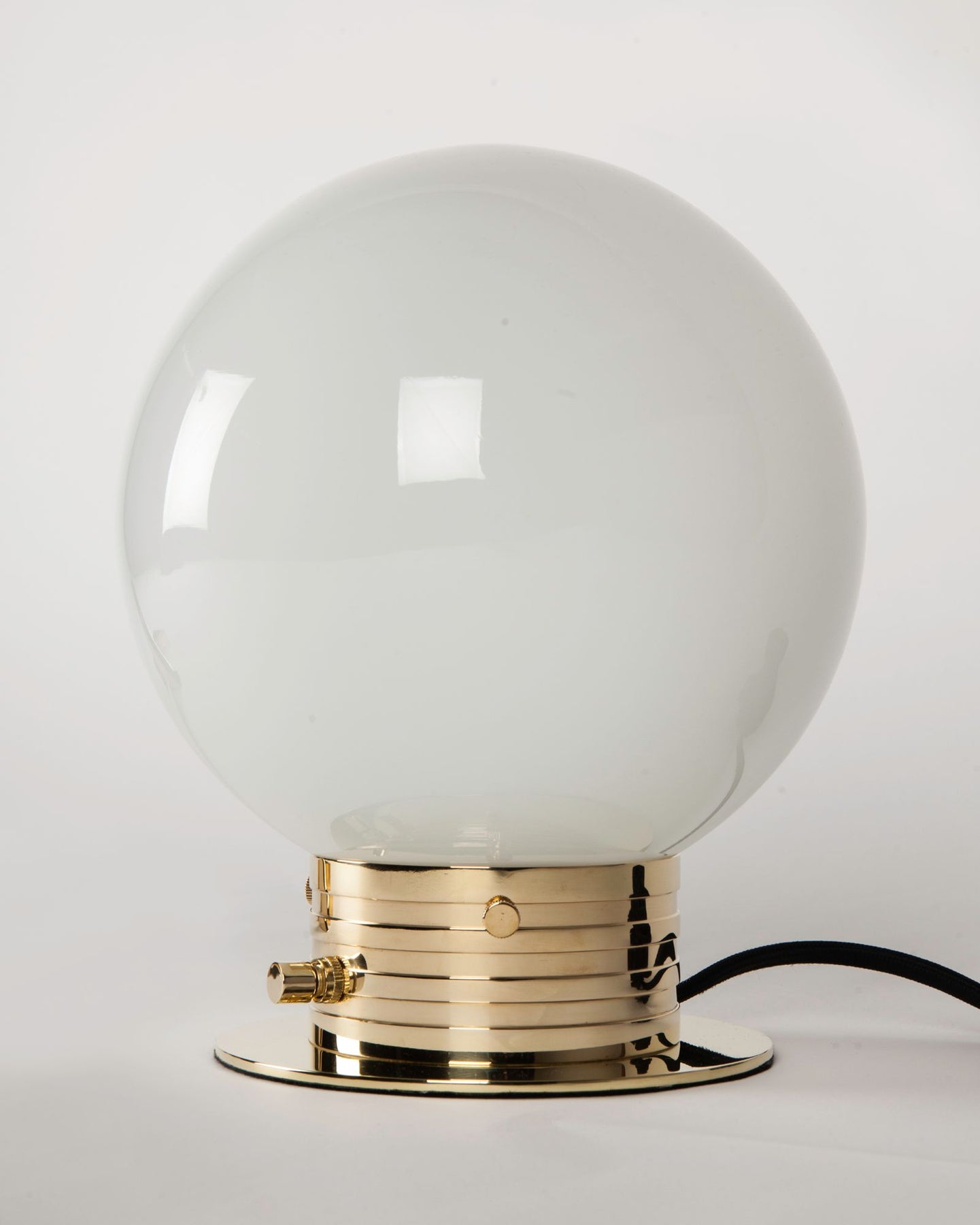A table lamp with solid brass ribbed base with a body-mounted brass thumb turn switch and a hand-blown white glass globe. Inspired by the works of Honsel, Lauritzen, and Weisdorf and the simplified forms found during the Functionalist design movement.