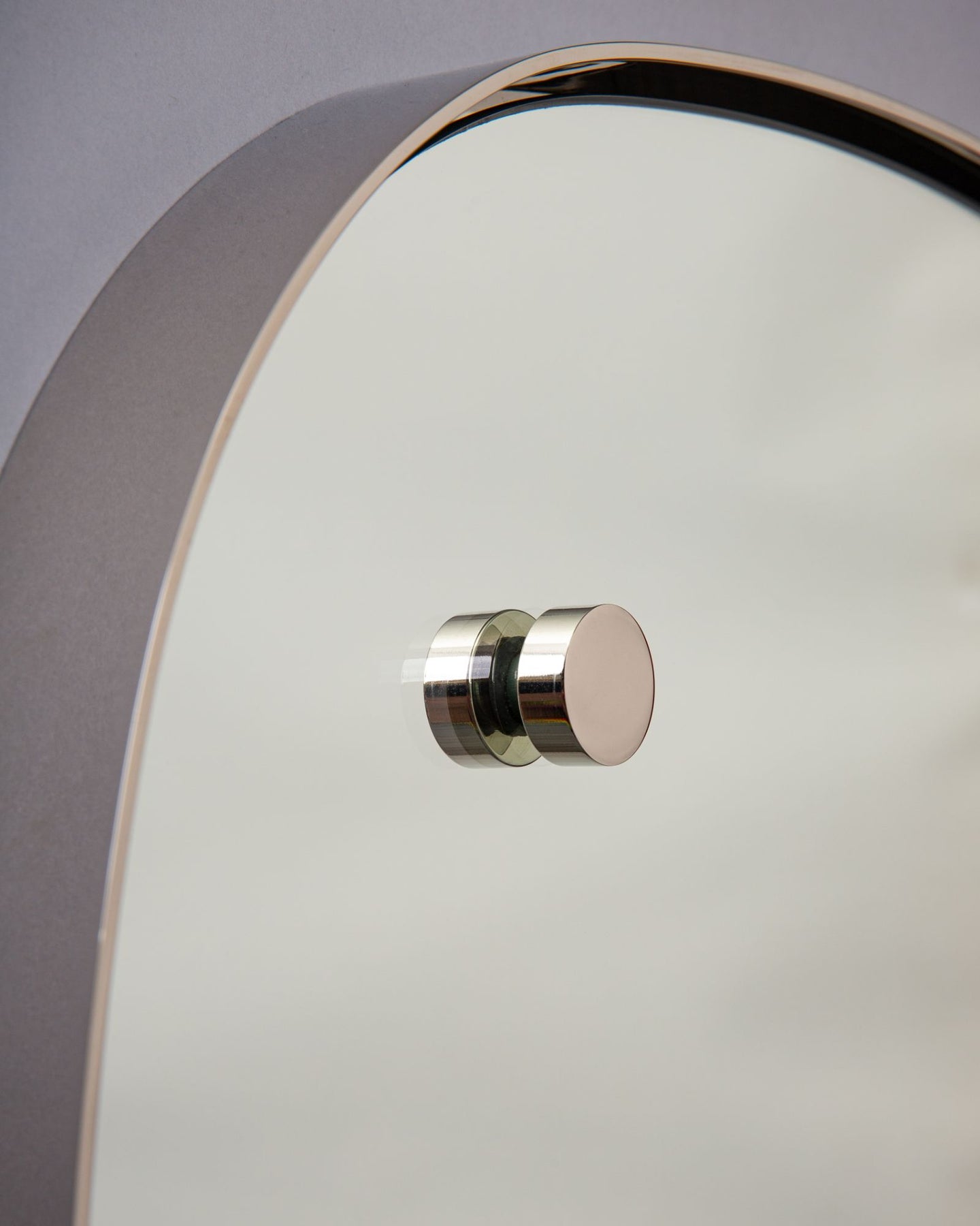 A rounded square wall mirror that floats slightly off its brass frame, creating depth and shadow that shift throughout the day. The softened geometry and four brass disc finials anchor the design with precise sculptural and mechanical details. Square or ‘diamond’ orientation available.