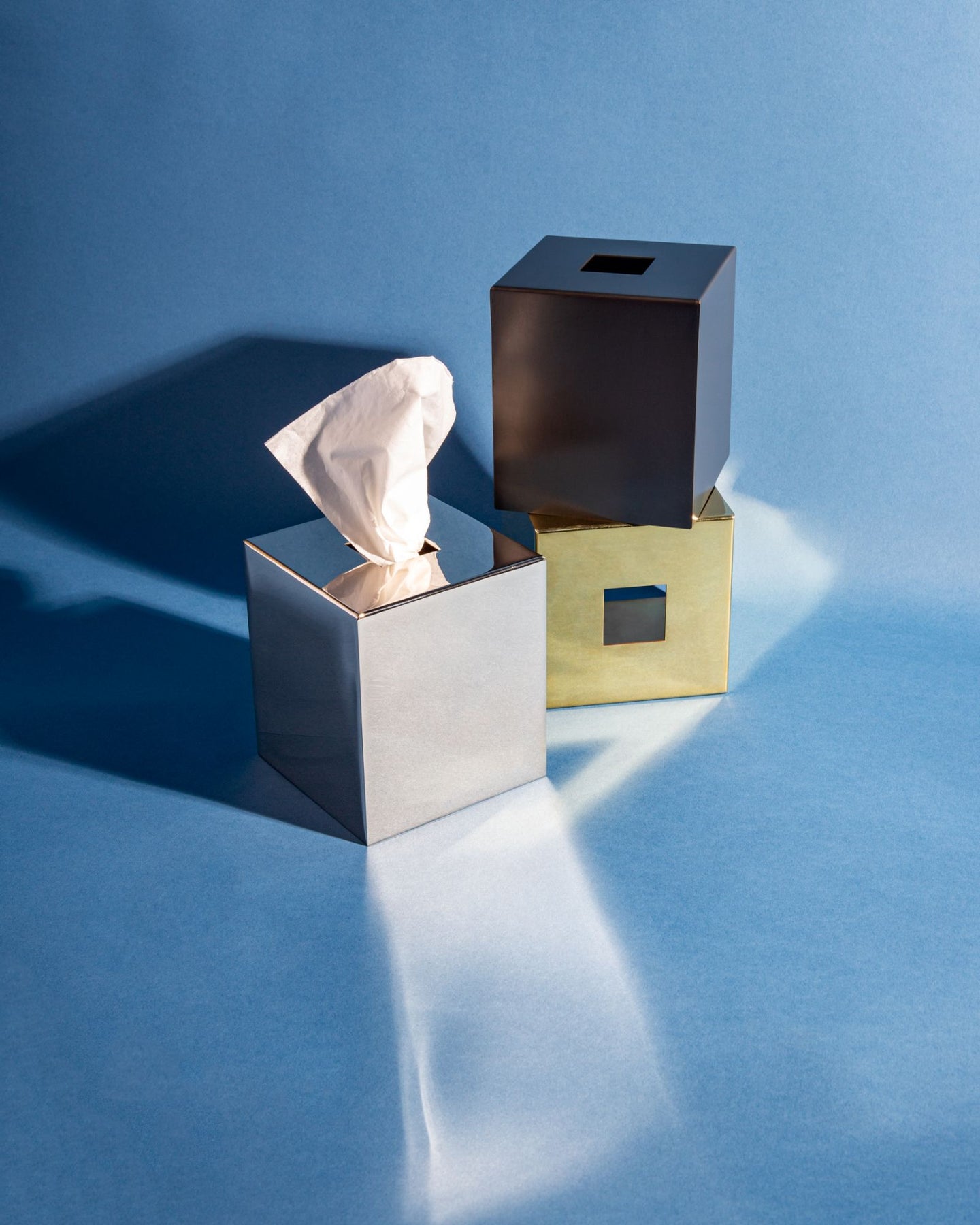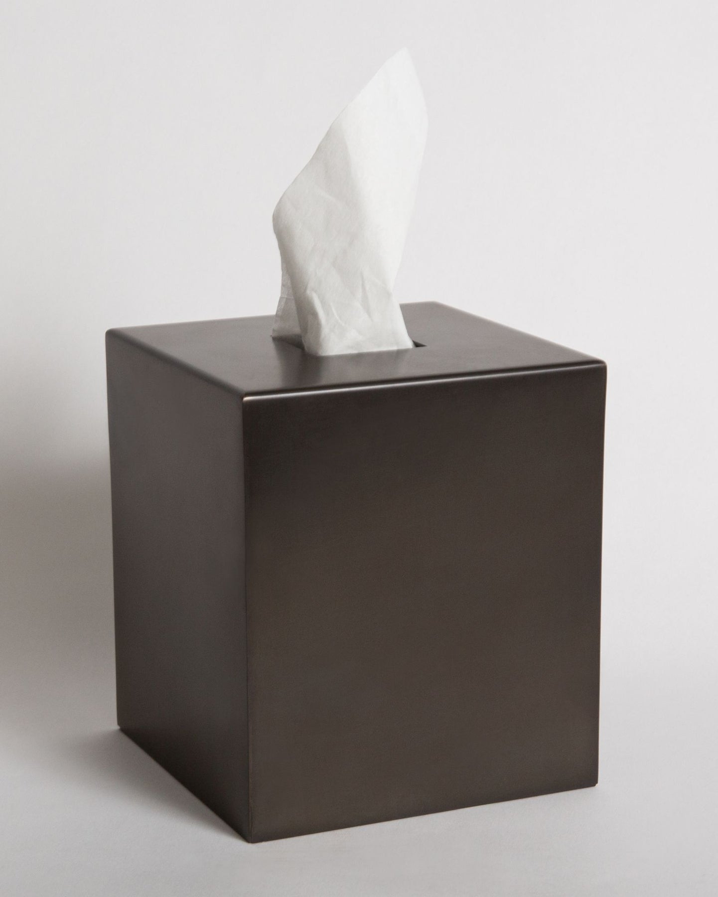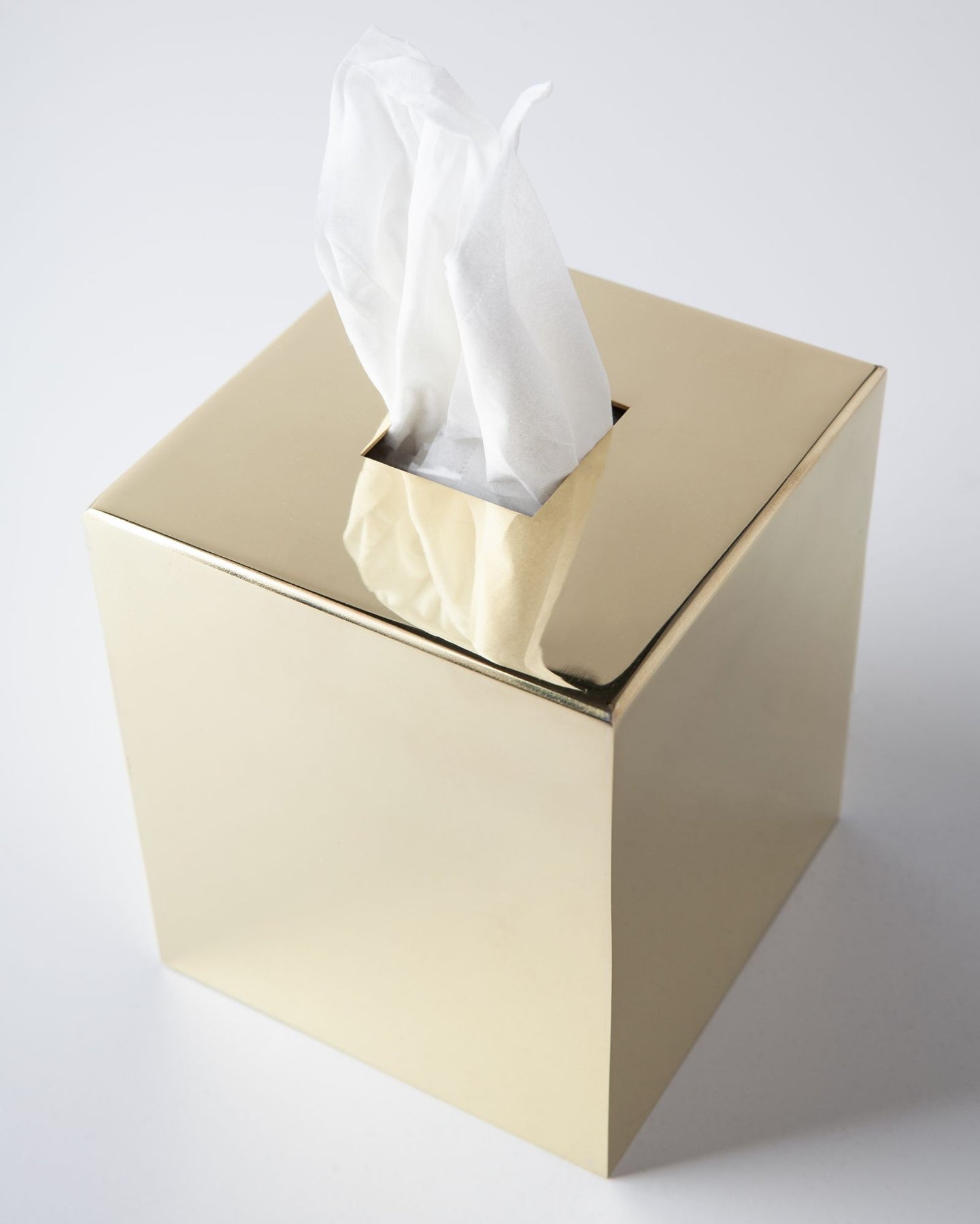 A square tissue box cover with a central square aperture inspired by the detailing of Josef Hoffmann, made to order in solid brass. Part of a full accessory collection, fabricated in unlacquered brass which will patina to perfection over time. Whether in the bathroom, kitchen or office, these accessories are made to be used, mixed, and matched.