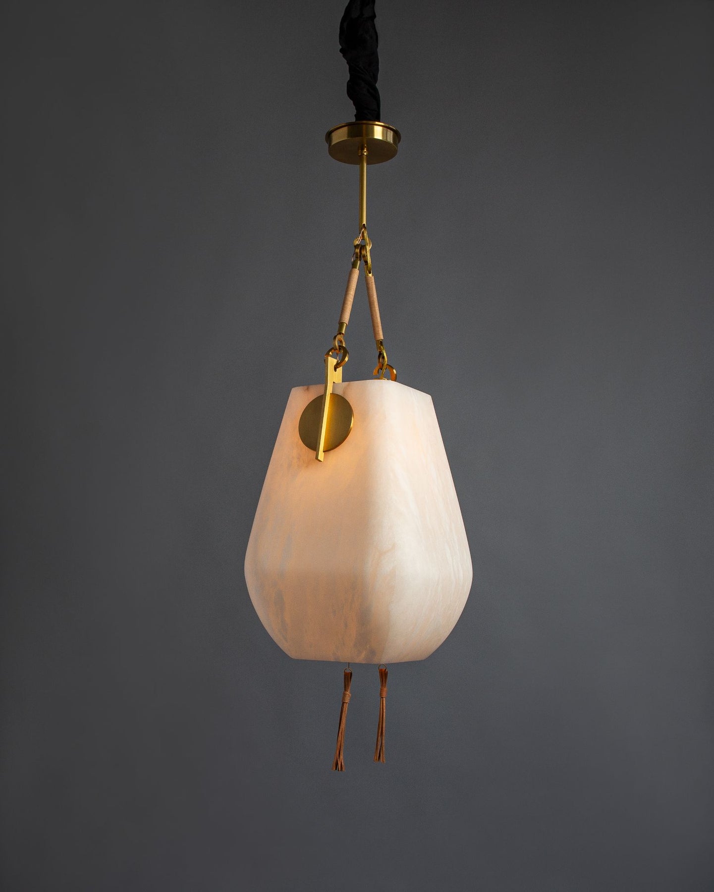 A hanging lantern with a hand-carved, veined white alabaster 'basket' shade, mounted with brass shields and suspended by slender hooks and a milled canopy. Each hook is wrapped in leather cord, and two leather tassels descend through an opening at the base of the alabaster shade. The fixture's design evokes the baskets woven by Ariadne to store grapes for the Greek god Dionysus. UL listed.