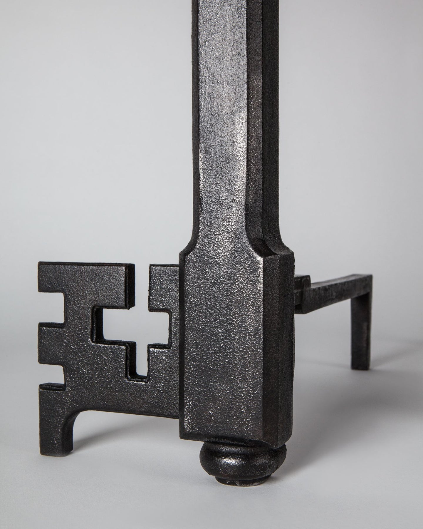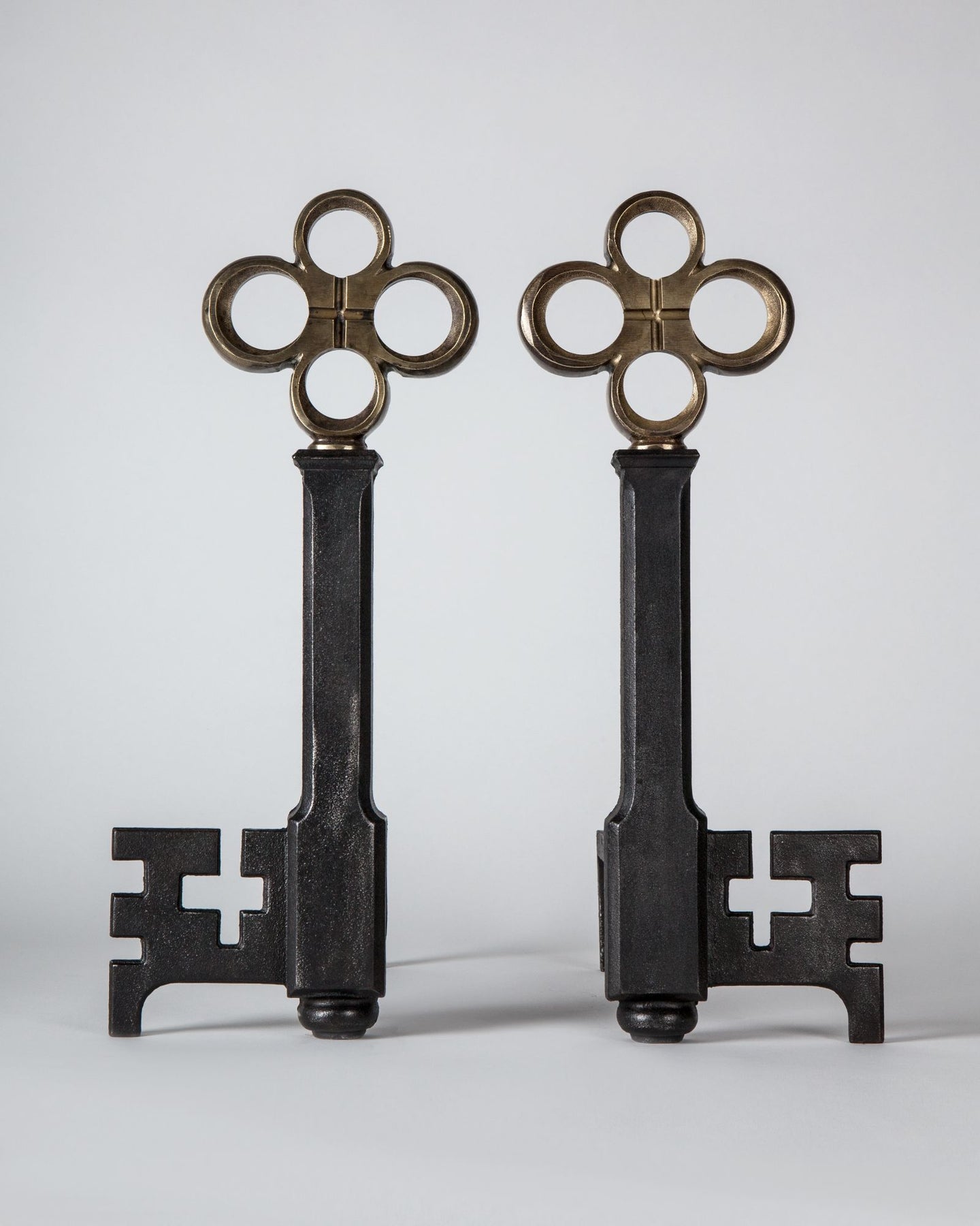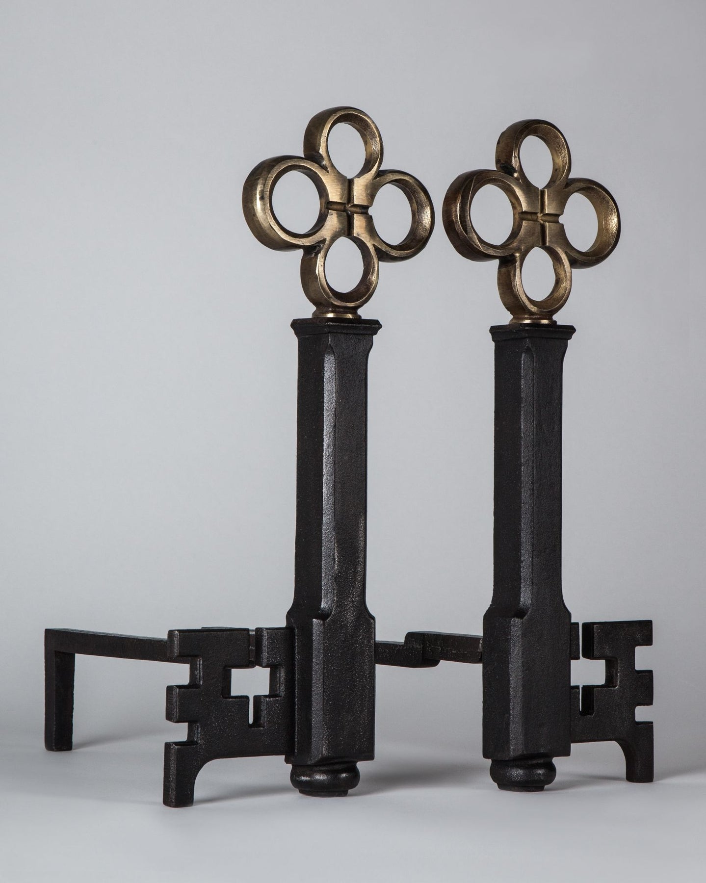 From the Remains Archive. A pair of antique key form andirons, the shanks in darkened cast iron and the quatrefoil heads in their original aged brass. Our Archive Collection consists of the best examples of previous custom projects & historic fixtures from our collection. They are made available as inspiration for recreation or inclusion in custom projects.