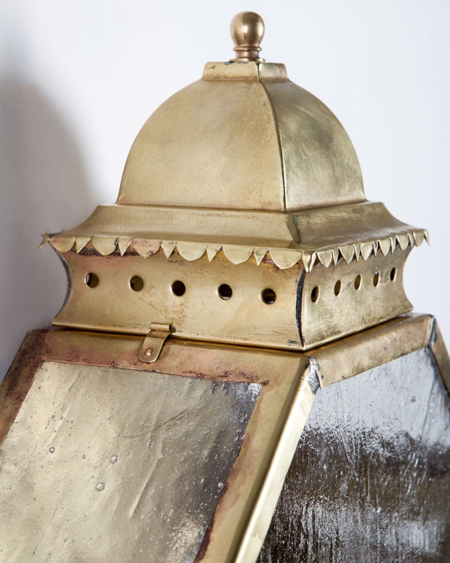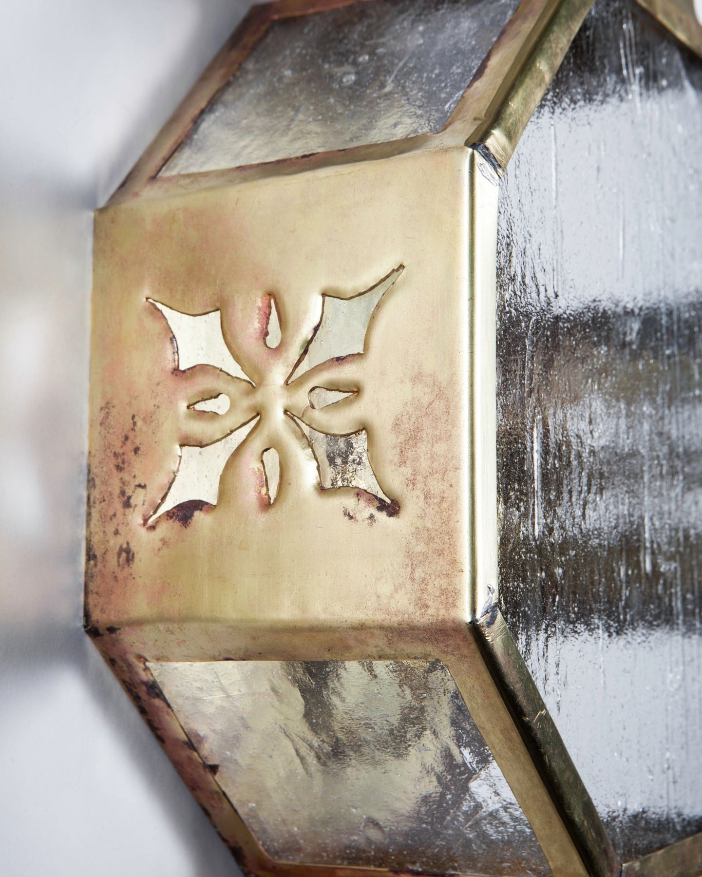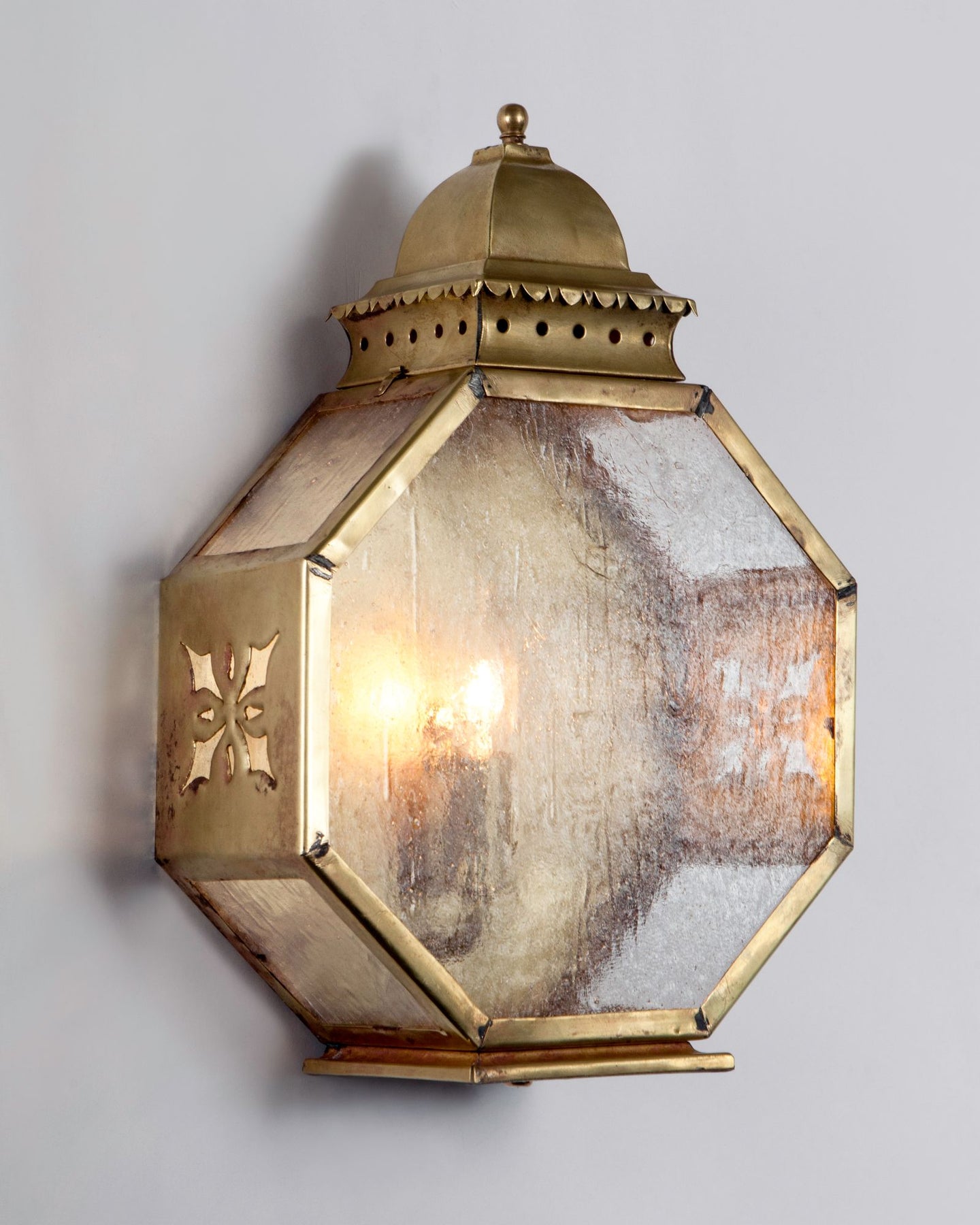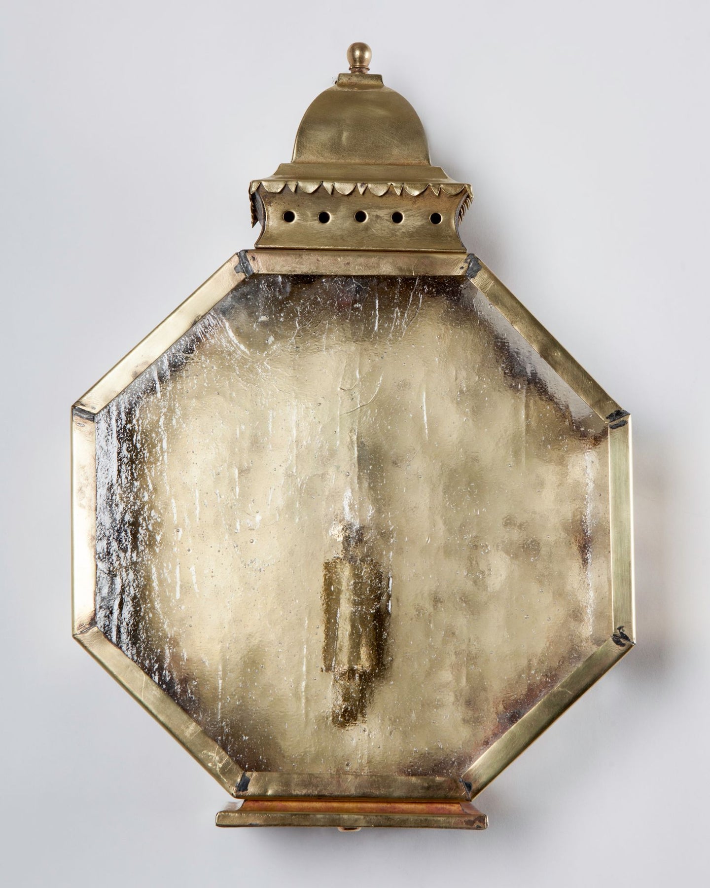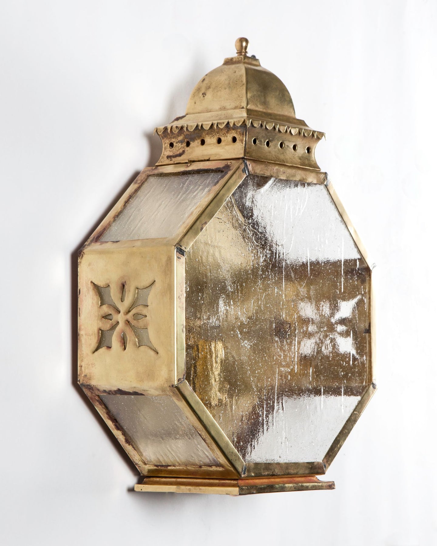 From the Remains Archive. An antique California Mediterranean octagonal wall lantern in an aged mellowed brass finish, having pierced sides and clear seeded glass panels. Our Archive Collection consists of the best examples of previous custom projects & historic fixtures from our collection. They are made available as inspiration for recreation or inclusion in custom projects.
