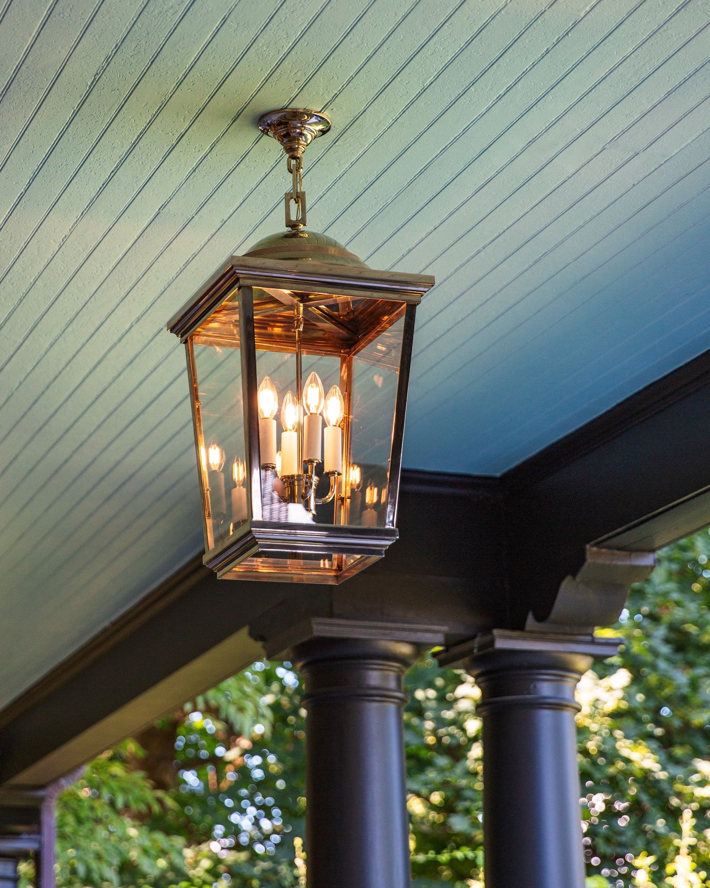 Remains Lighting Co. Collection image 10 of a made-to-order Philip Tapered Exterior Lantern.  Shown lit in Burnished Brass with customized candlesleeves in Burnished Brass finish.