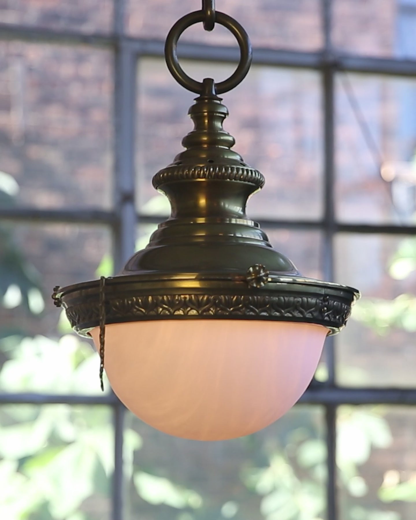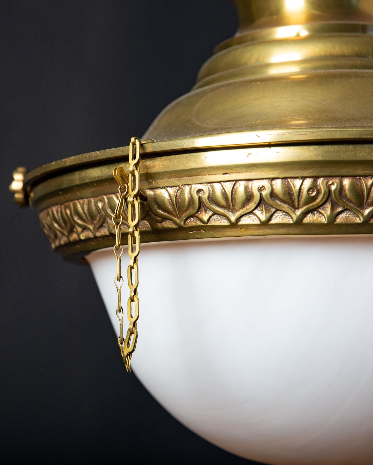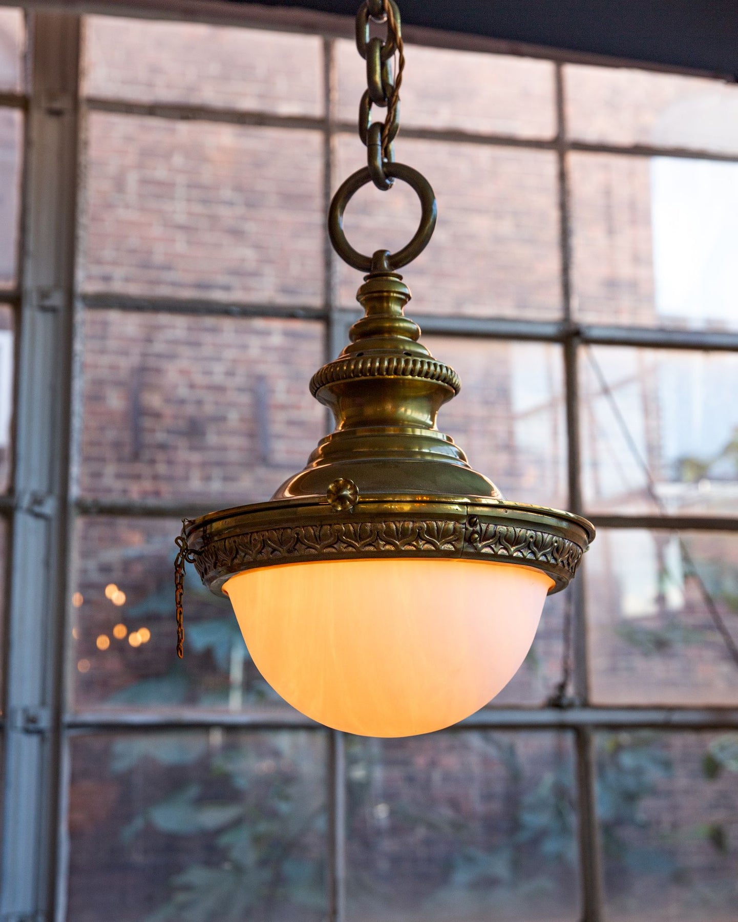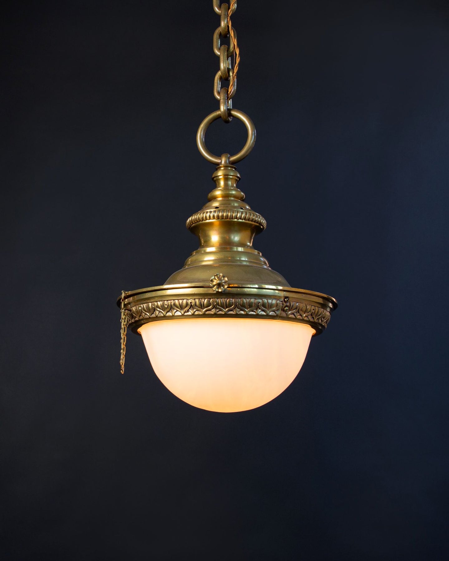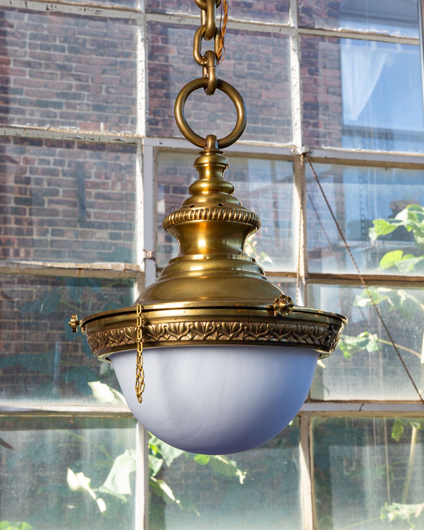 An antique pendant fixture made of cast and wrought brass, in its original age-darkened finish. The chain, canopy, and cast body are all of muscular proportions. The glass is a frosted slumped wispy white art glass, held in a hinged bezel with a handy stay chain. Titled "Railway Pendant" here since that's how I've seen them in the past, but such fixtures would have served in many civic or public institutional settings, like a courthouse, school, or bank. Due to the antique nature of this fixture, there may be some nicks or imperfections in the glass as well as variations from piece to piece.