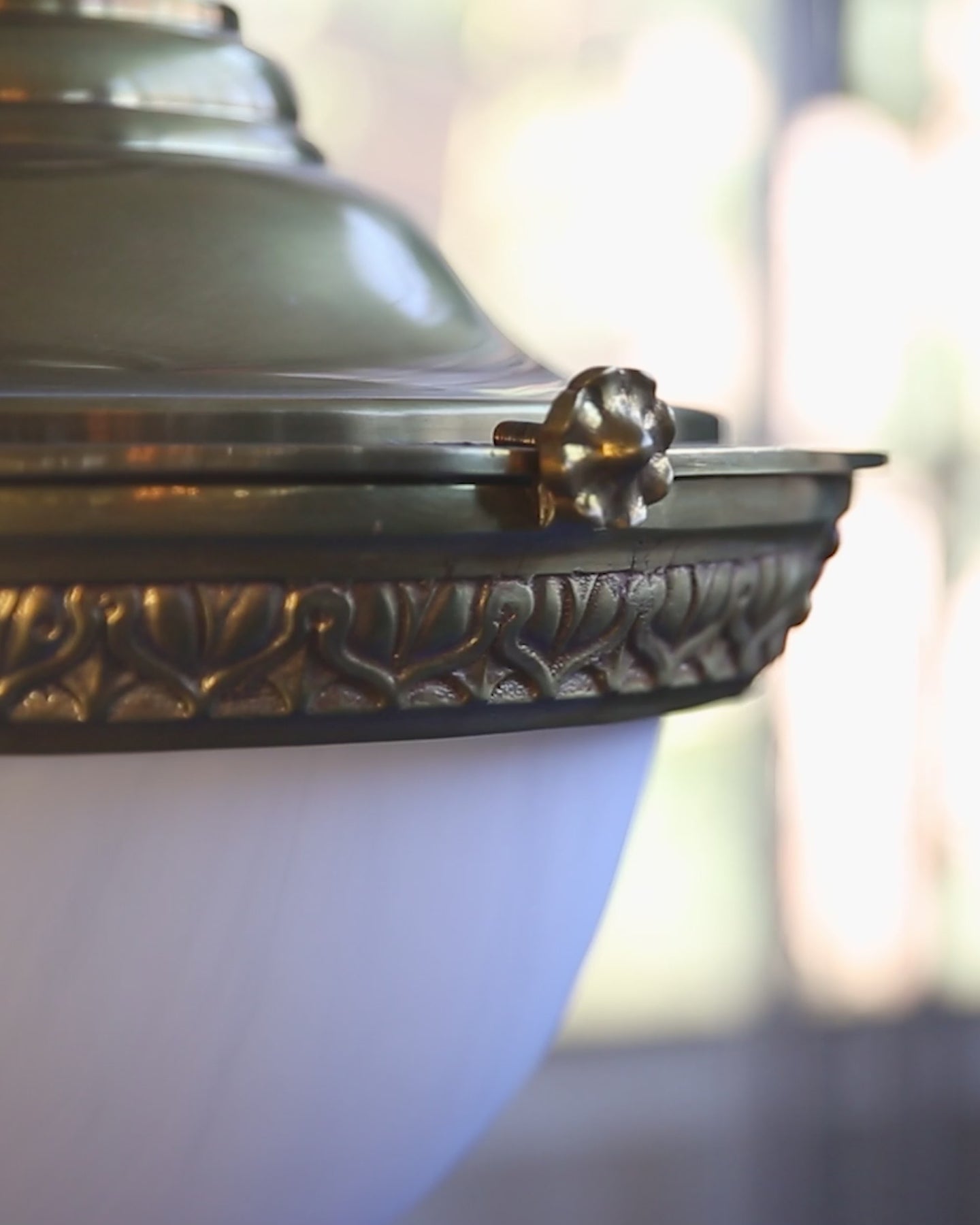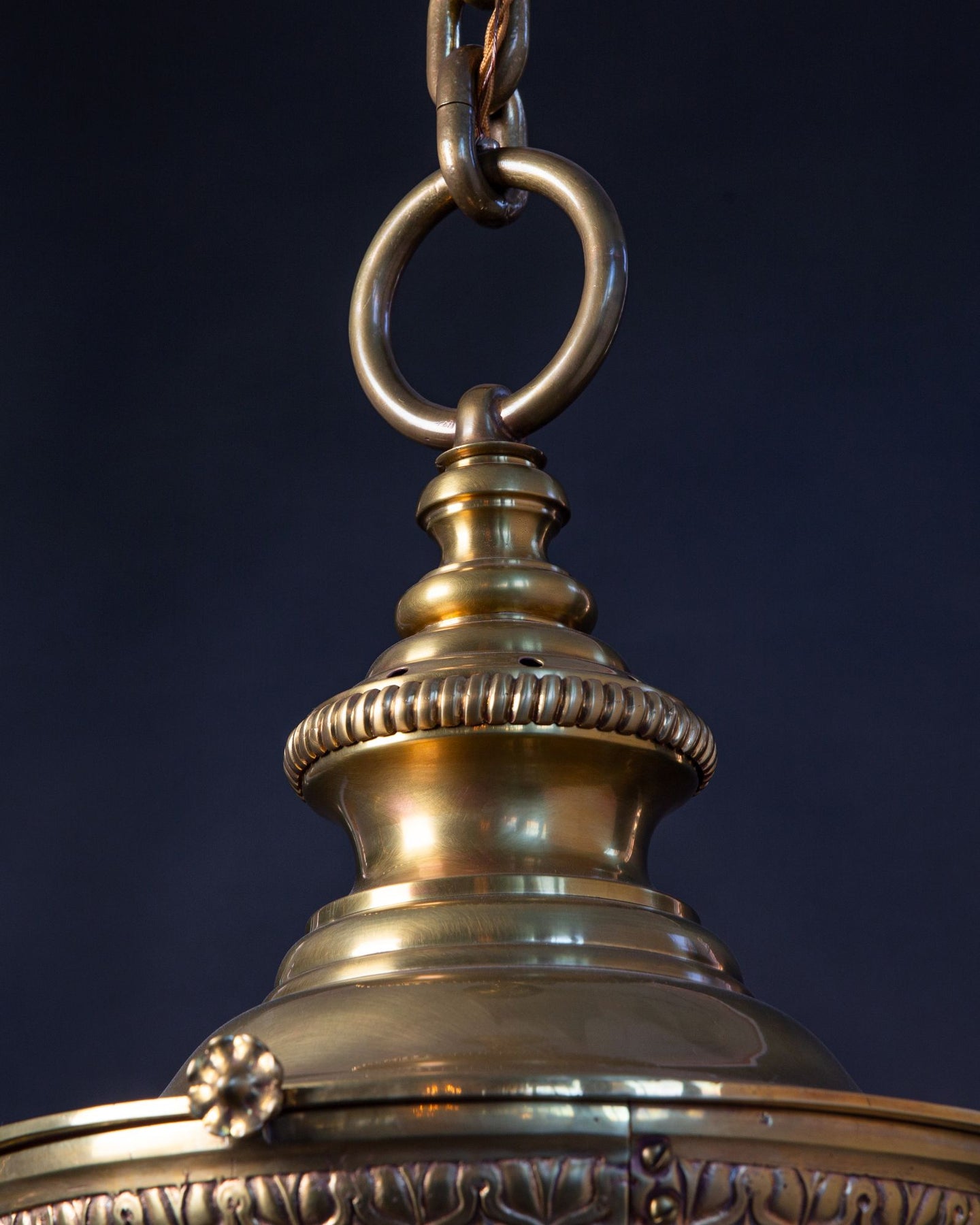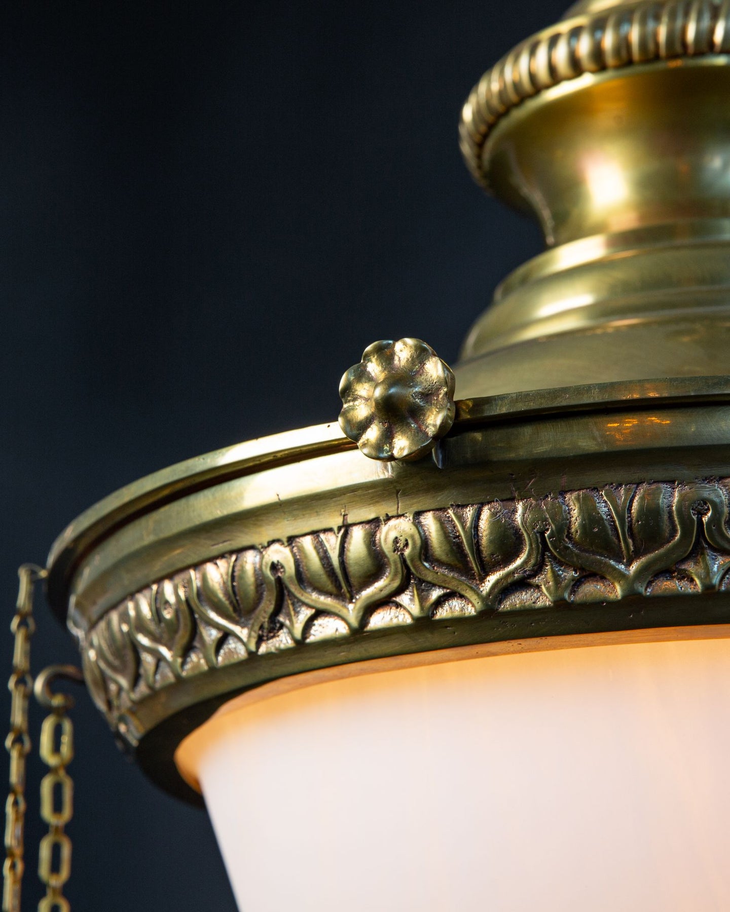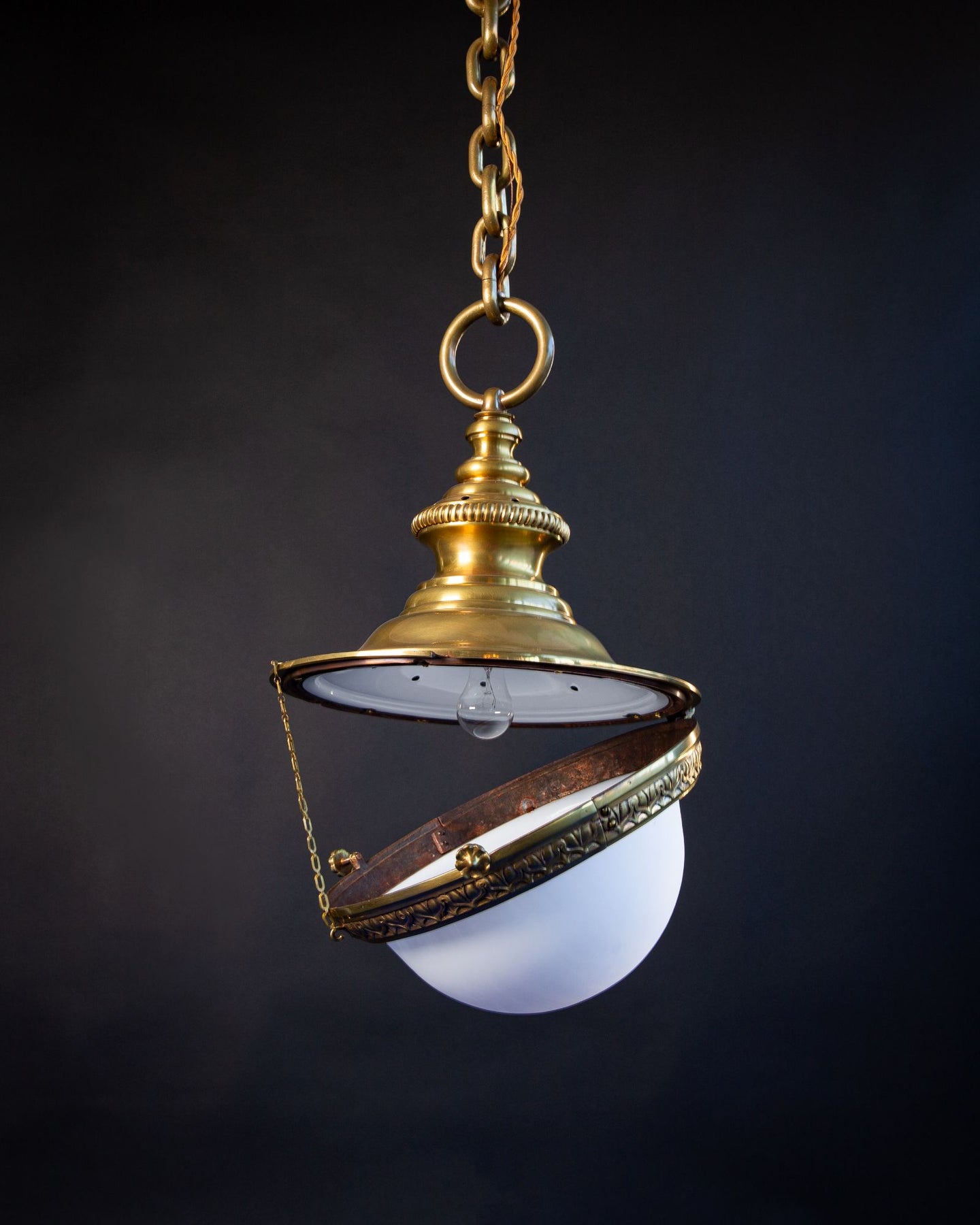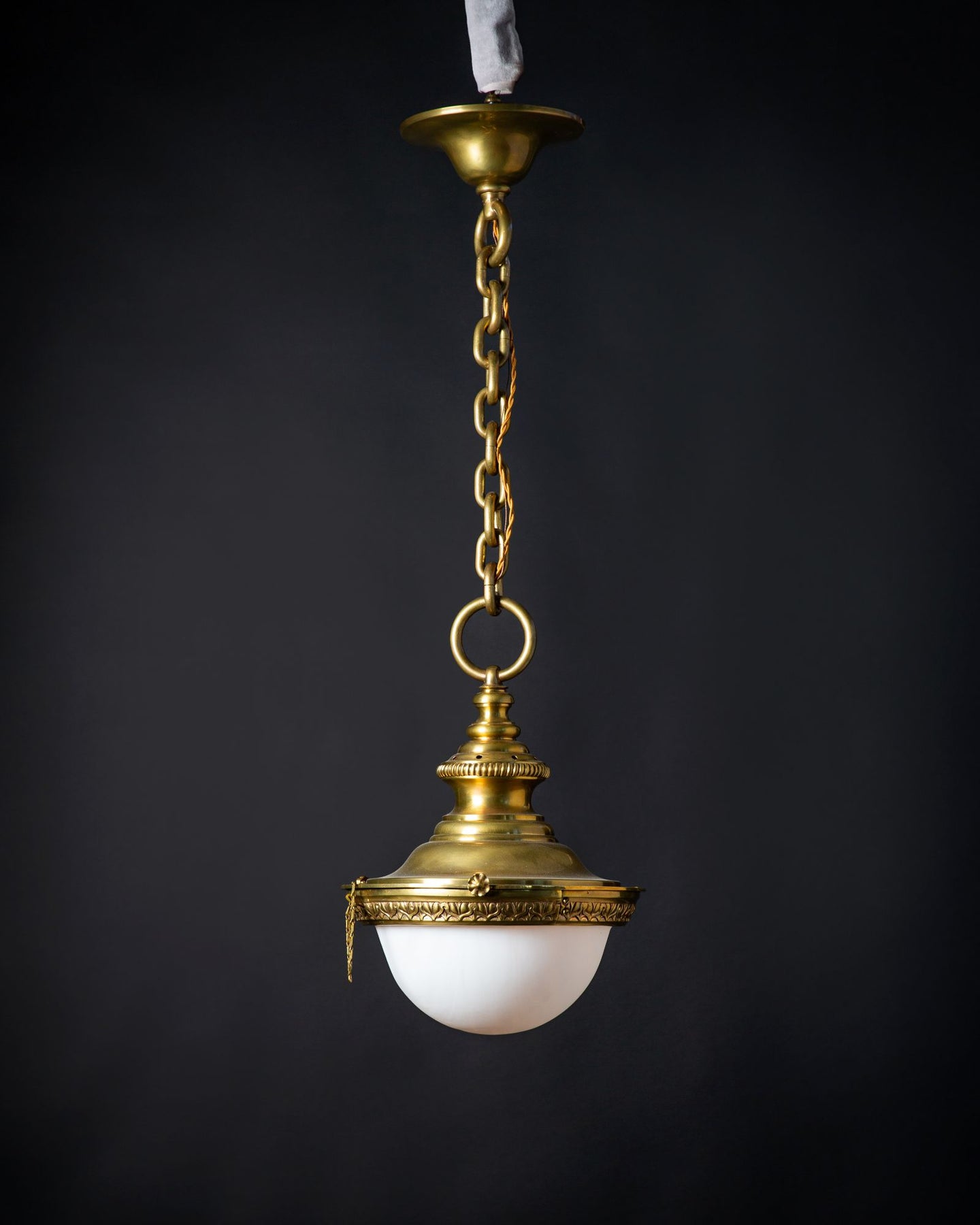 An antique pendant fixture made of cast and wrought brass, in its original age-darkened finish. The chain, canopy, and cast body are all of muscular proportions. The glass is a frosted slumped wispy white art glass, held in a hinged bezel with a handy stay chain. Titled "Railway Pendant" here since that's how I've seen them in the past, but such fixtures would have served in many civic or public institutional settings, like a courthouse, school, or bank. Due to the antique nature of this fixture, there may be some nicks or imperfections in the glass as well as variations from piece to piece.