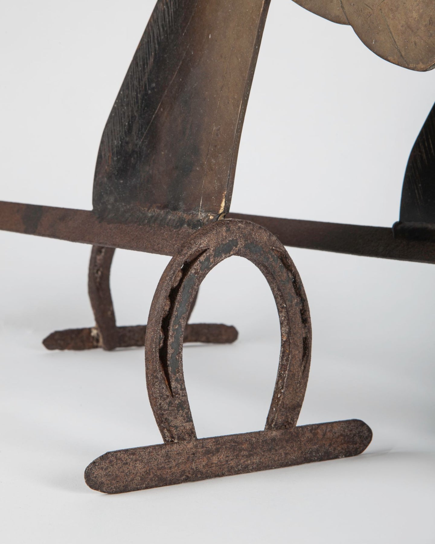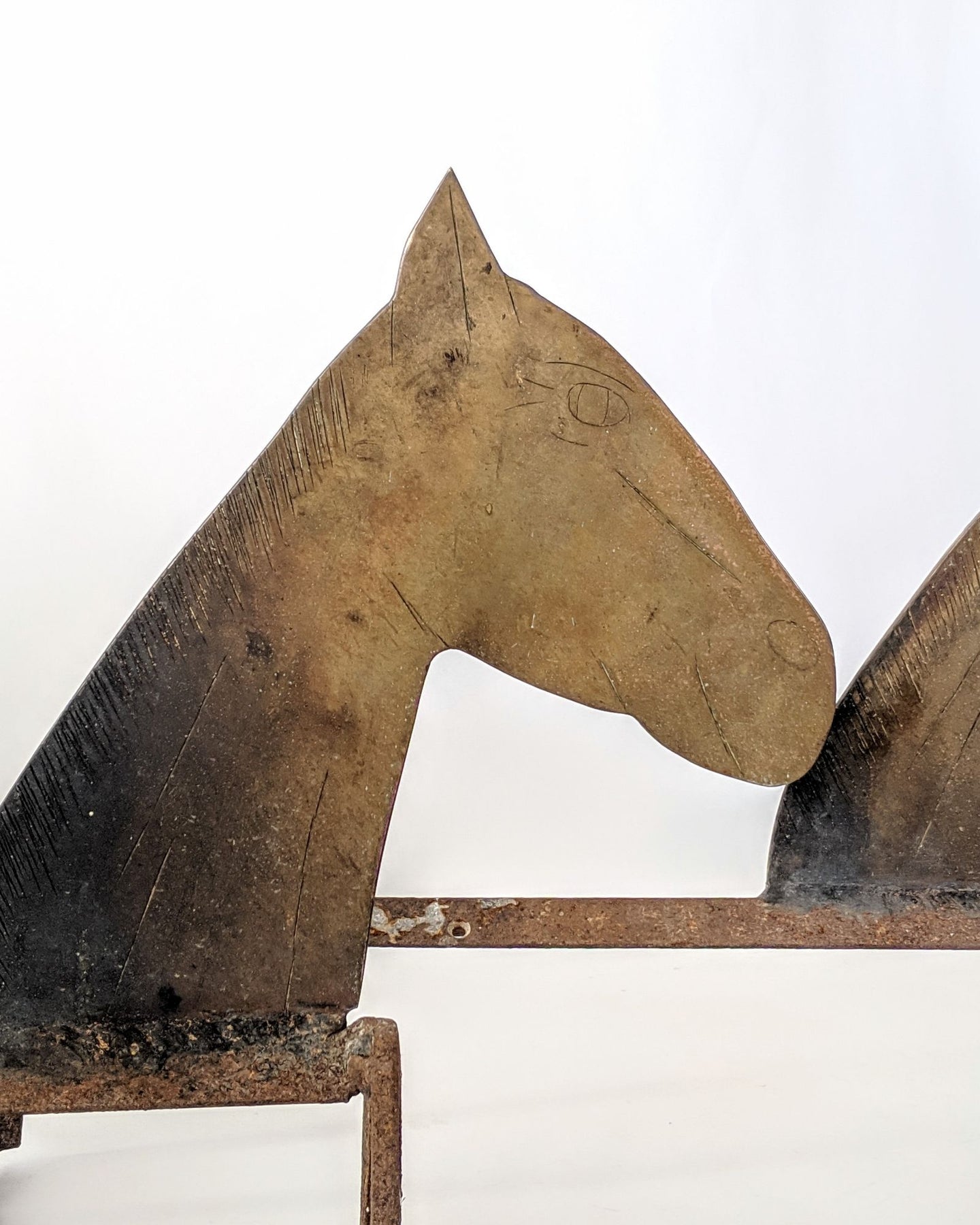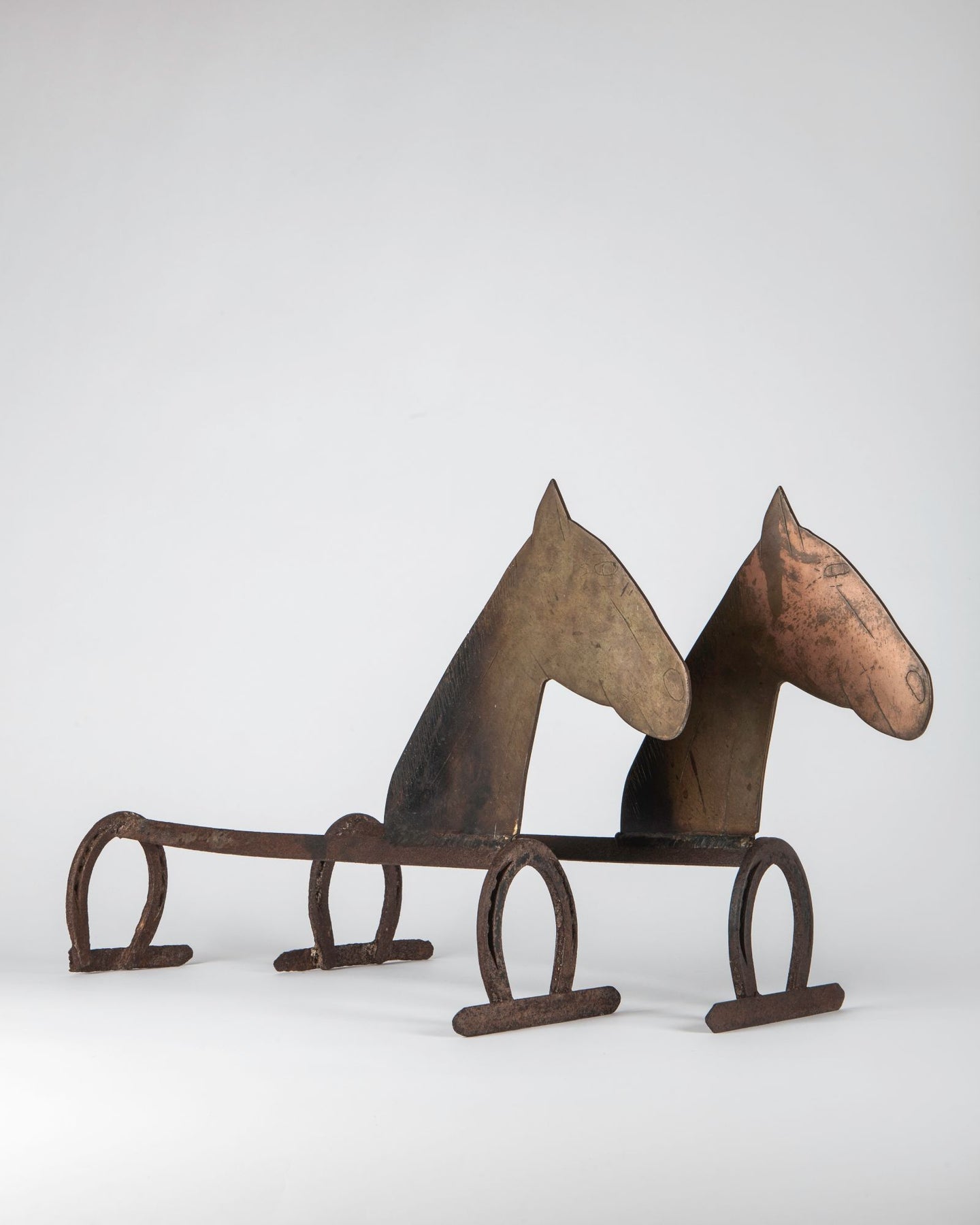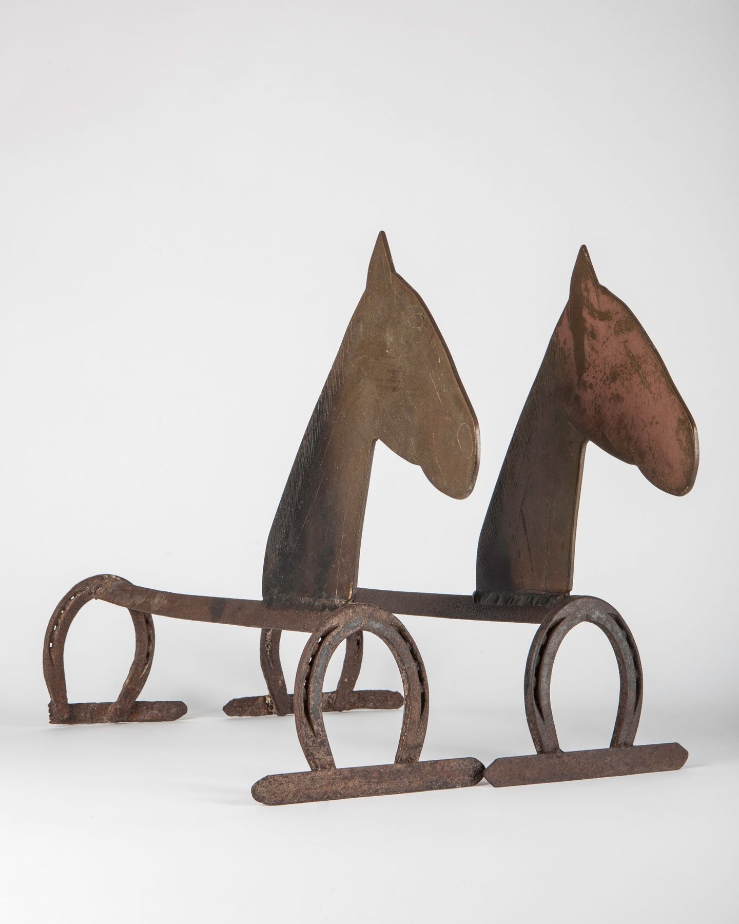 From the Remains Archive. A pair of folk art andirons with aged brass horse heads having hand engraved features, the legs flanked with old horseshoes. In their original aged rustic finish. Our Archive Collection consists of the best examples of previous custom projects & historic fixtures from our collection. They are made available as inspiration for recreation or inclusion in custom projects.