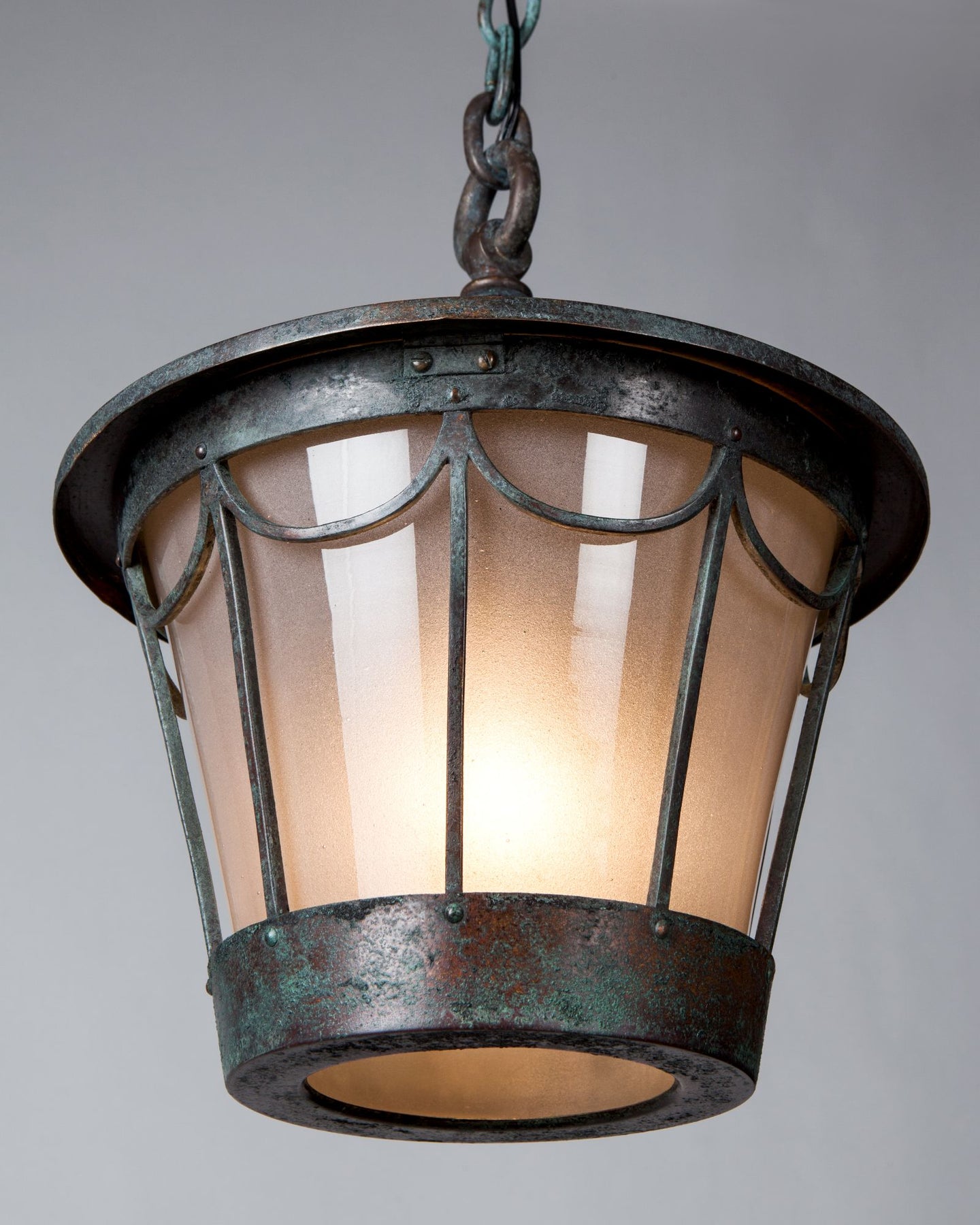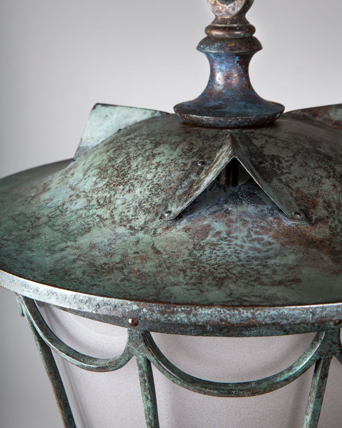 From the Remains Archive. An antique tapered round lantern with a frosted hand blown etched glass shade. In its original verdigris finish. Our Archive Collection consists of the best examples of previous custom projects & historic fixtures from our collection. They are made available as inspiration for recreation or inclusion in custom projects.