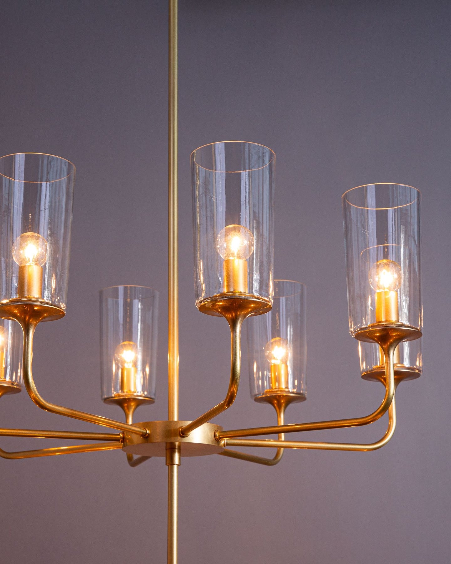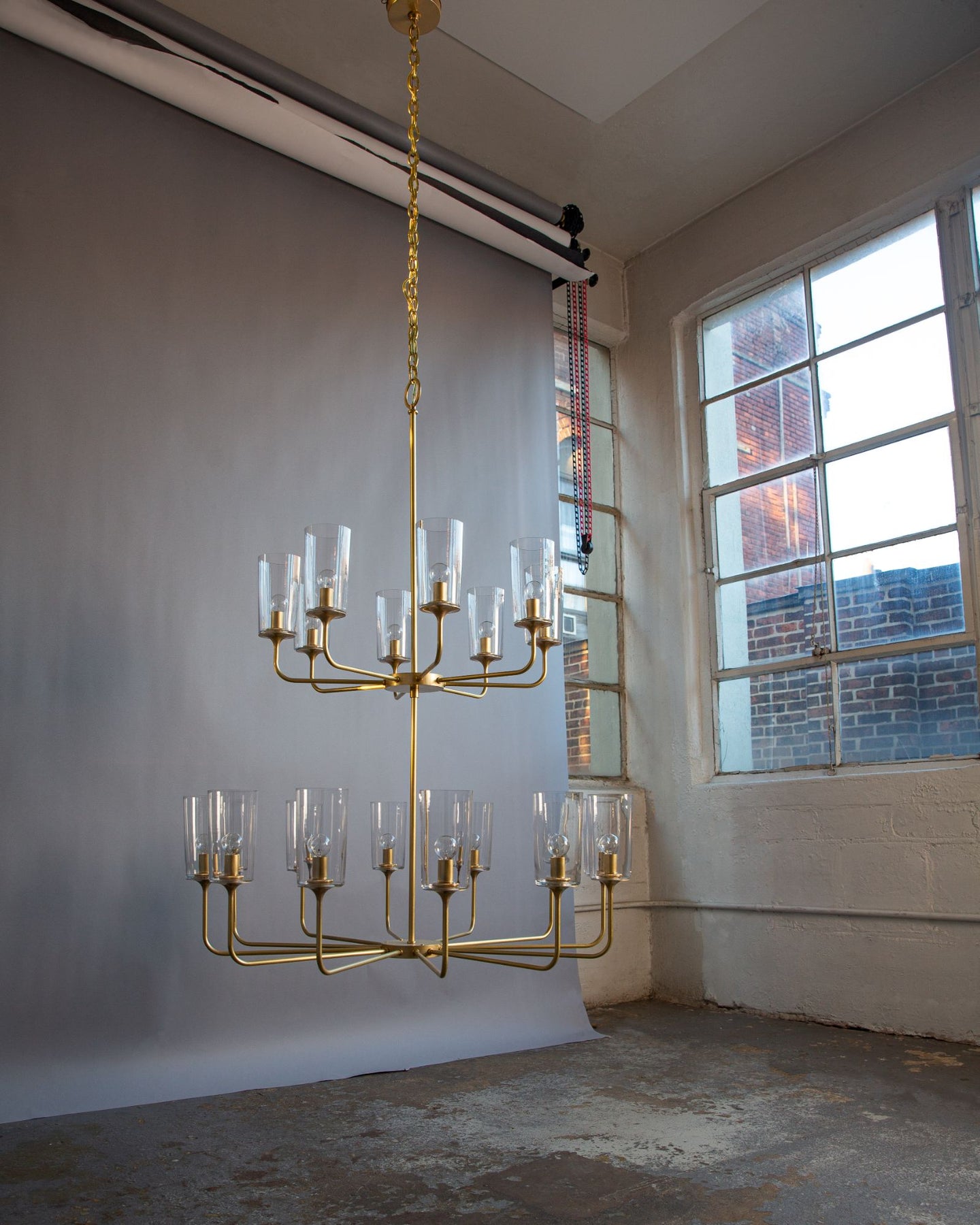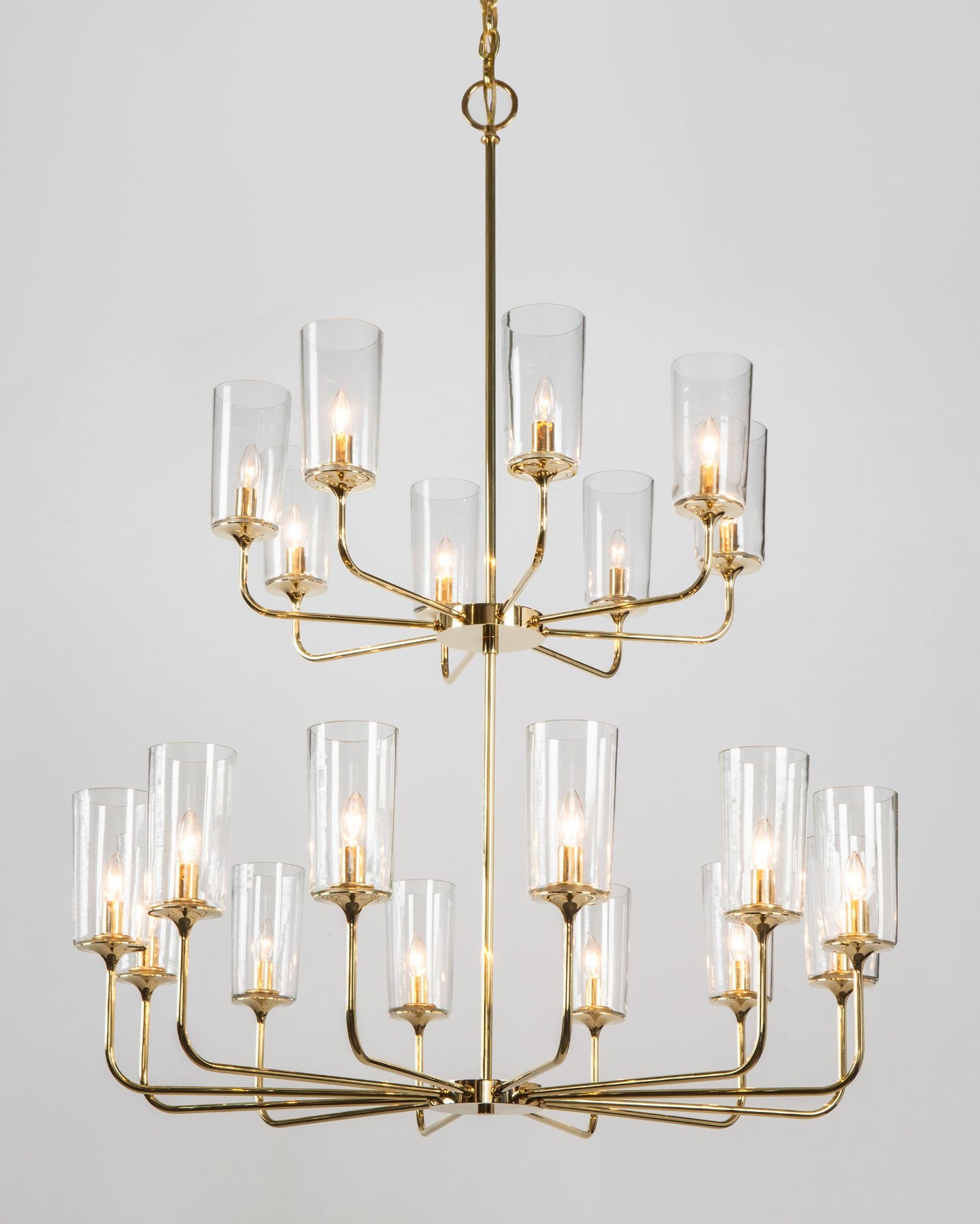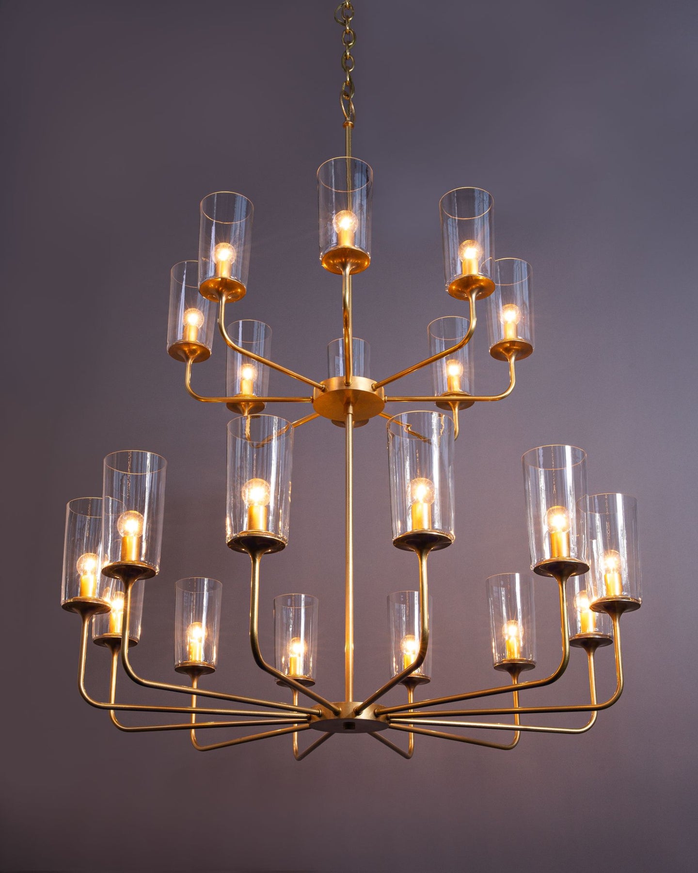 A solid brass eight-over-twelve-light two tier chandelier in the French Moderne style with sleek flared arms radiating from a lozenge cluster. The delicate body is suspended from a slender rod and a length of chain, depending on overall height.