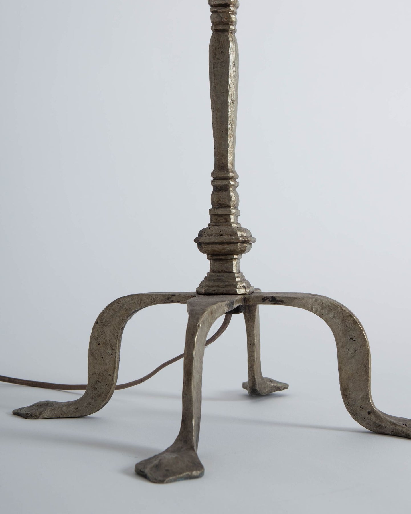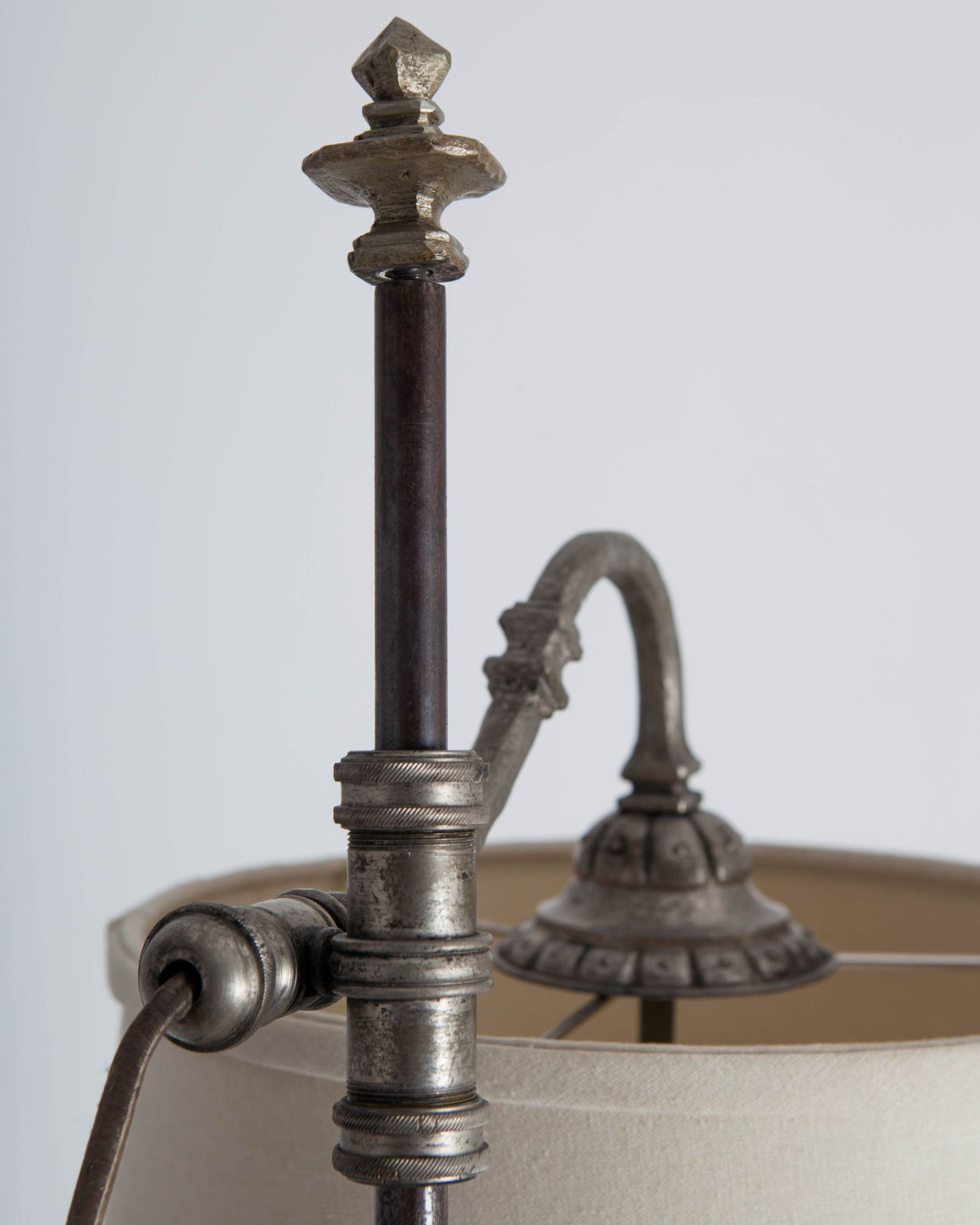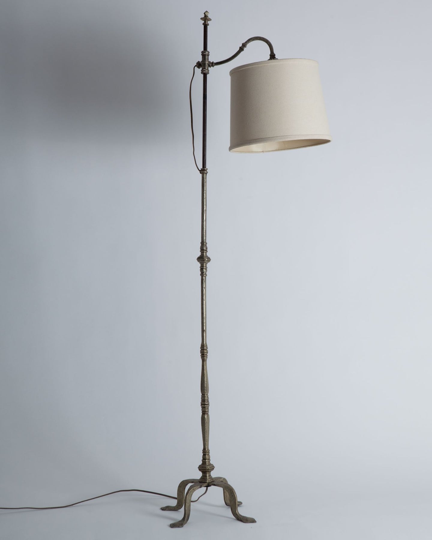 From the Remains Archive. An antique bridge arm floor lamp in its original aged nickel over bronze finish. The rustic surface of the standard contrasts with the crisp adjustment mechanism of the bridge-arm. Attributed to the New York maker Sterling Bronze Co. Shade not included. Our Archive Collection consists of the best examples of previous custom projects & historic fixtures from our collection. They are made available as inspiration for recreation or inclusion in custom projects.