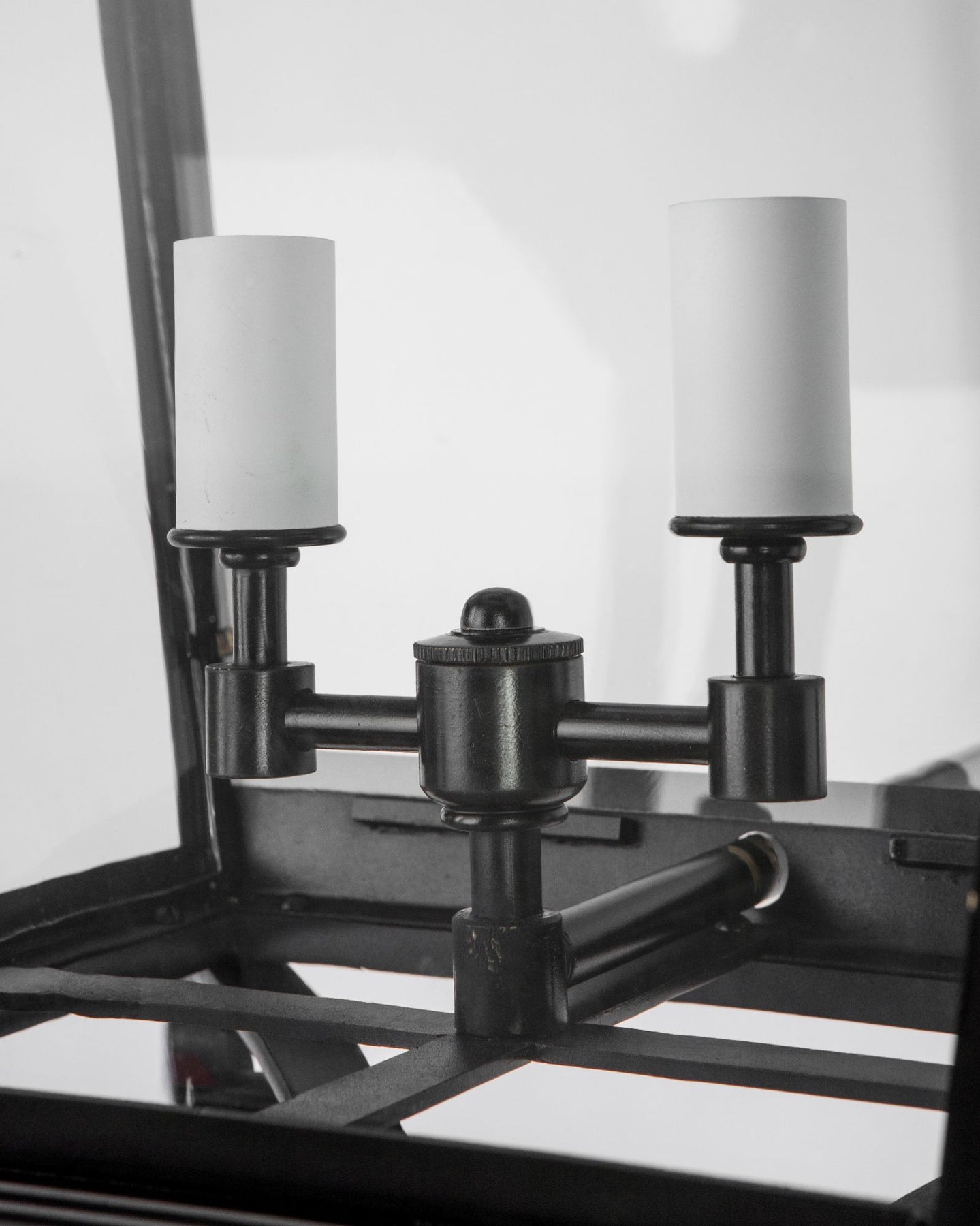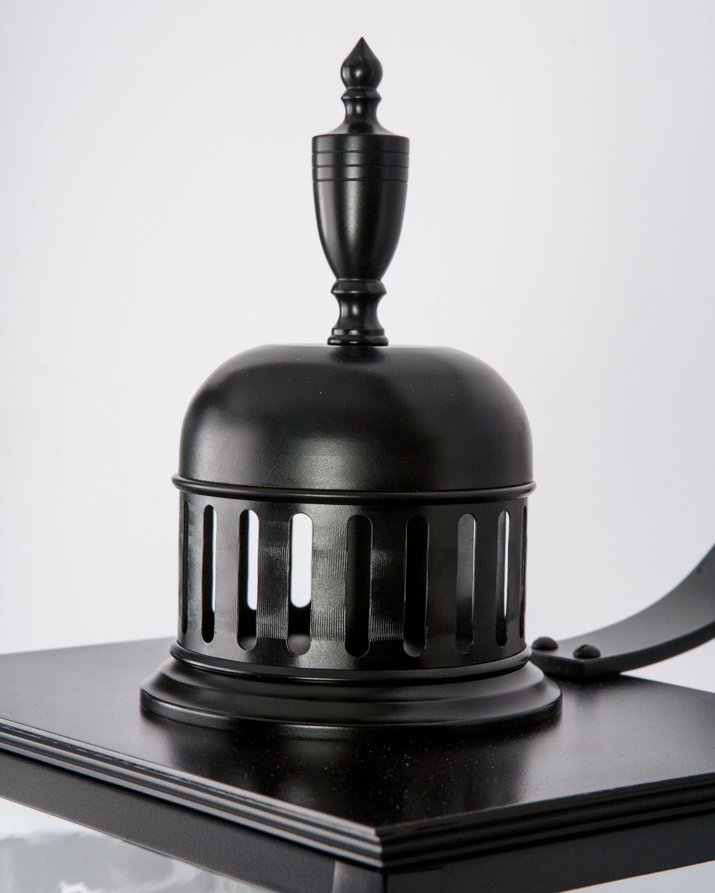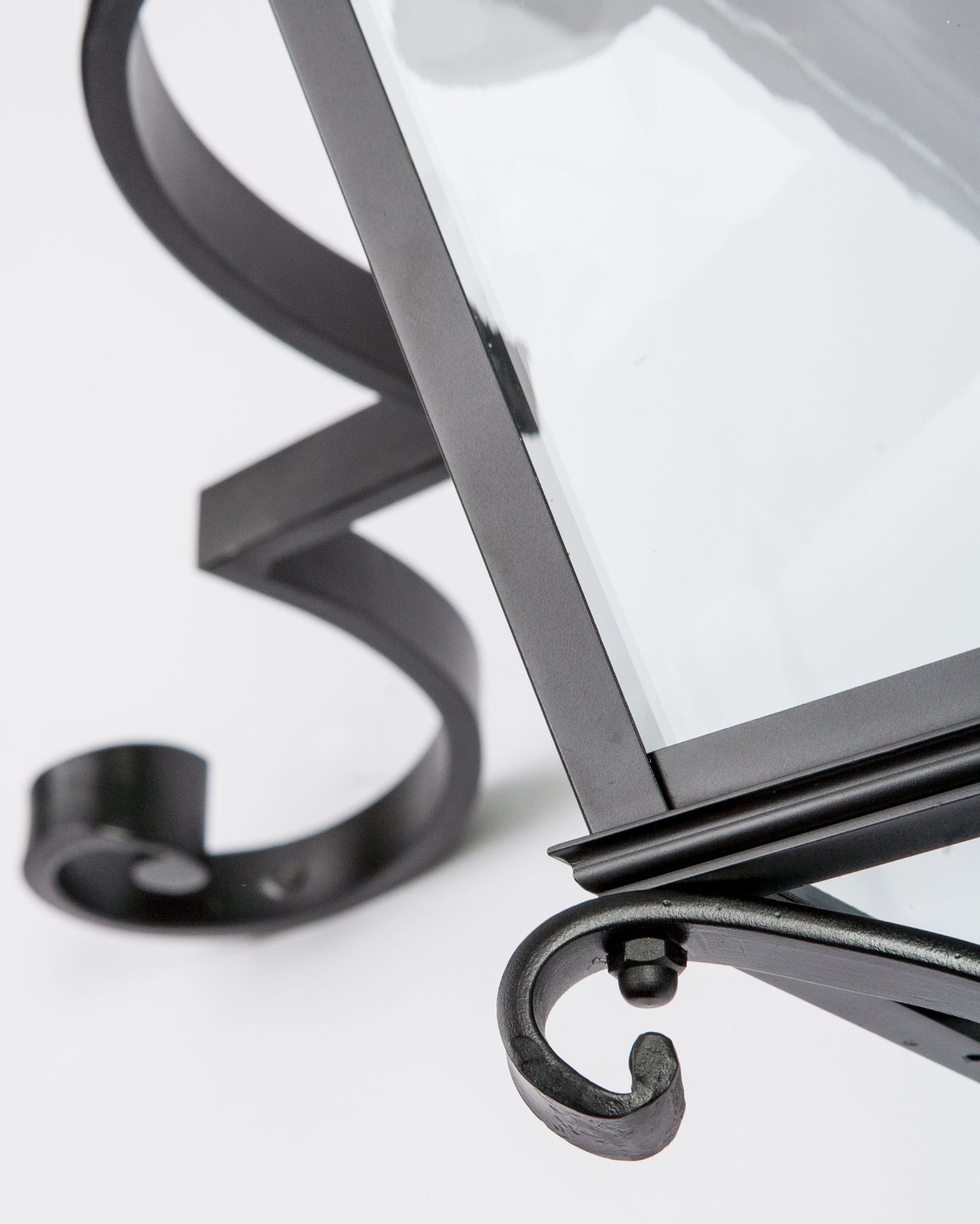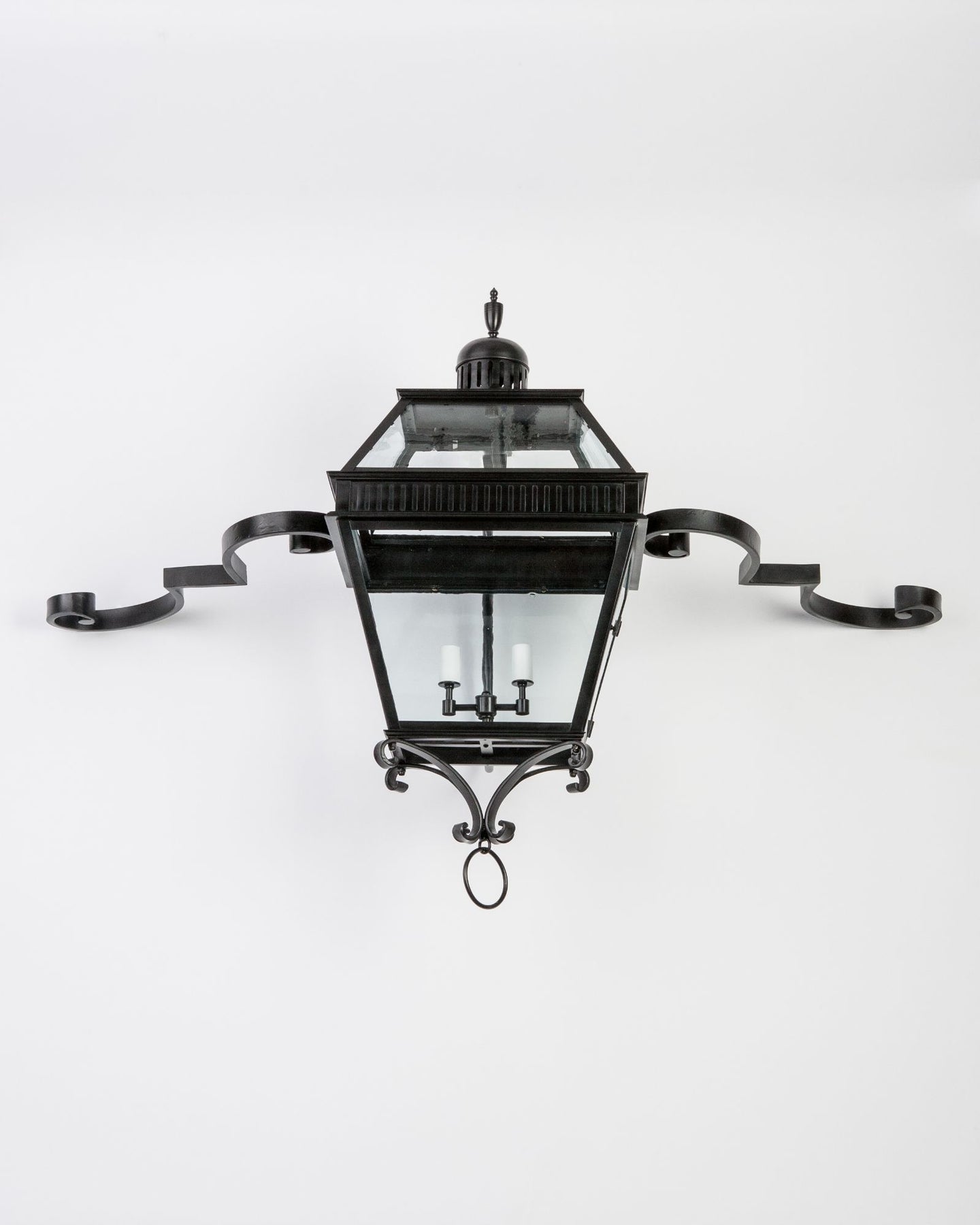 From the Remains Archive. A traditional wall lantern with "mustache" brackets in wrought bronze in a blackened finish and glazed with clear restoration glass. Commissioned for a New York residence. Our Archive Collection consists of the best examples of previous custom projects & historic fixtures from our collection. They are made available as inspiration for recreation or inclusion in custom projects.