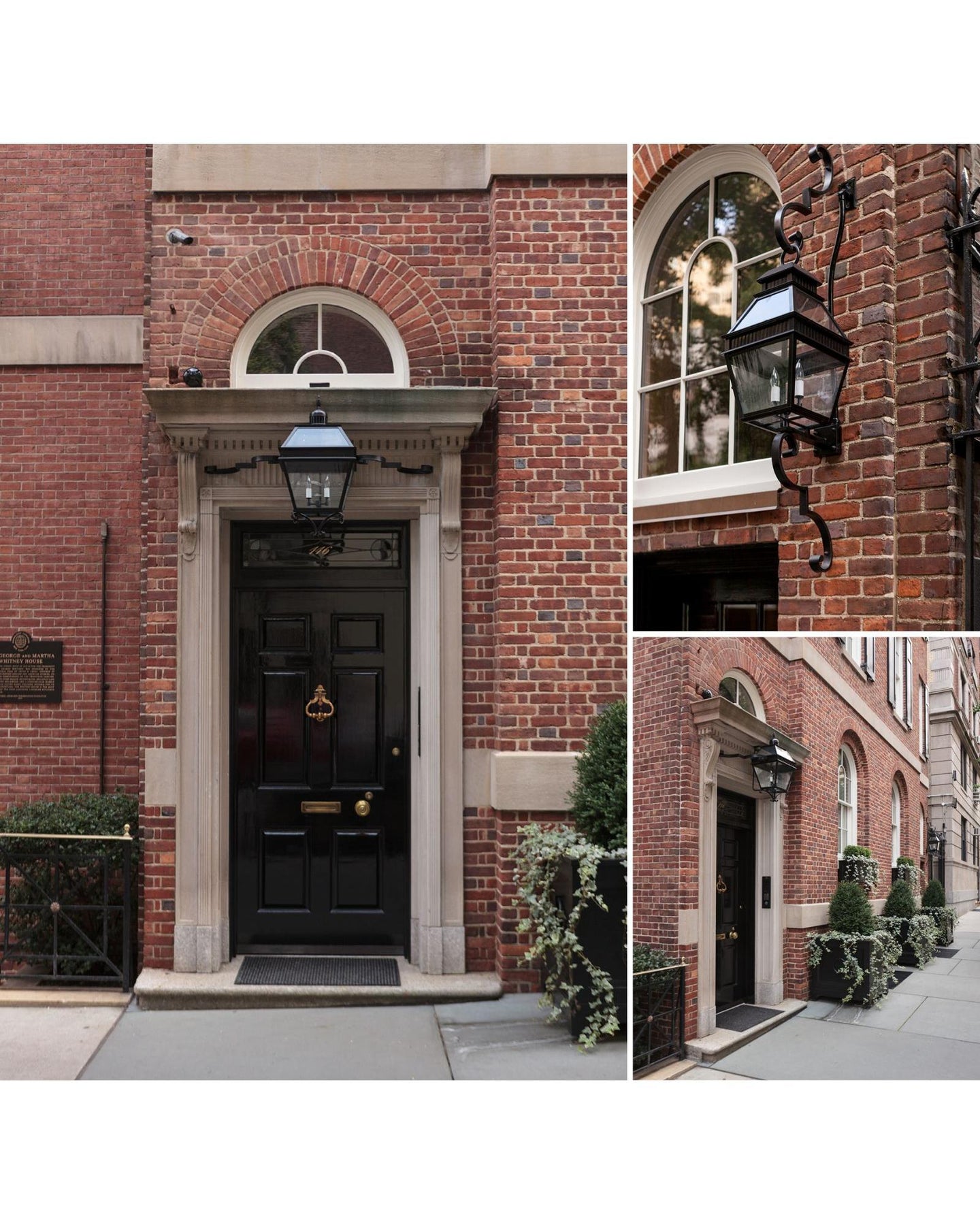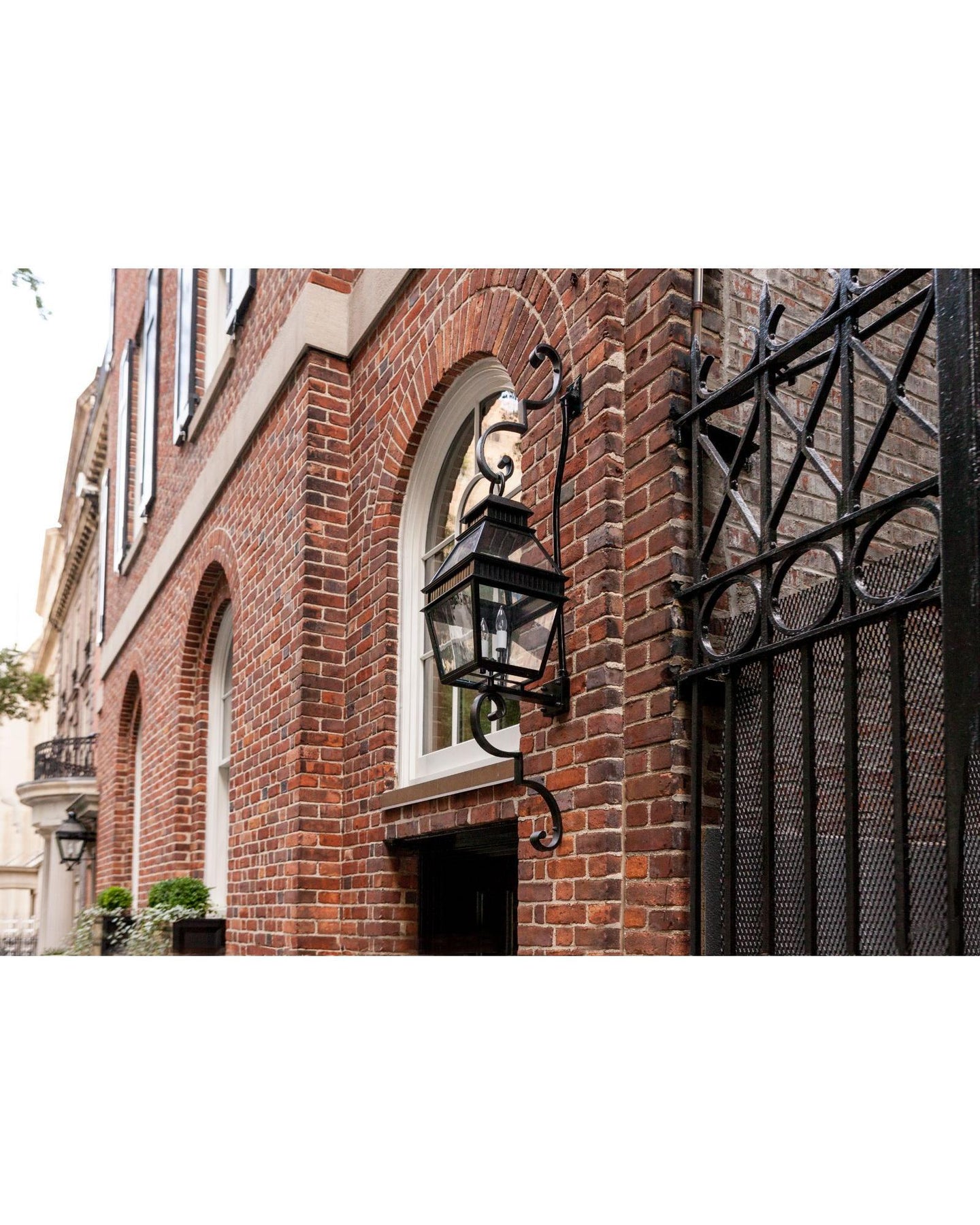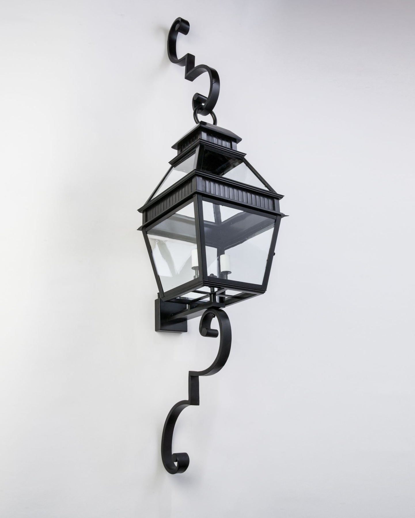 From the Remains Archive. A traditional service entry lantern with broken-S scroll brackets in wrought bronze in a blackened finish and glazed with clear restoration glass. Commissioned for a New York residence. Our Archive Collection consists of the best examples of previous custom projects & historic fixtures from our collection. They are made available as inspiration for recreation or inclusion in custom projects.