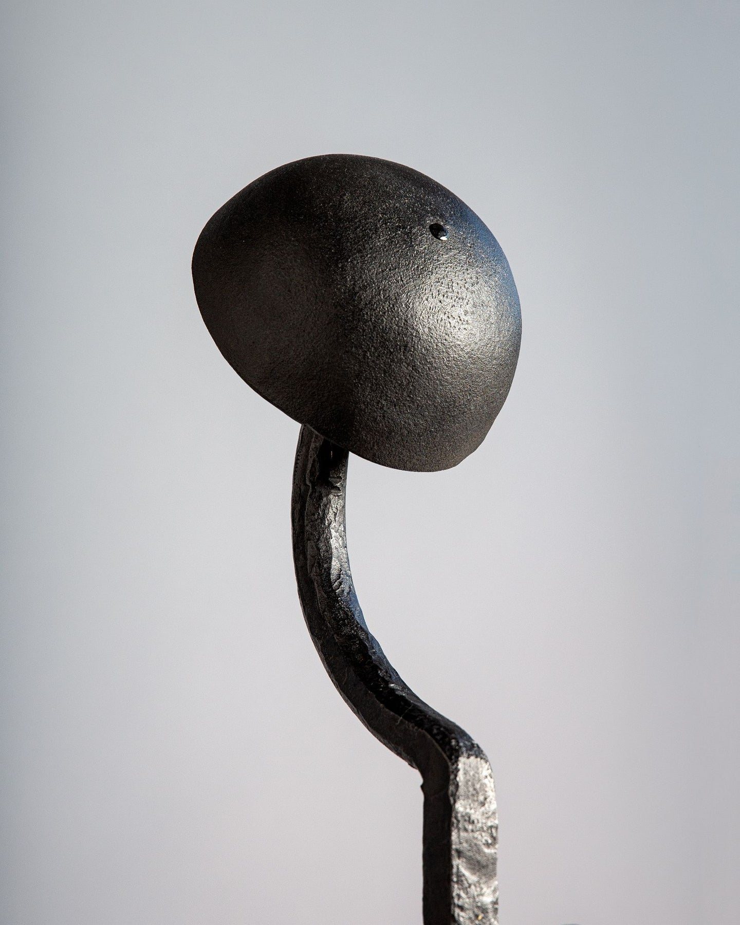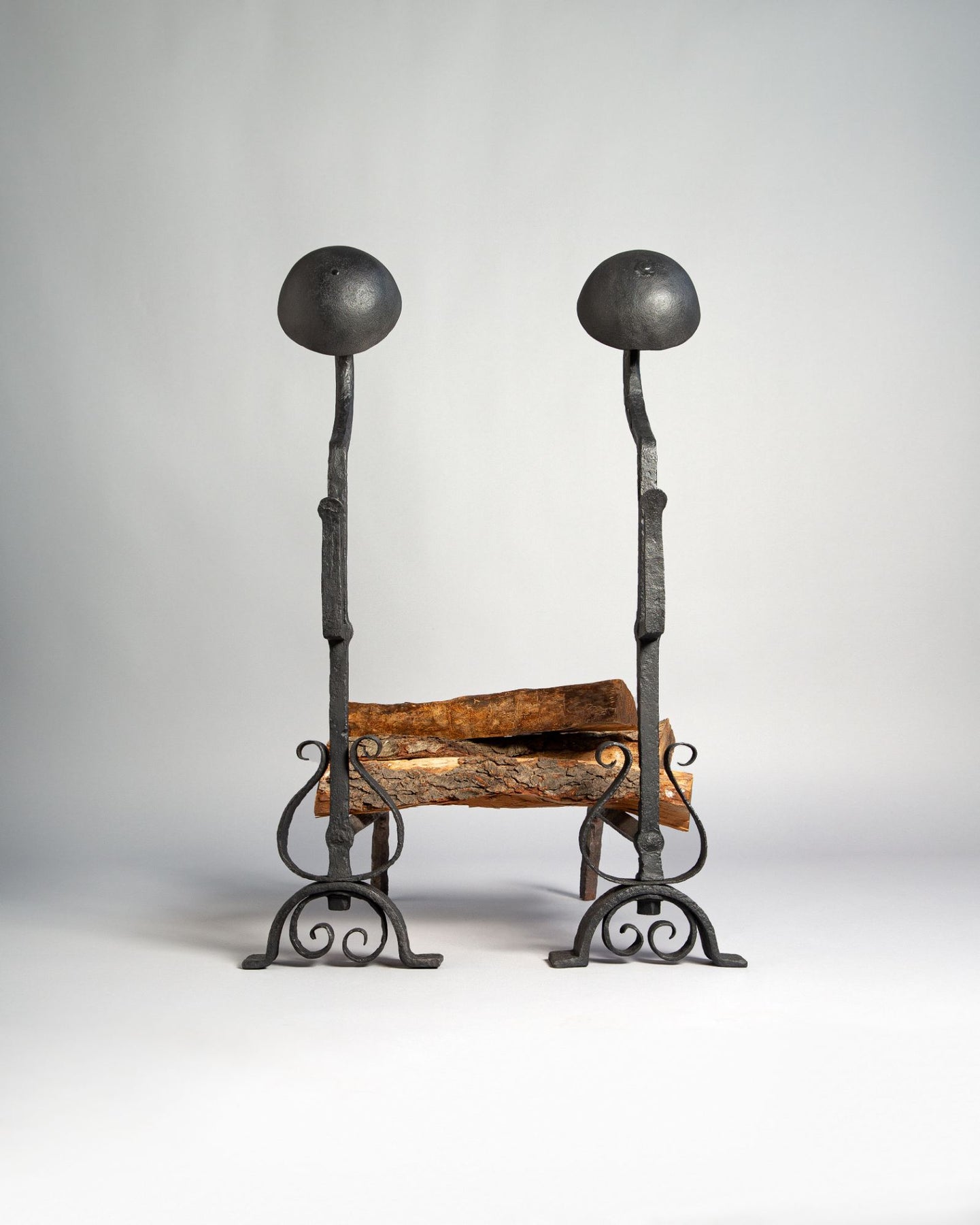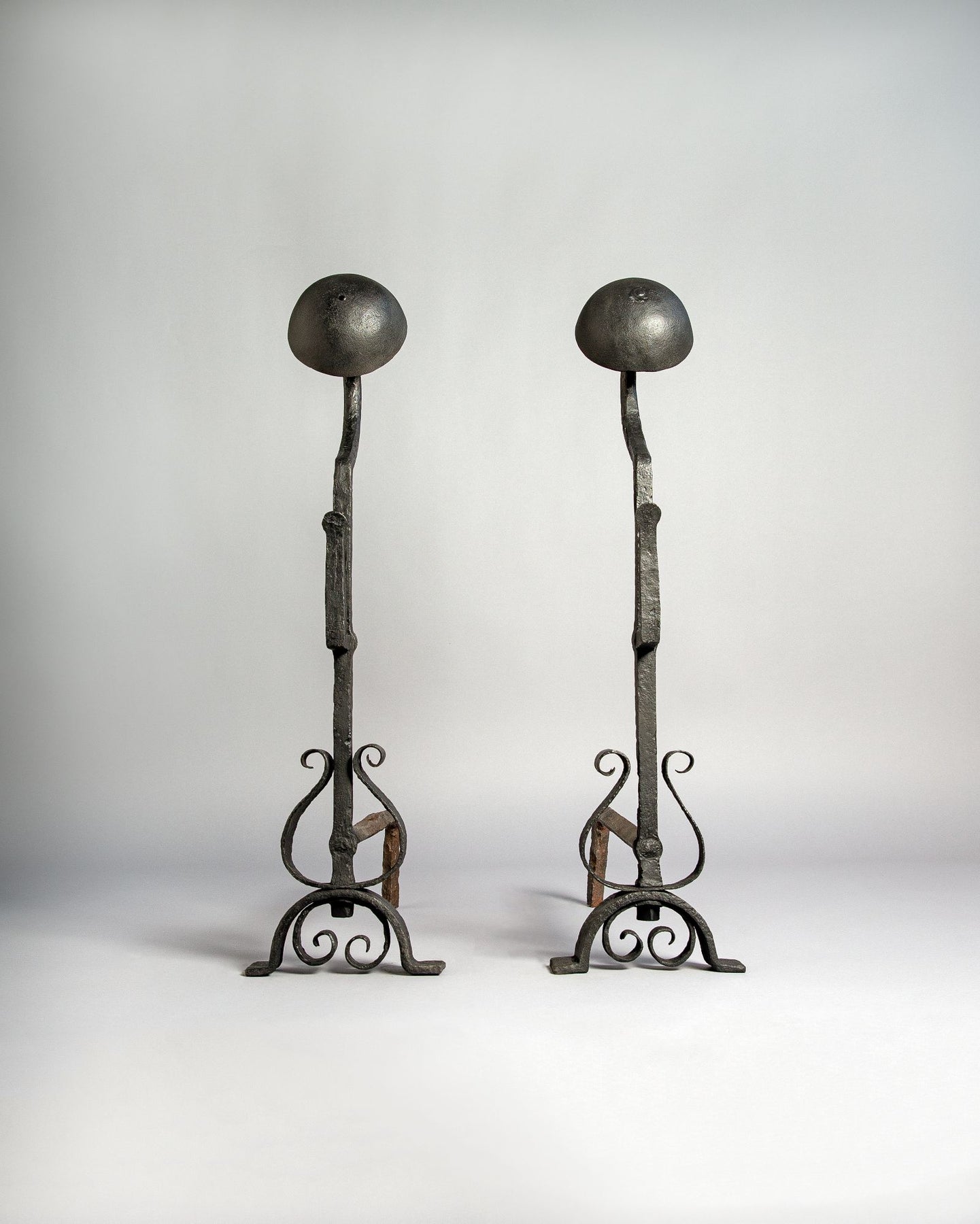 A pair of tall vintage wrought iron andirons with bell finials over scrolled bases.