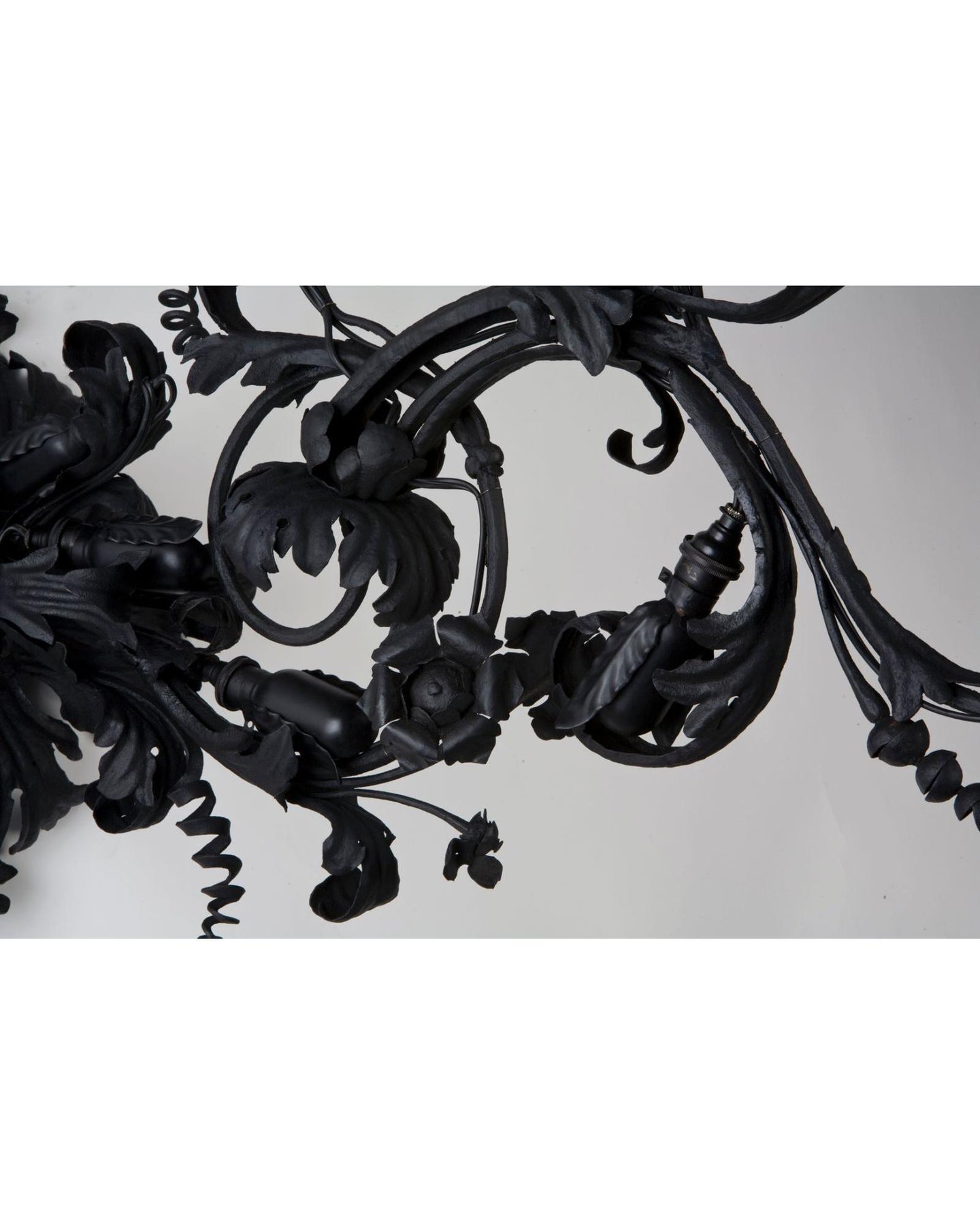 From the Remains Archive. A seven light blackened wrought iron single sconce. Having a row of candelabra extending from the main tendril as well as hidden sockets in the foliate work. Our Archive Collection consists of the best examples of previous custom projects & historic fixtures from our collection. They are made available as inspiration for recreation or inclusion in custom projects.